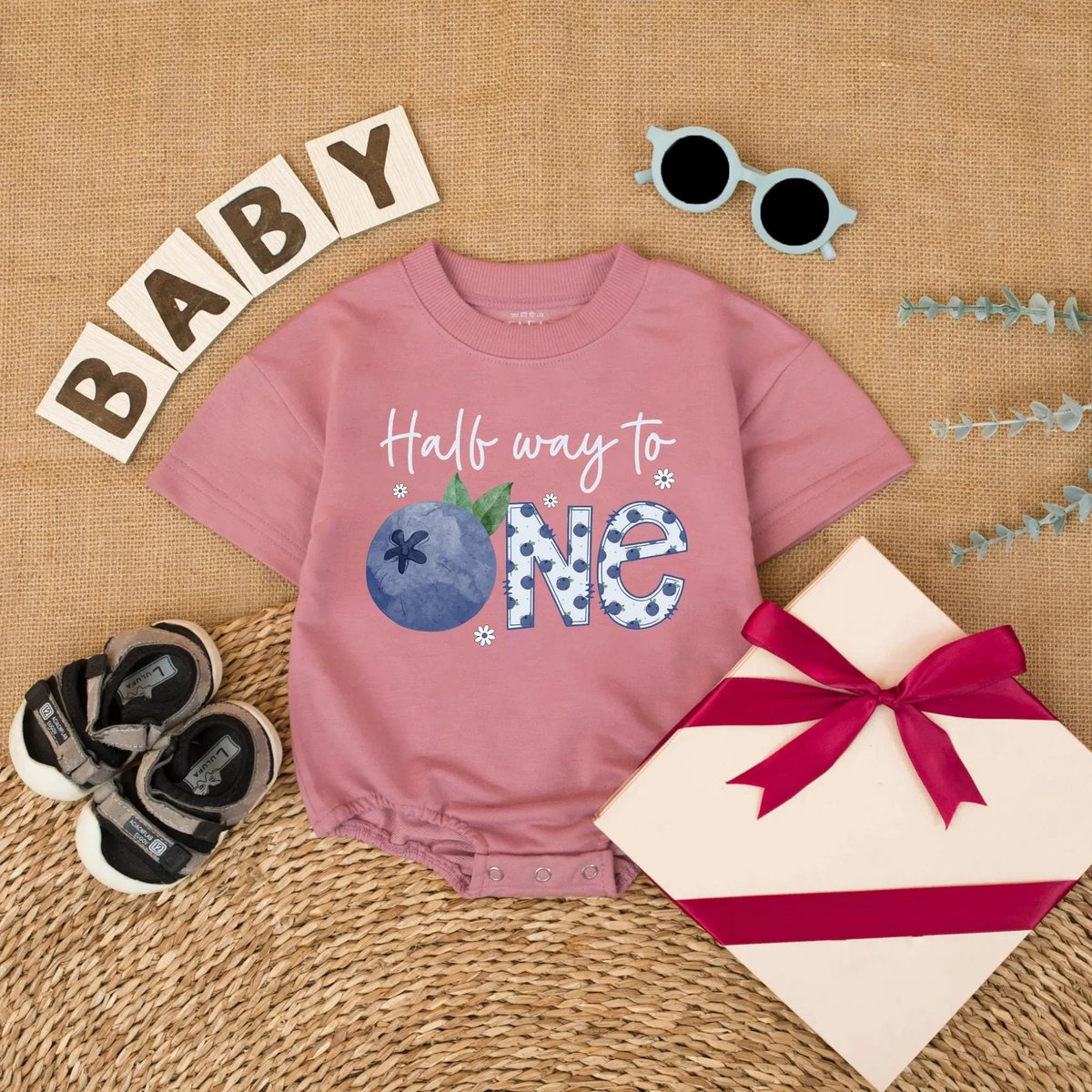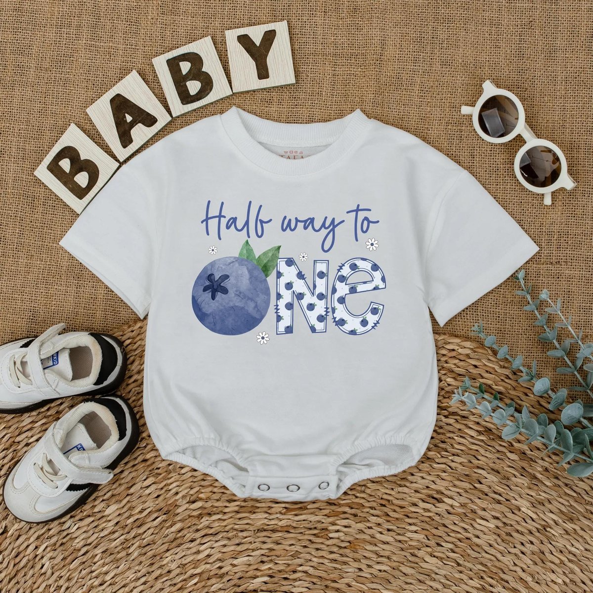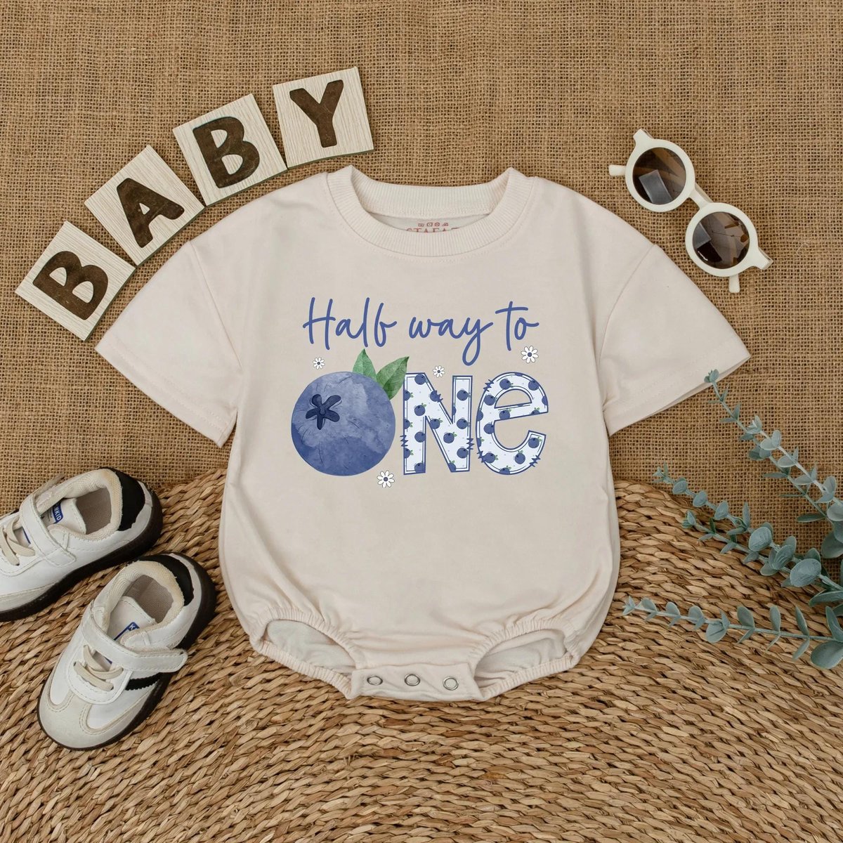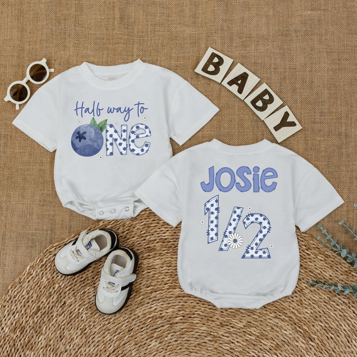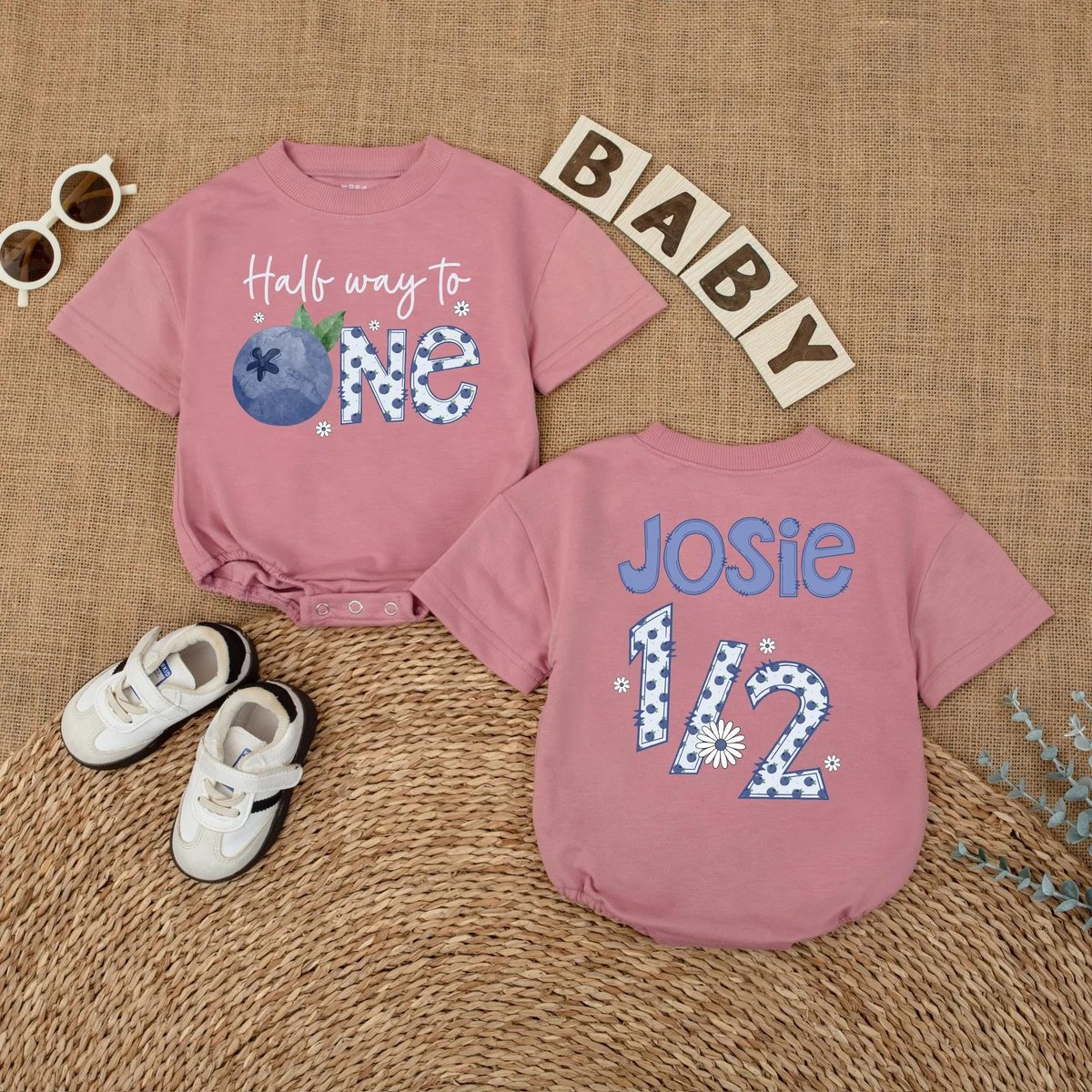 Personalized Blueberry Half Way to One Romper 6 Months Baby Girl Outfit 12 Birthday Baby Bodysuit Ba 433