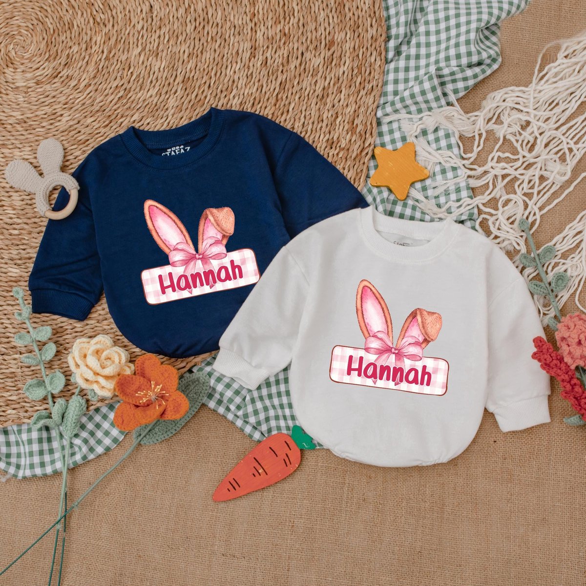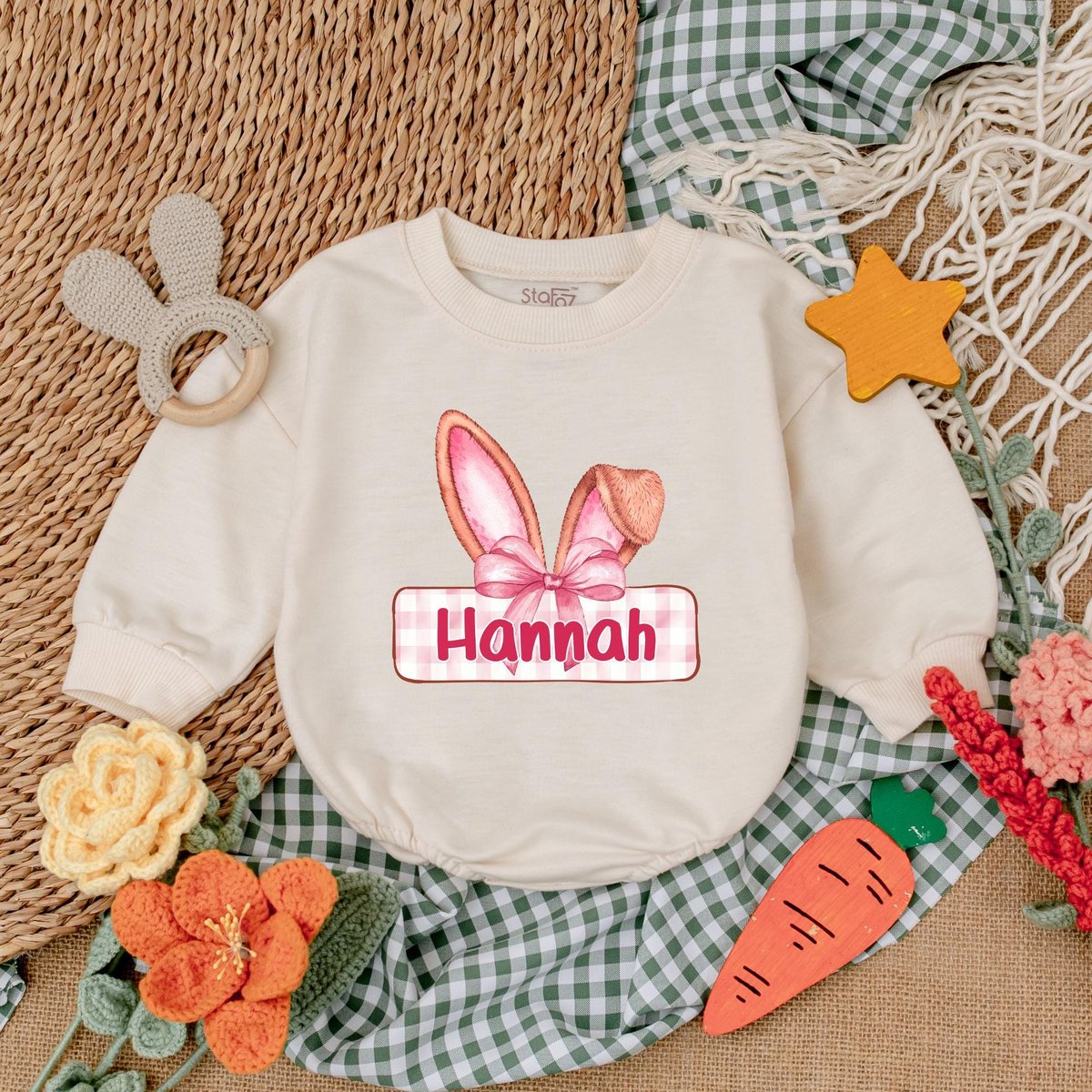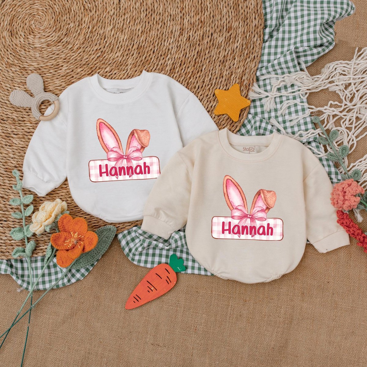 Personalized Bunny Ears with Pink Bow Romper Cute Easter Bunny Bodysuit Easter Day Baby Gift My Firs 182