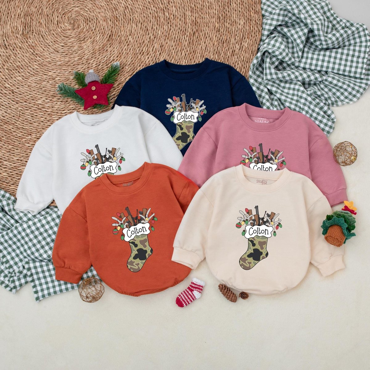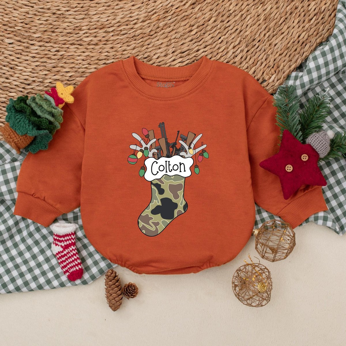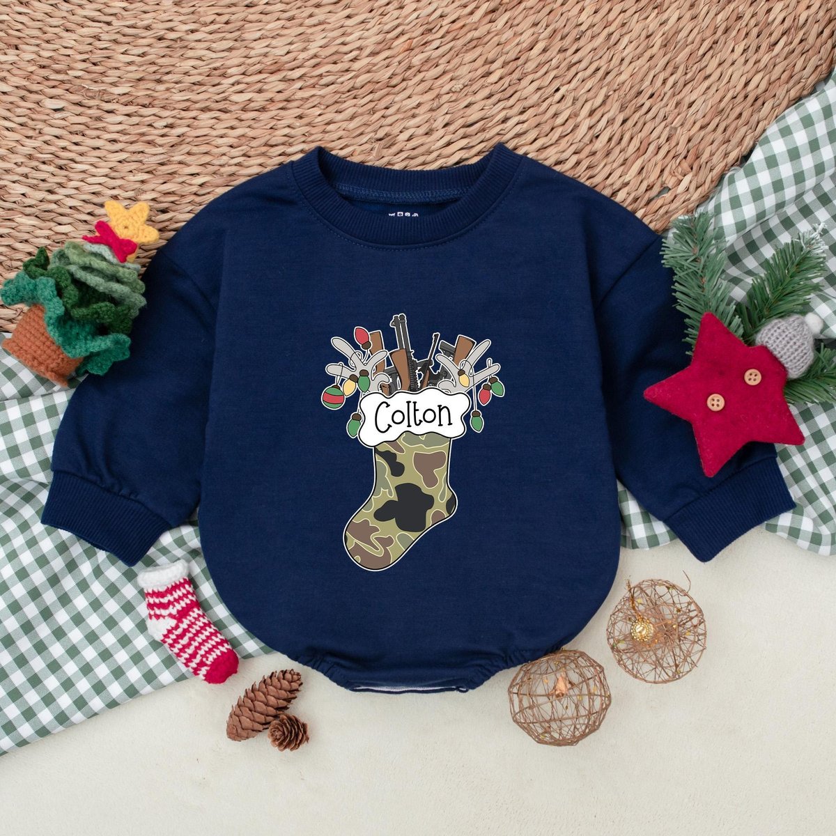 Personalized Camo Christmas Stocking Romper Hunting Christmas Bodysuit Baby Boy Christmas Outfit Win 180