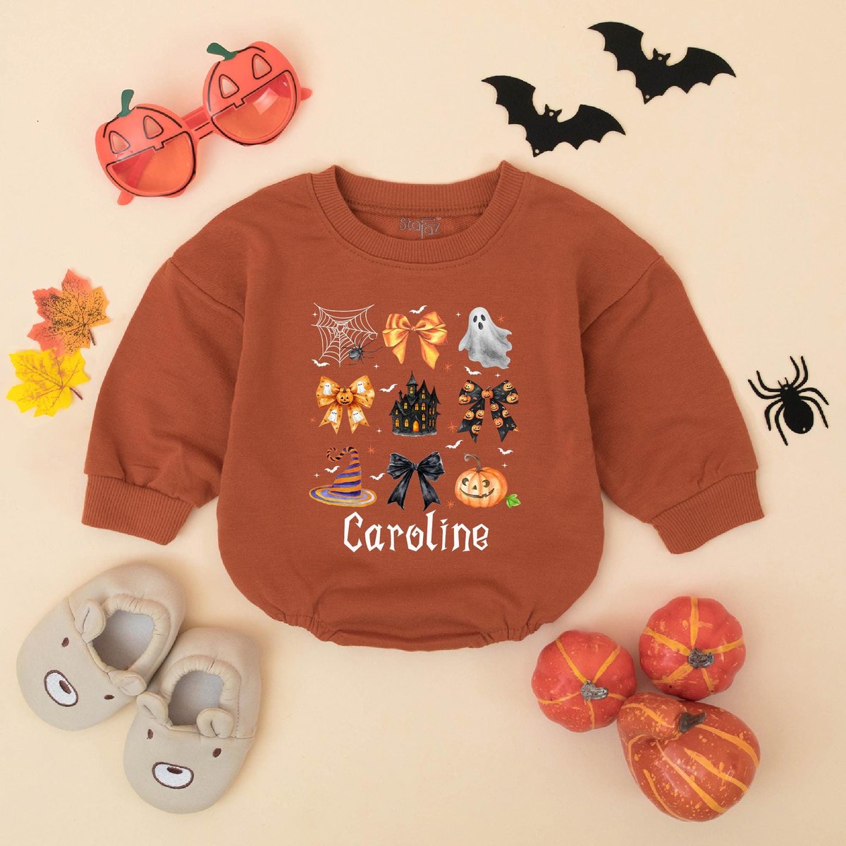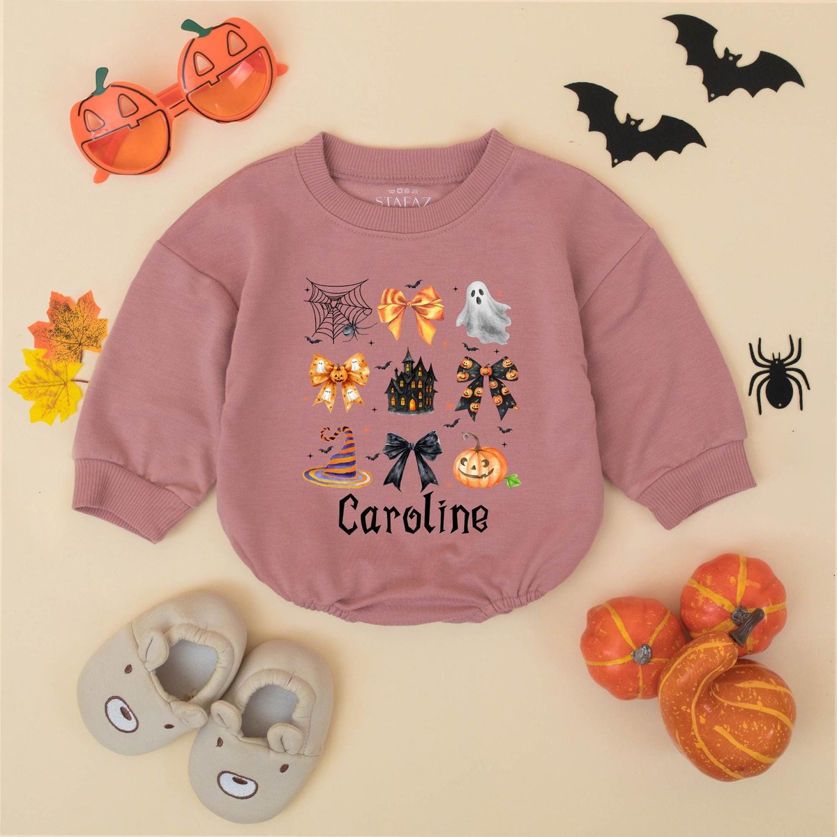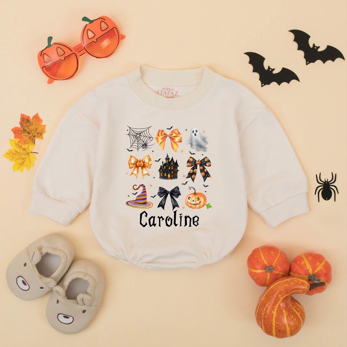 Personalized Halloween Bow Romper for Girls Cute Spooky Season Baby Bodysuit Fall Sweatshirt for Kid 434