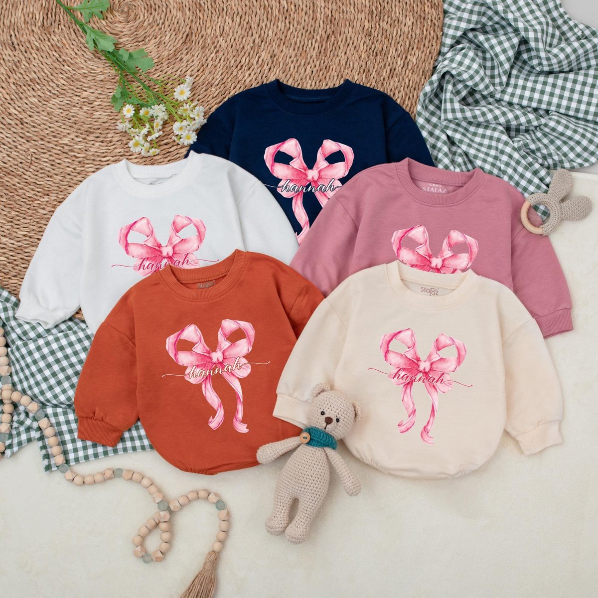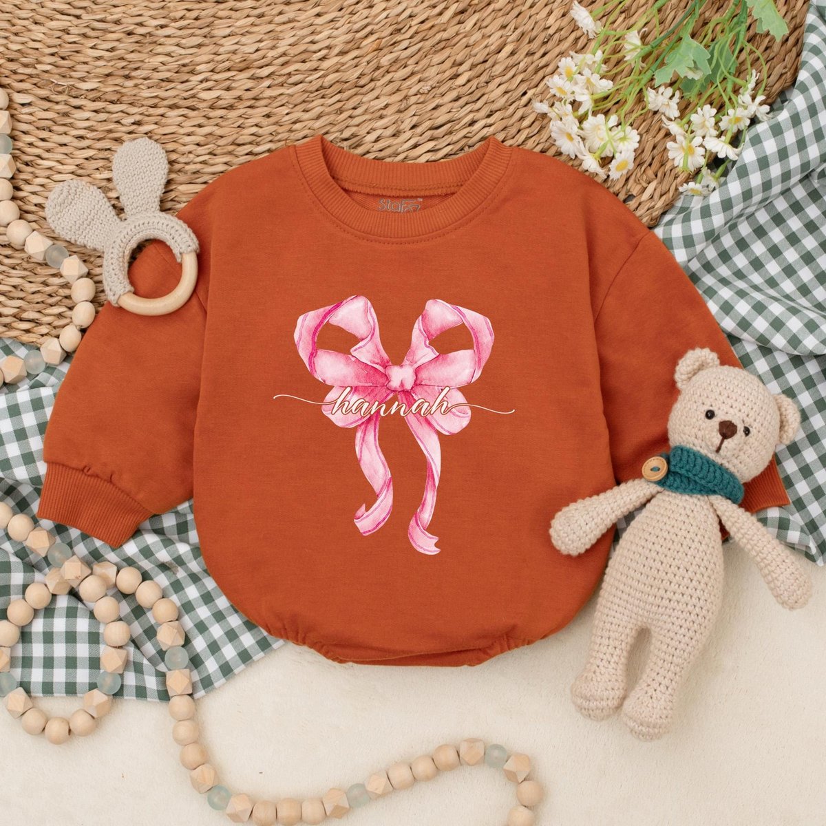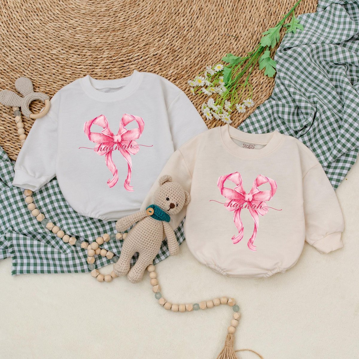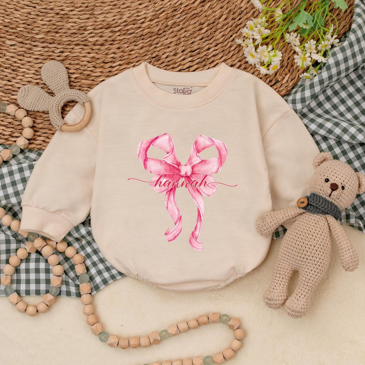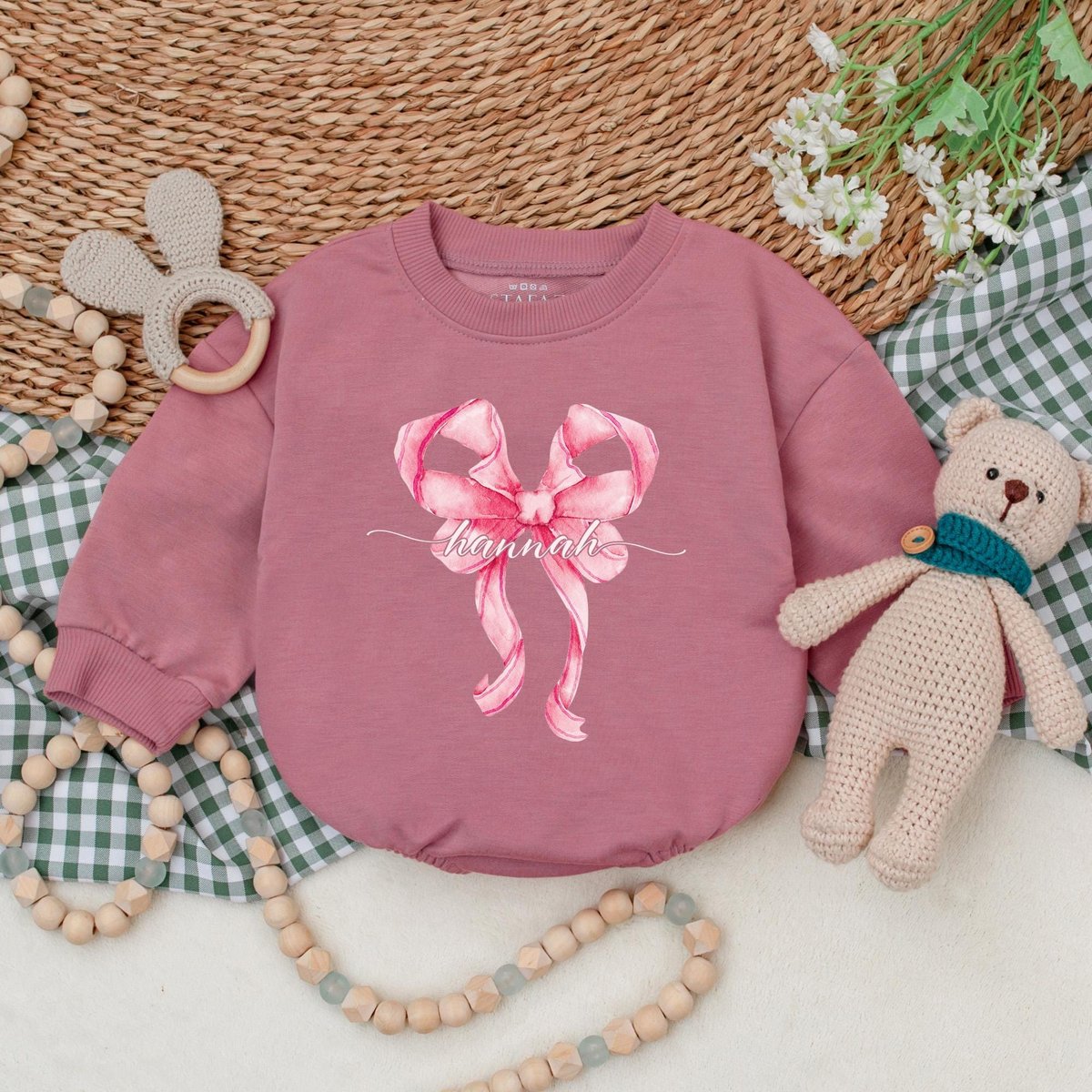 Personalized Pink Bow Baby Romper Cute Bow Pink Bodysuit Girls Birthday Bodysuit Cute Pink Ribbon Ba 184