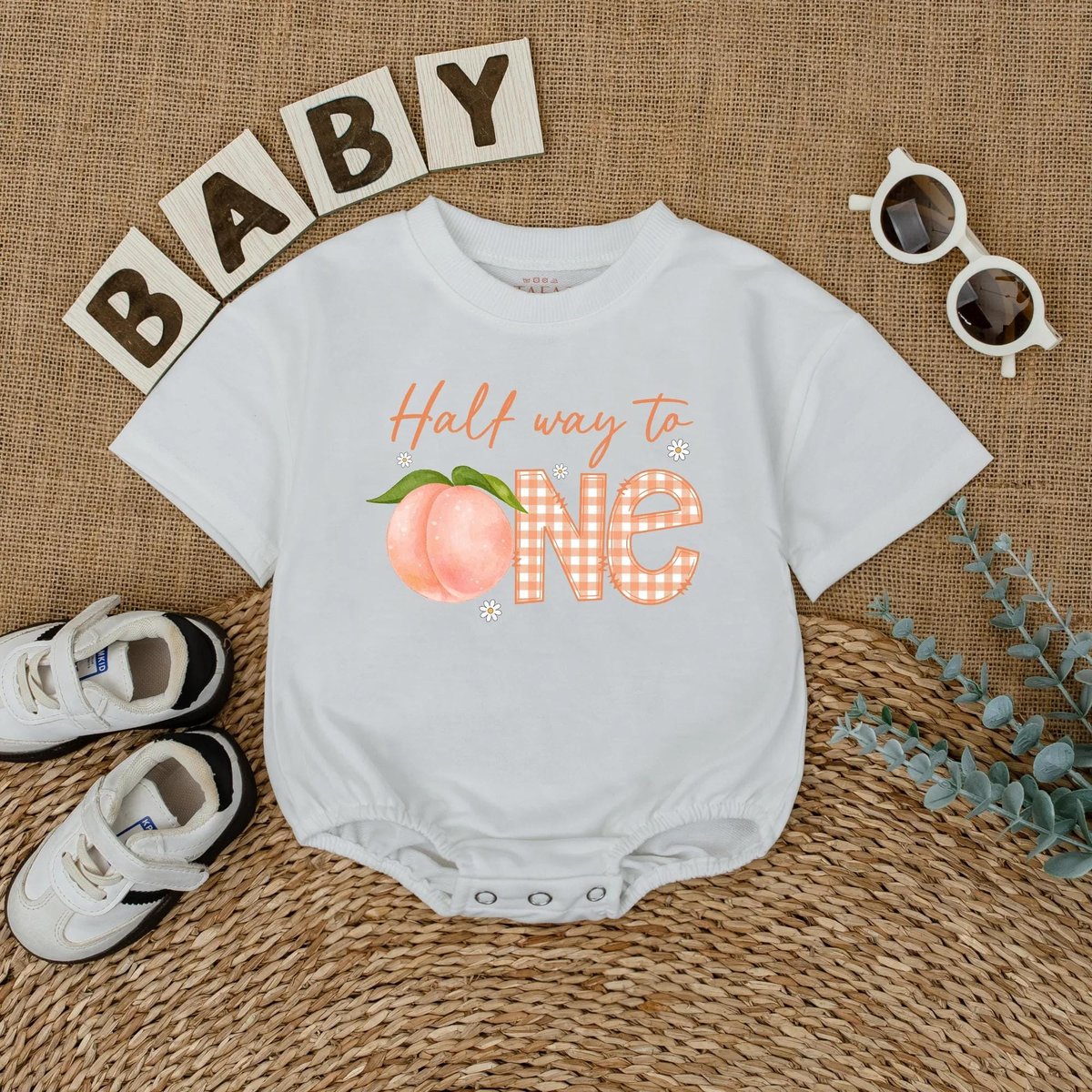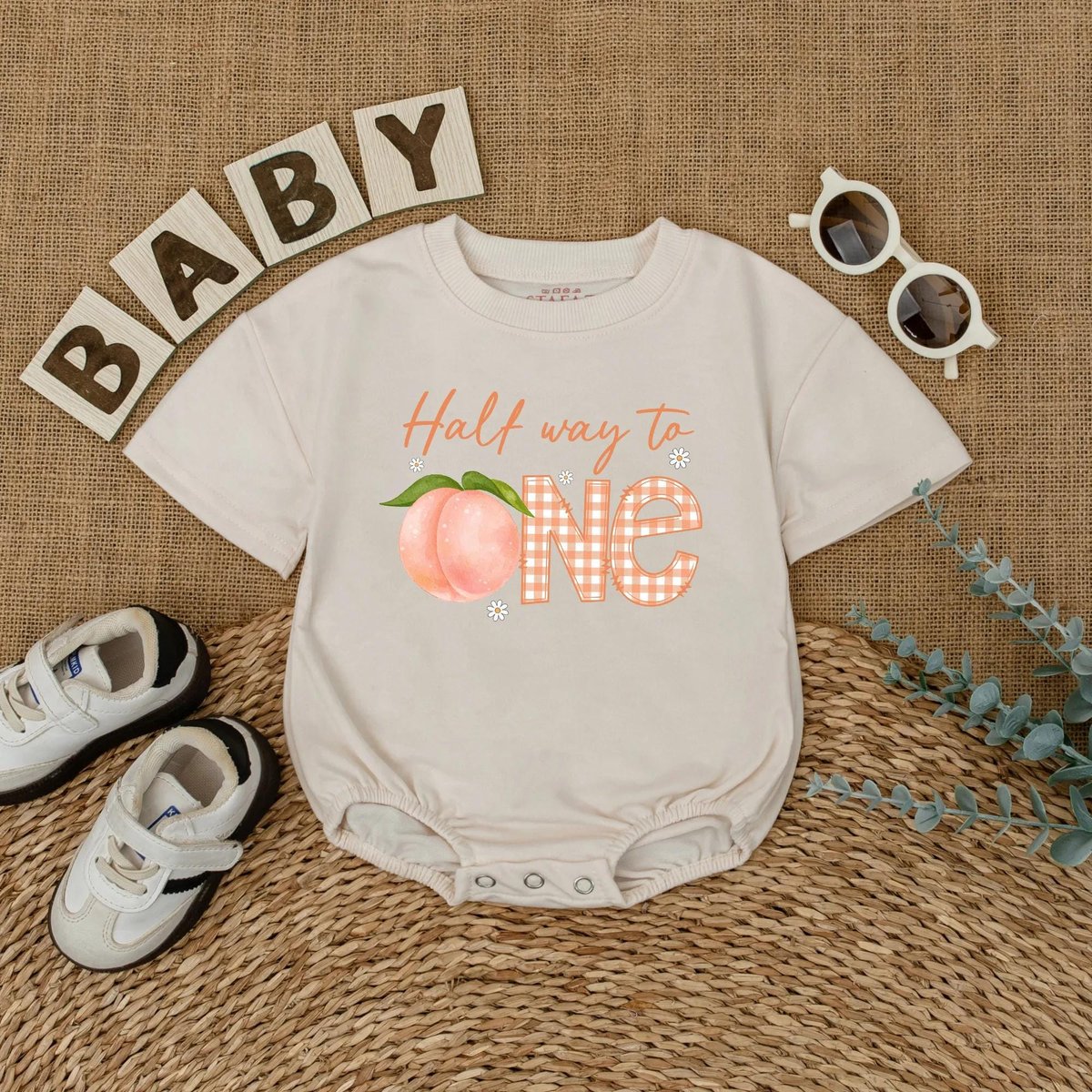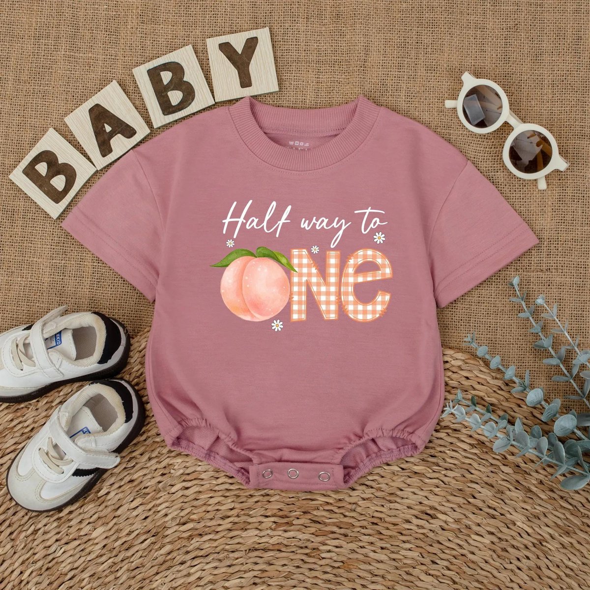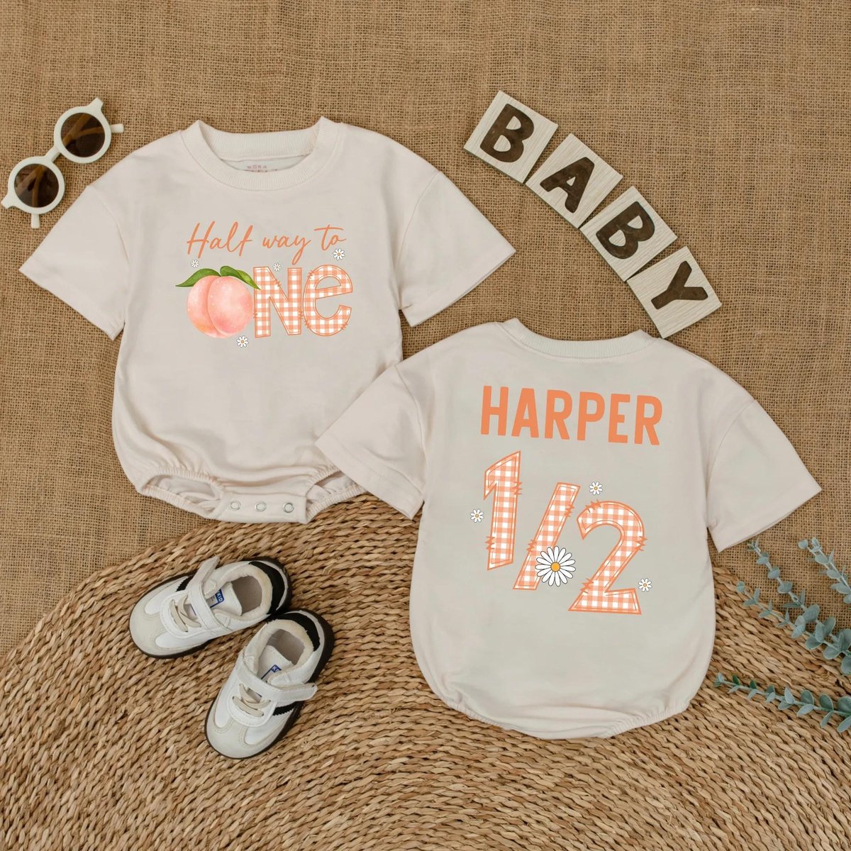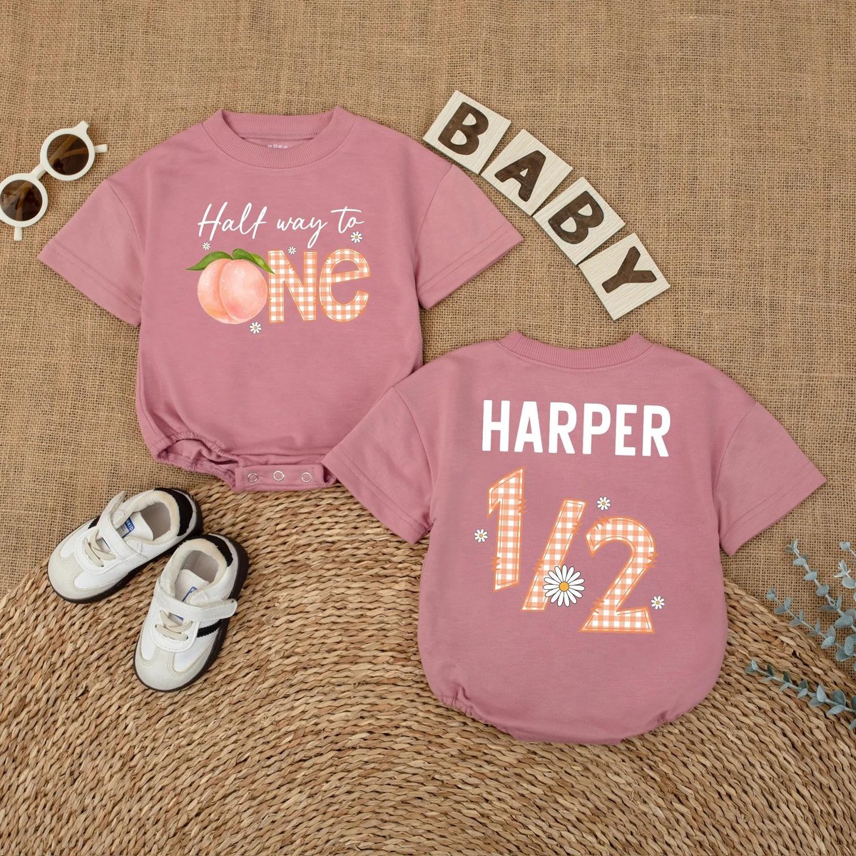 Personalized Peach Half Way To One Romper Half Birthday Girl Bodysuit Girl Half Birthday Party Cake 430
