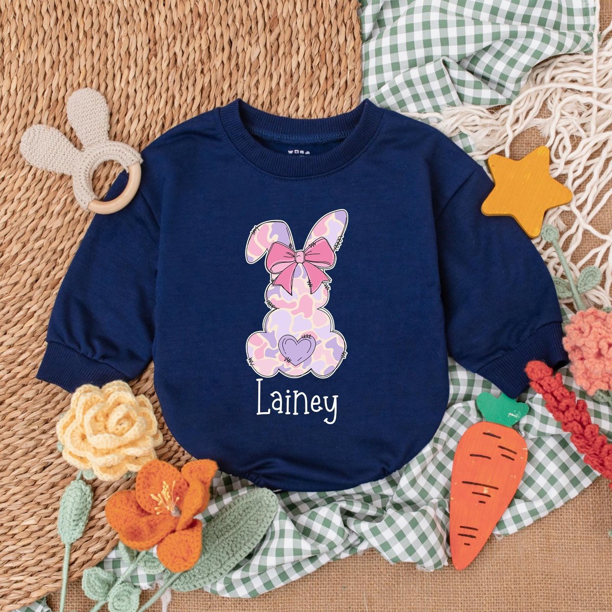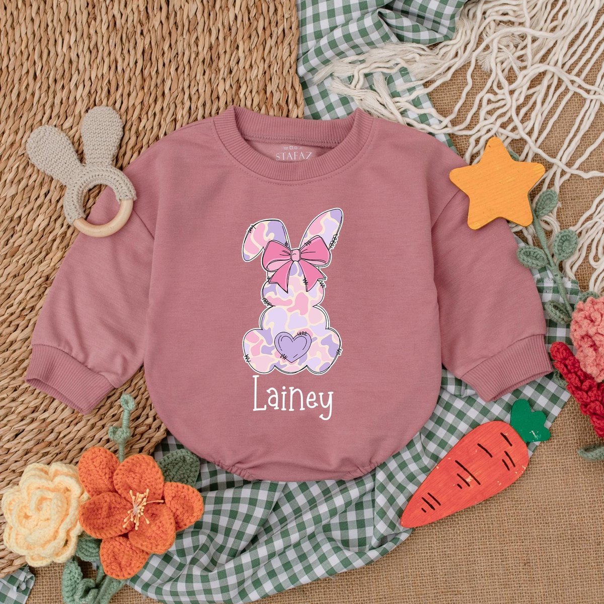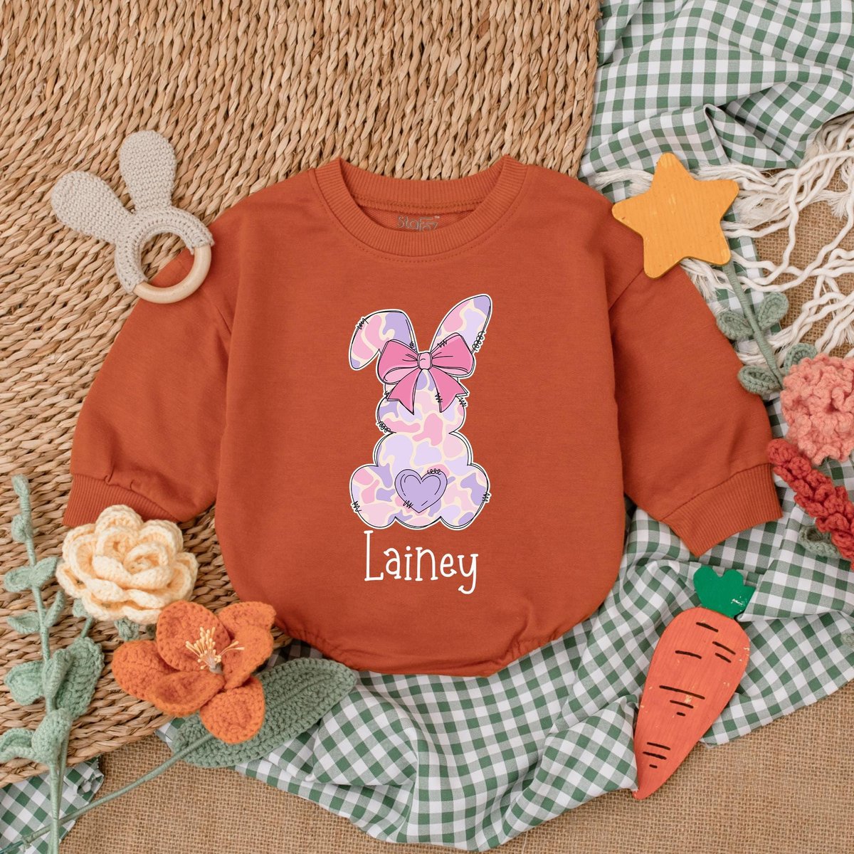 Personalized Pink Camo Easter Girls Romper Pink Bow Easter Bodysuit Bubble Romper for Baby Girl East 188