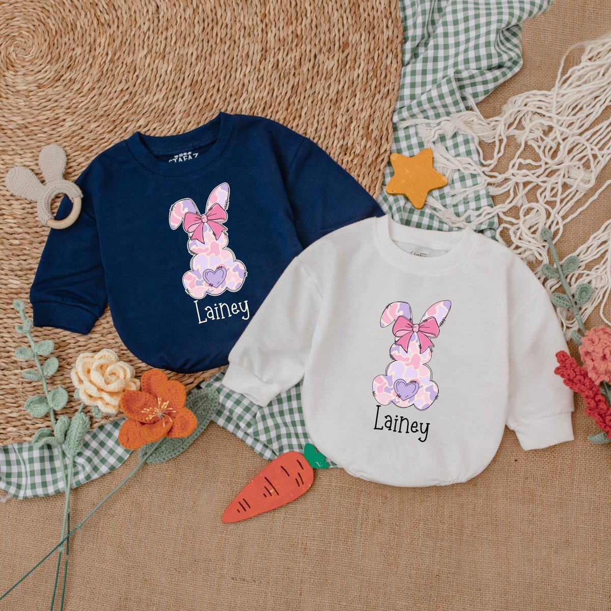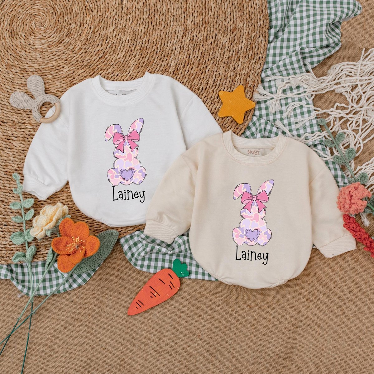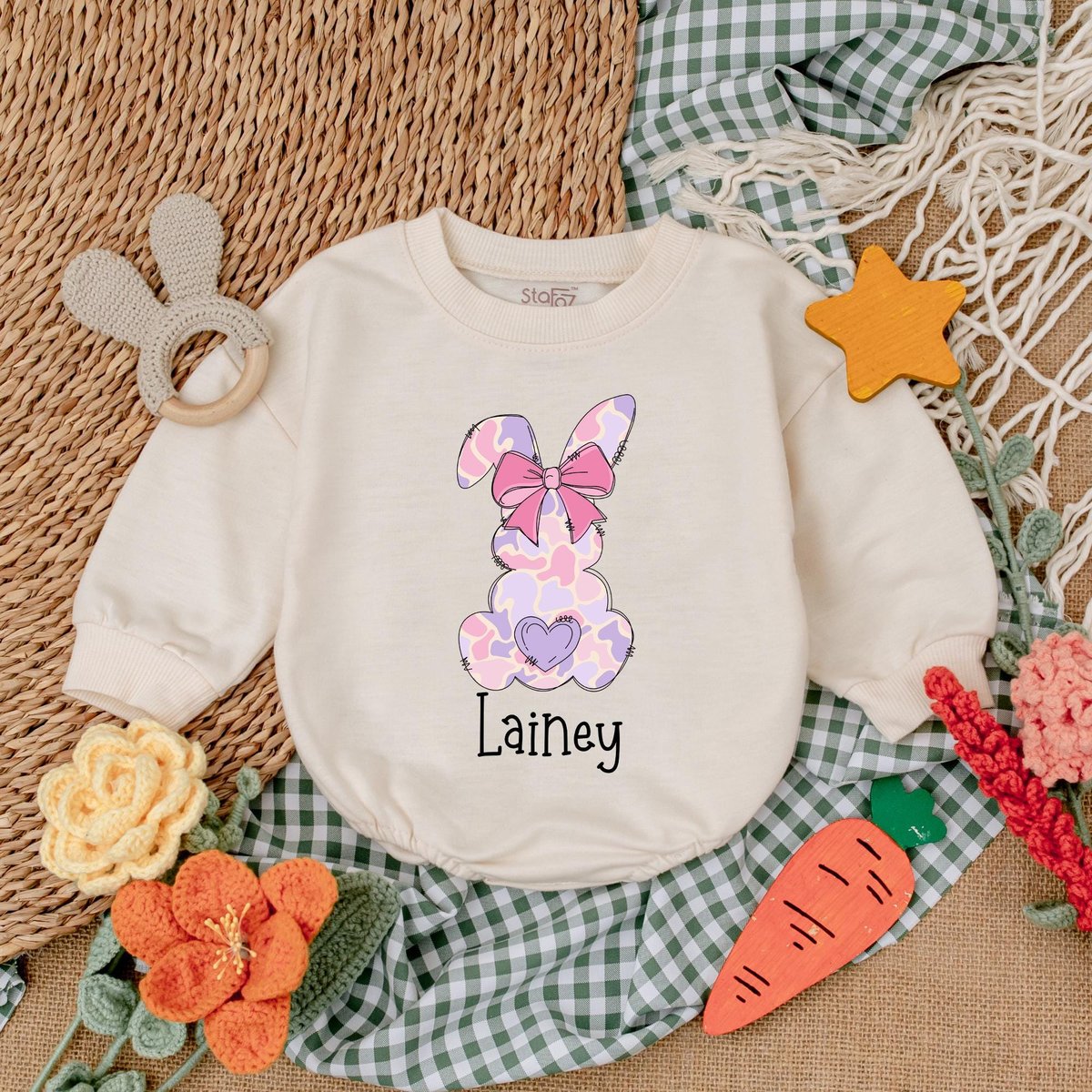 Personalized Pink Camo Easter Girls Romper Pink Bow Easter Bodysuit Bubble Romper for Baby Girl East 188