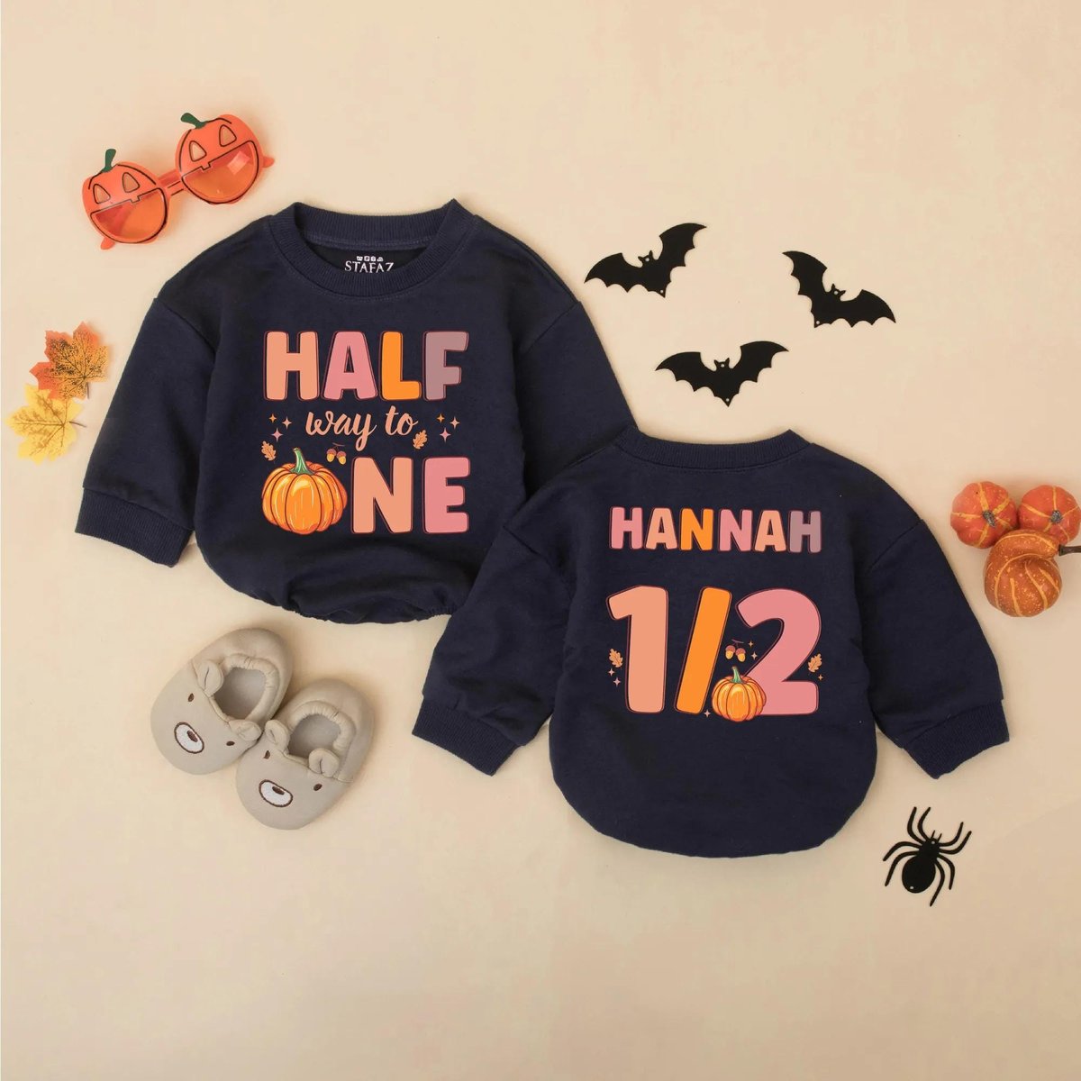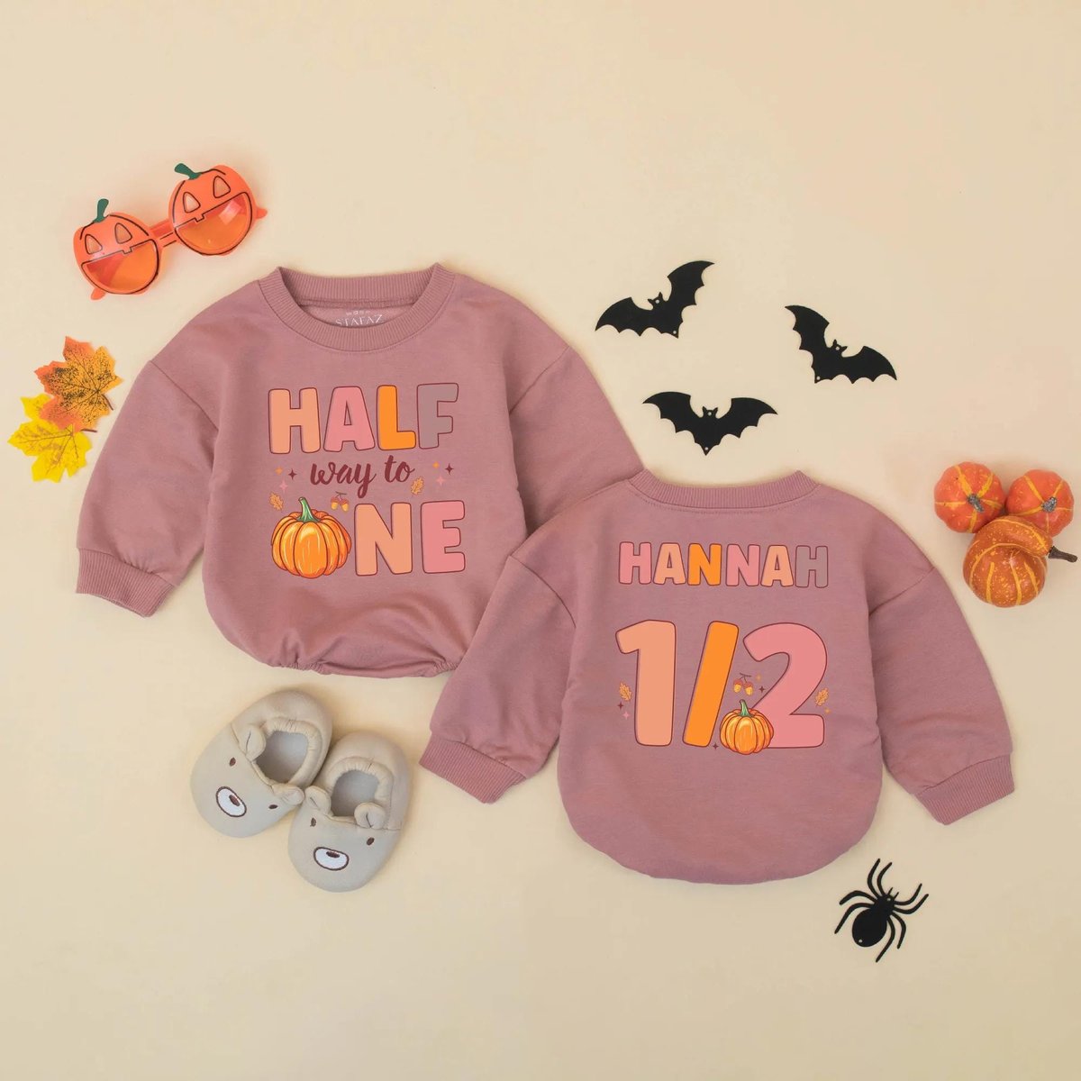 Personalized Pumpkin Half Way to One Bubble Romper Custom 6 Month Outfit Fall Half Birthday Clothes 436