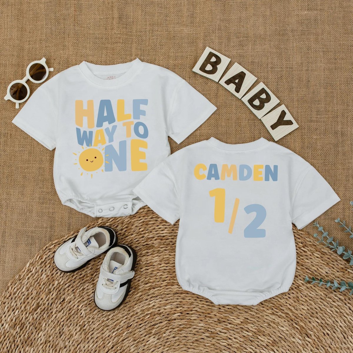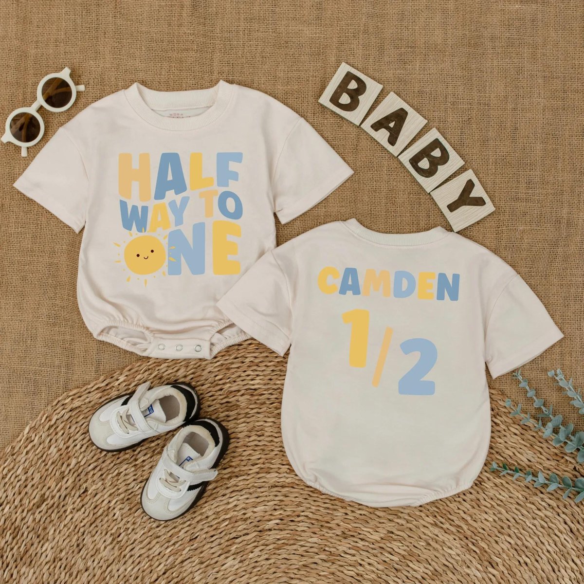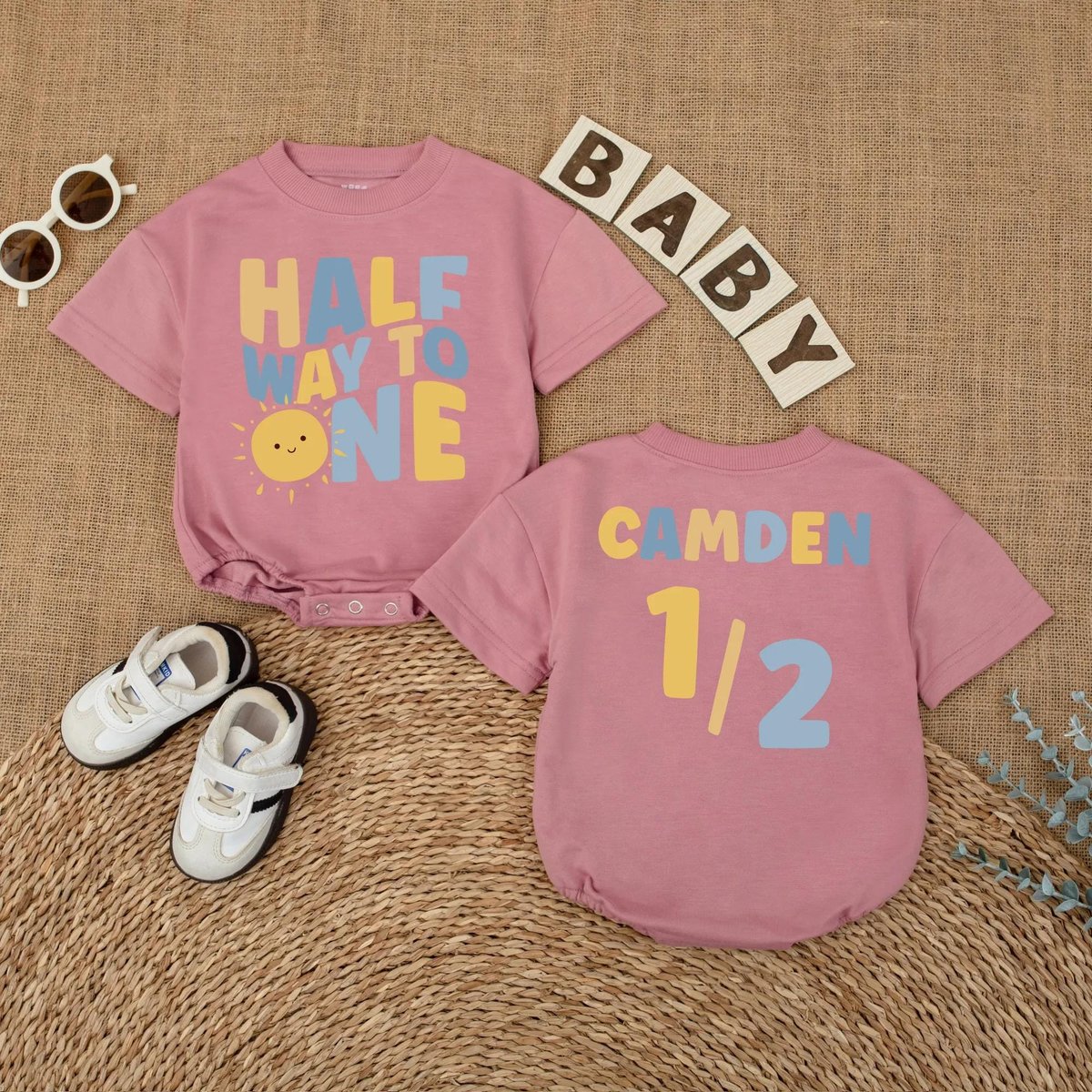 Personalized Sunshine Half Way to One Baby Romper Half Birthday Baby Bodysuit Custom Name Outfit for 433