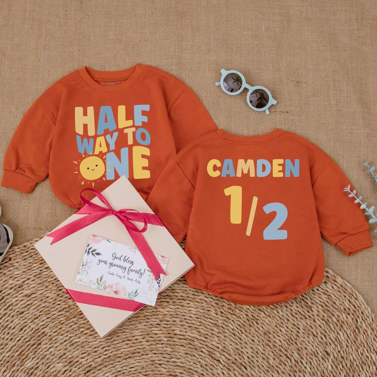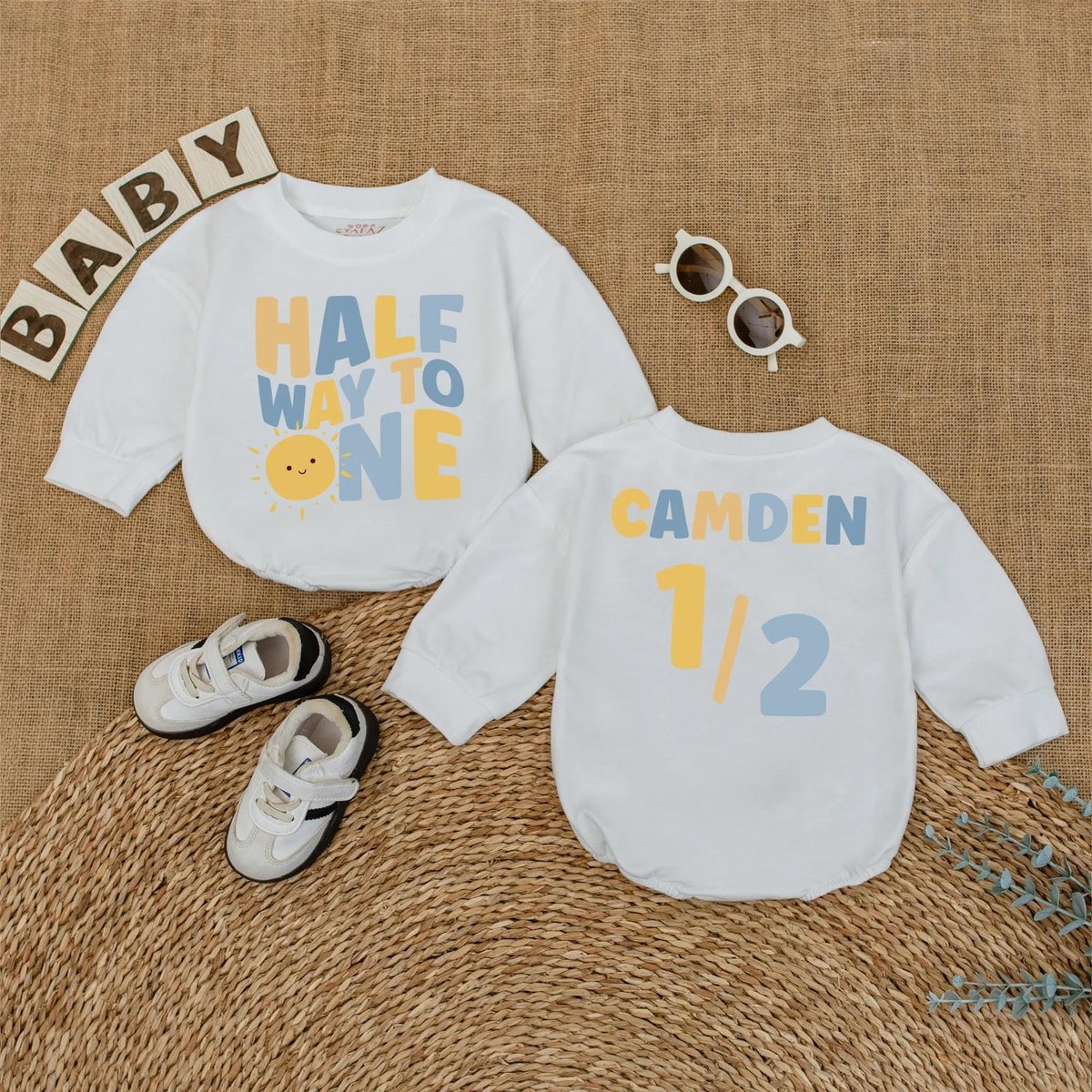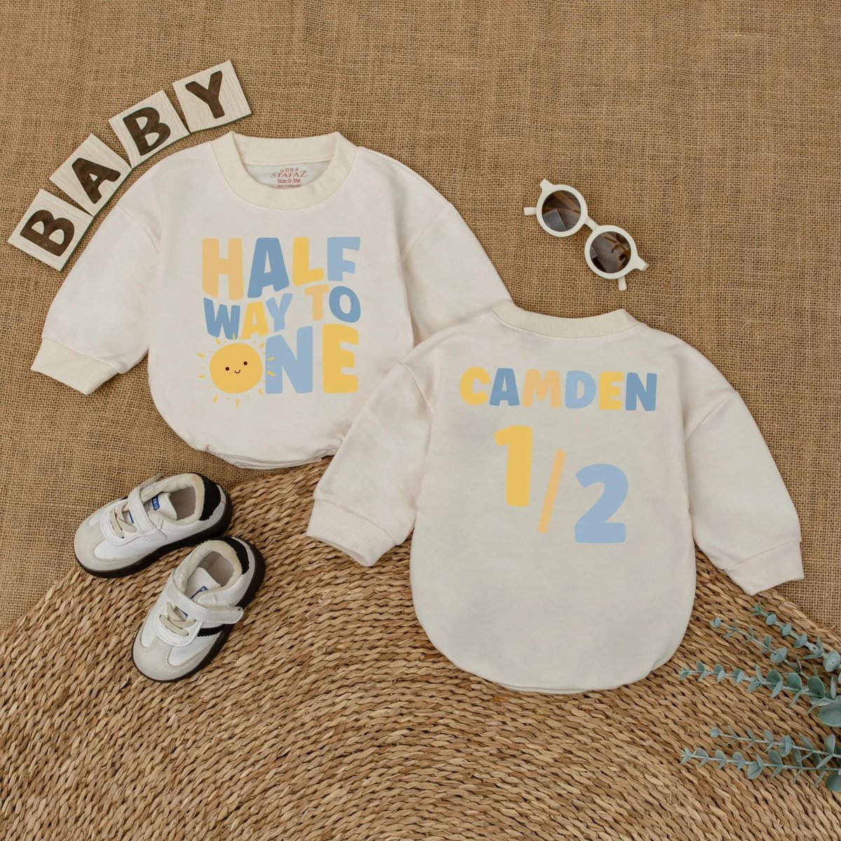 Personalized Sunshine Half Way to One Baby Romper Half Birthday Baby Bodysuit Custom Name Outfit for 433