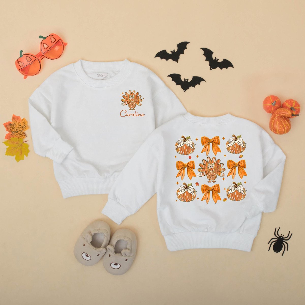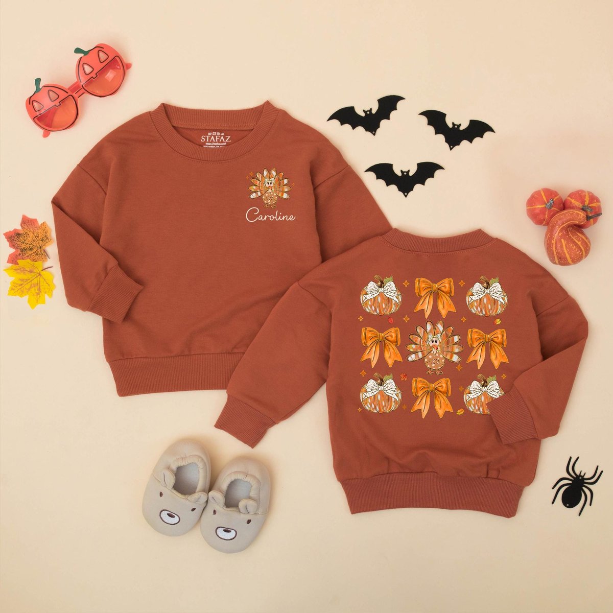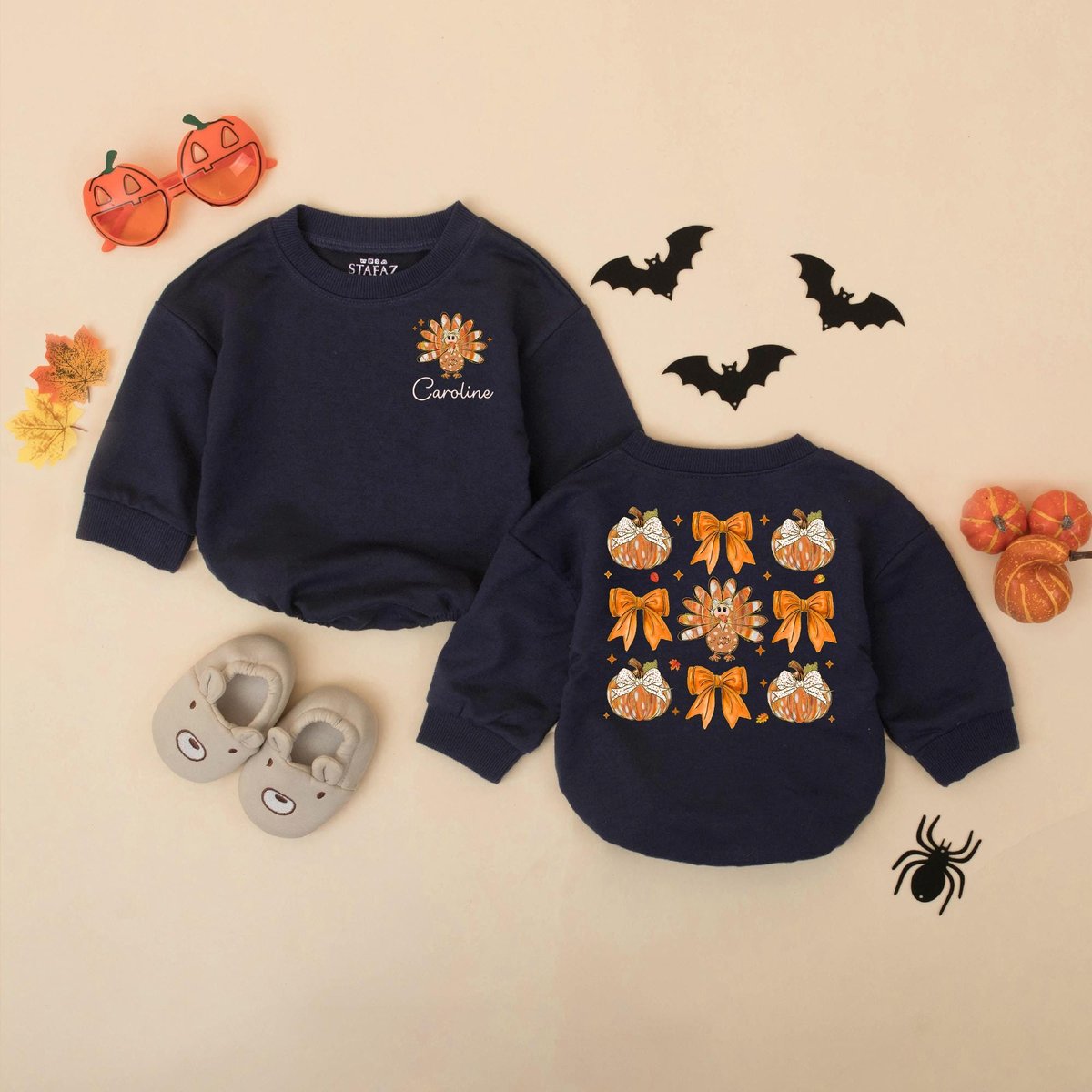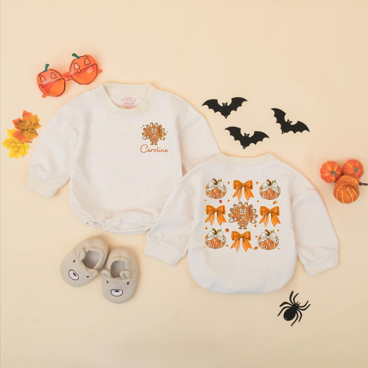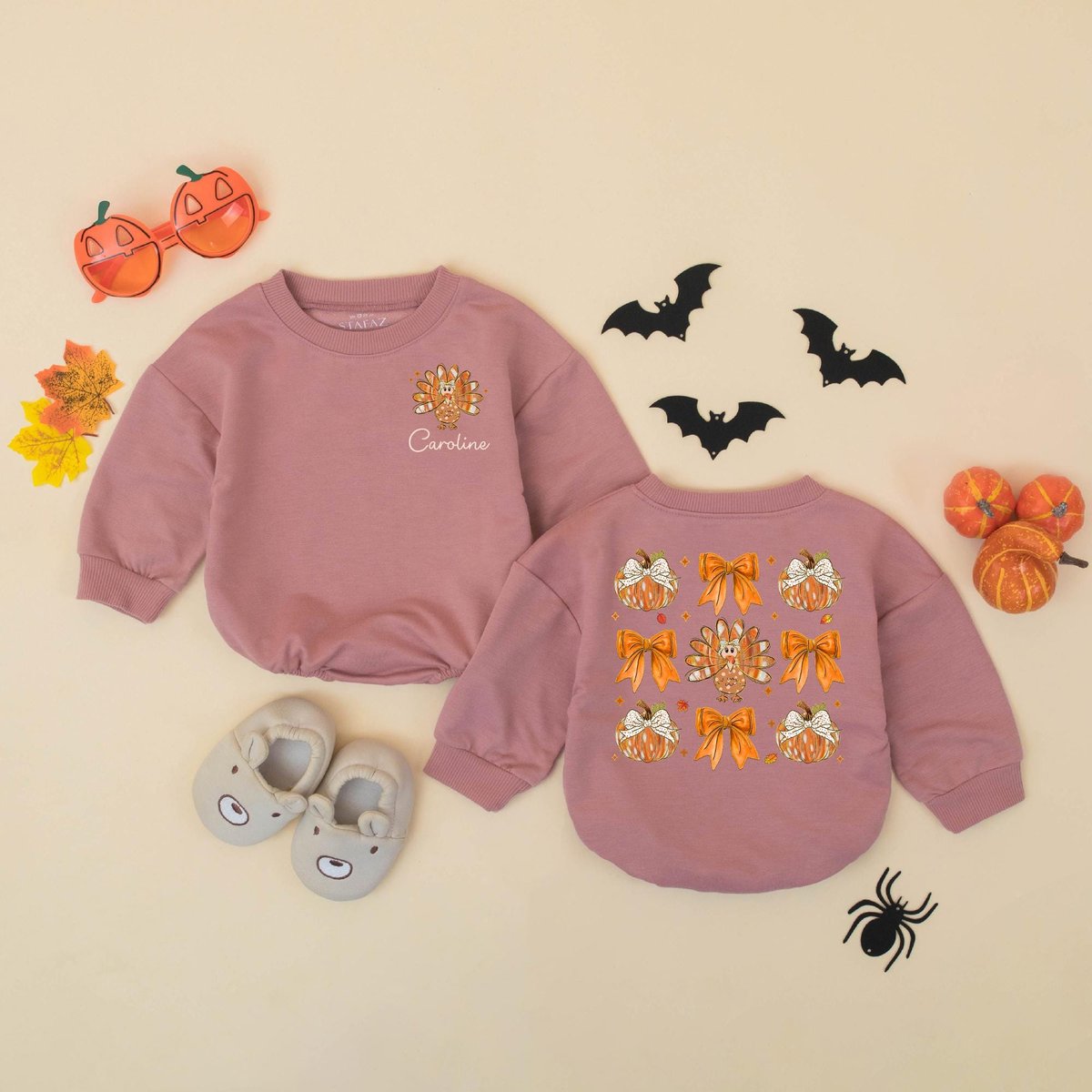 Personalized Turkey Pumpkin Bow Bubble Romper Custom Baby Girl Thanksgiving Outfit Cute Fall Outfit 436