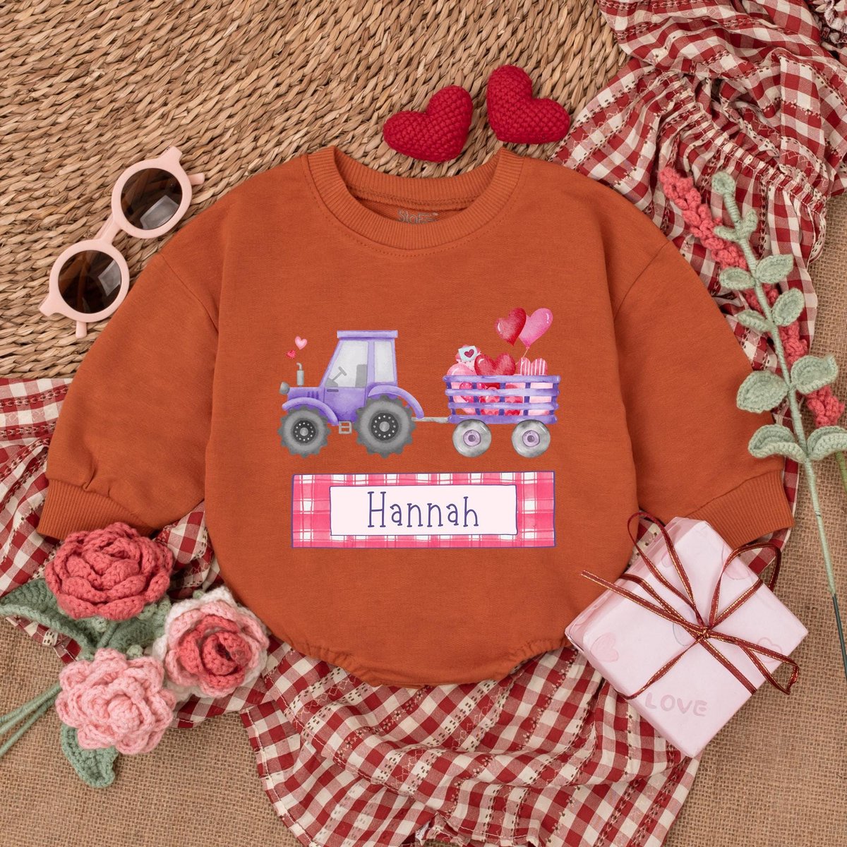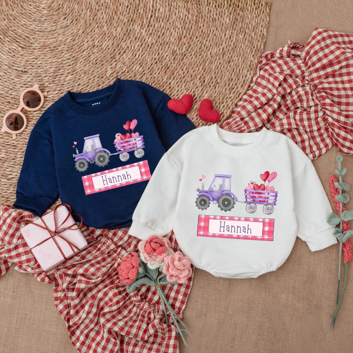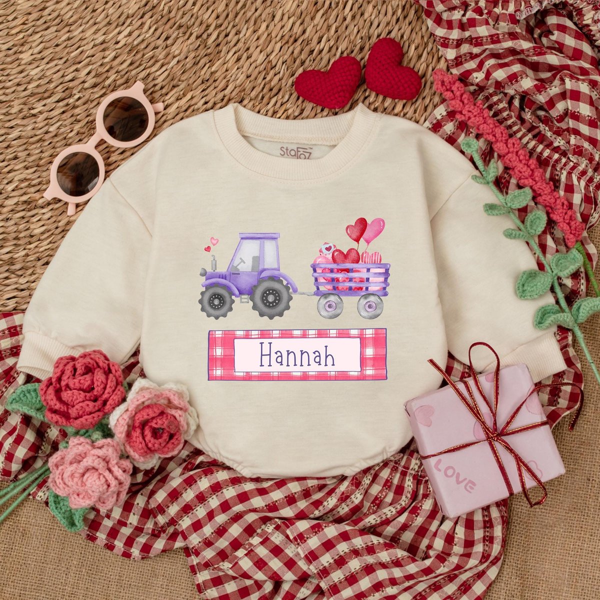 Personalized Valentine Purple Tractor Baby Romper Baby Girl Valentine Bodysuit Custom Name Valentine 183
