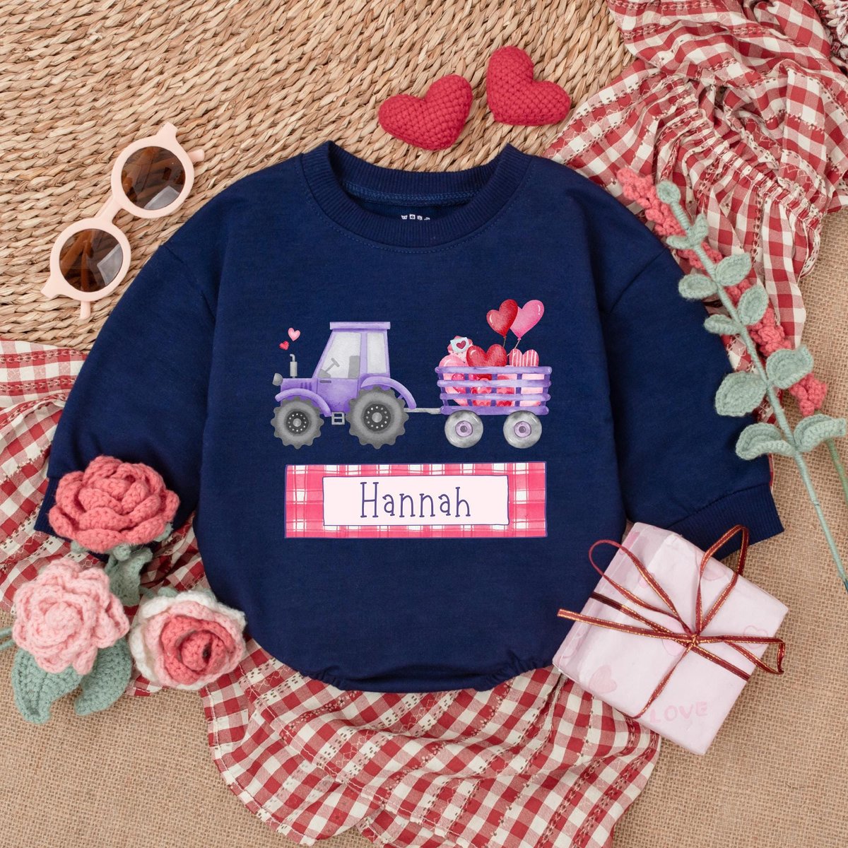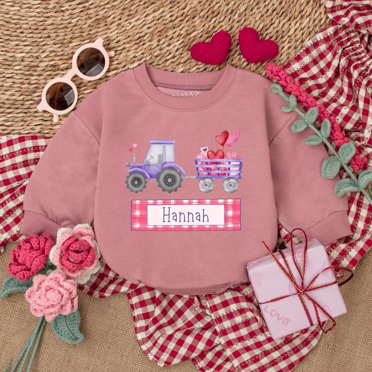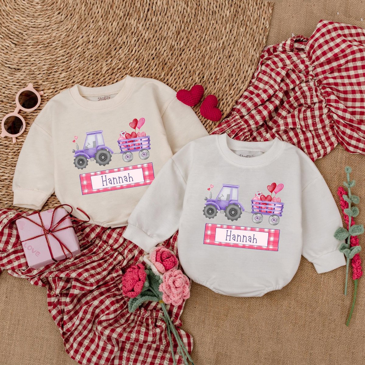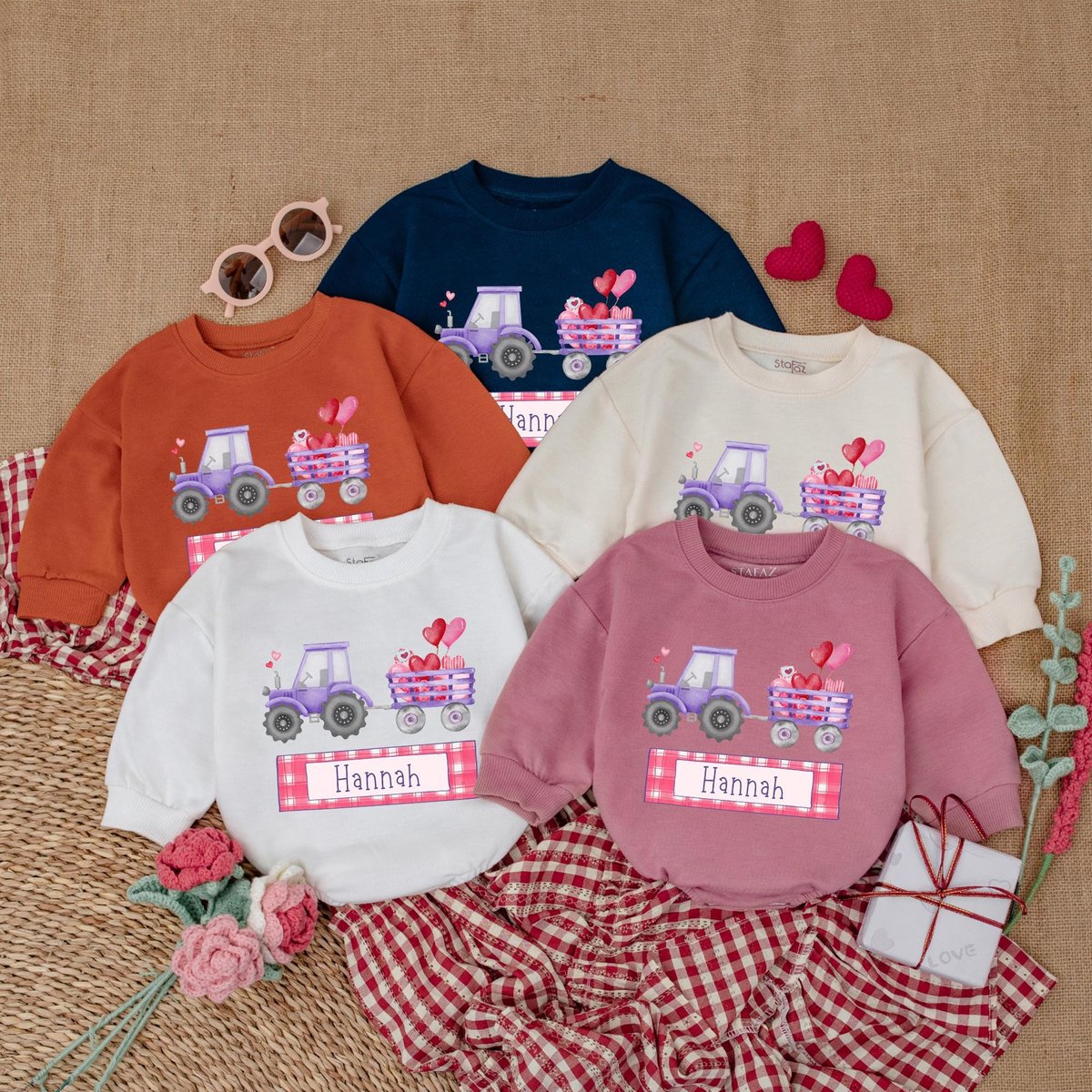 Personalized Valentine Purple Tractor Baby Romper Baby Girl Valentine Bodysuit Custom Name Valentine 183
