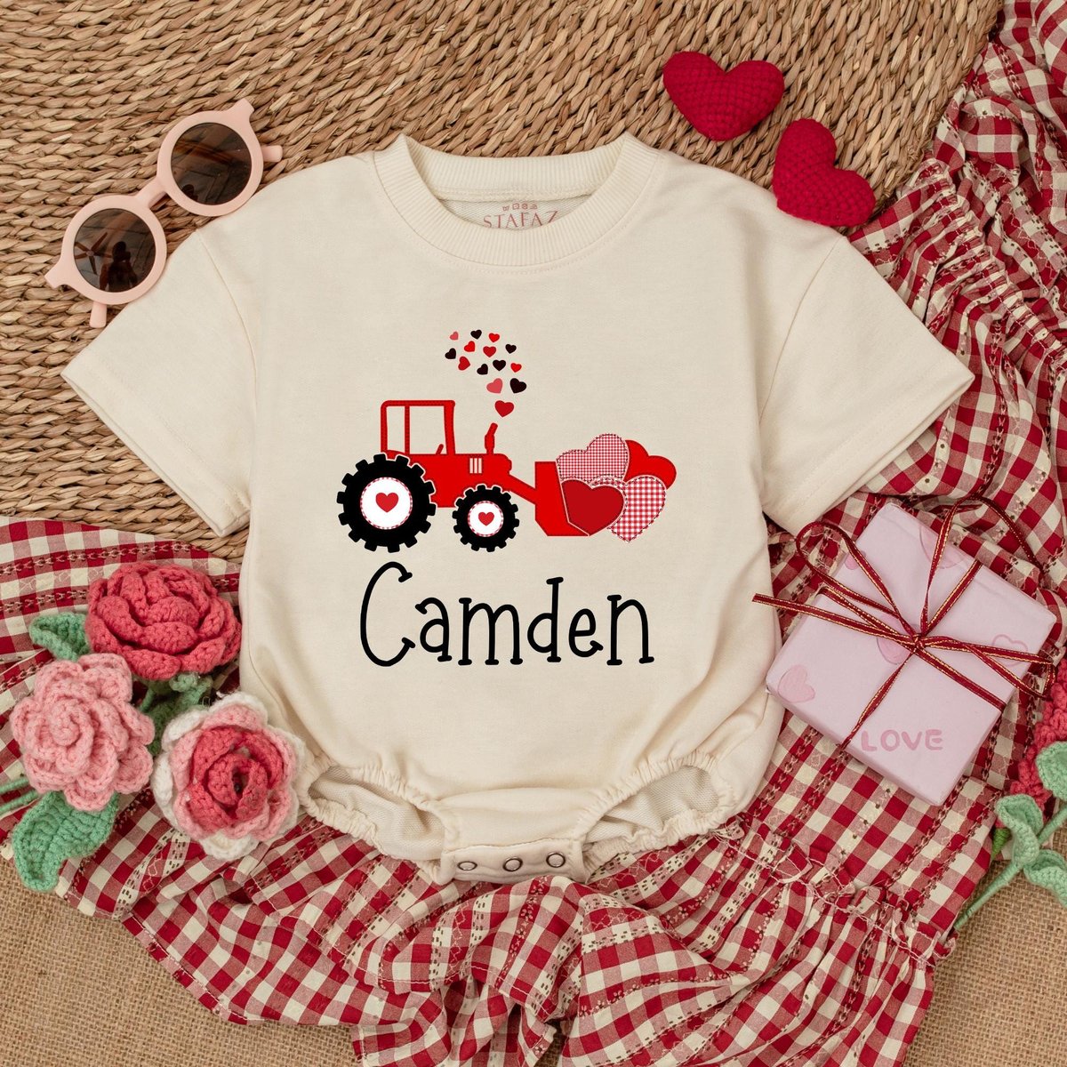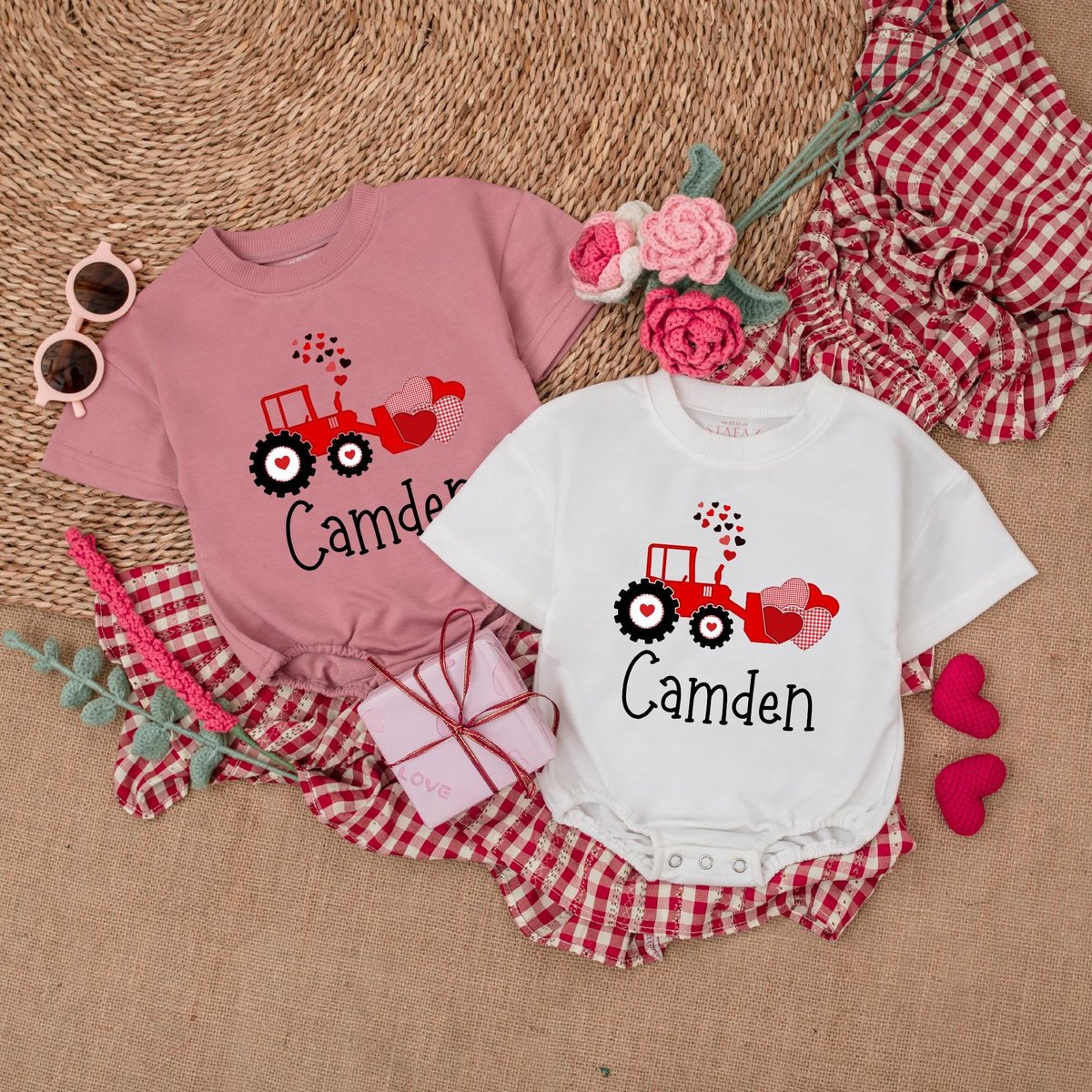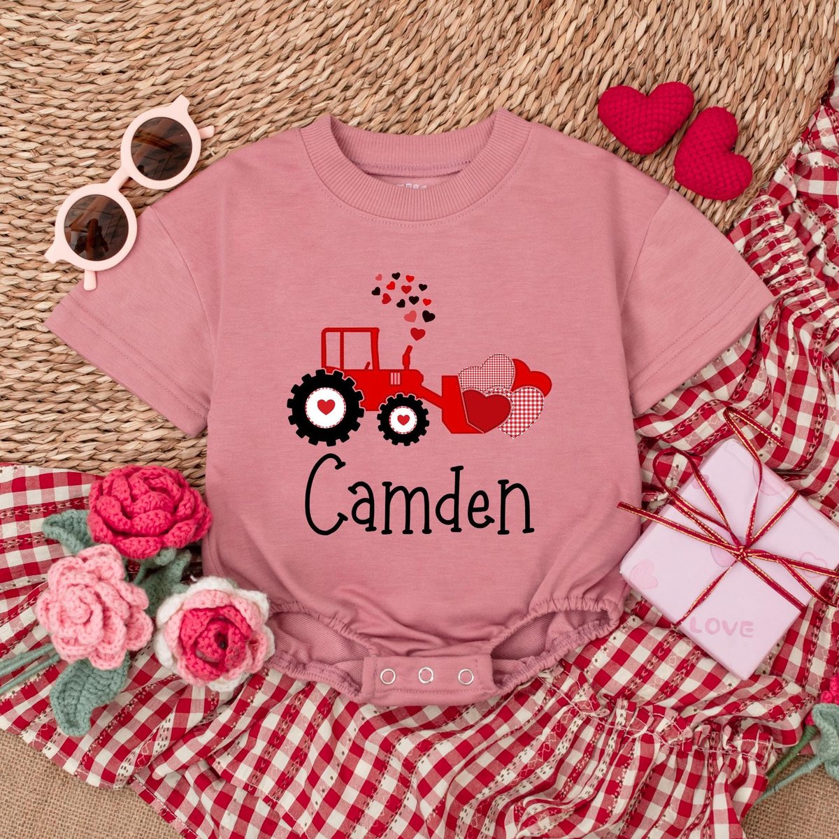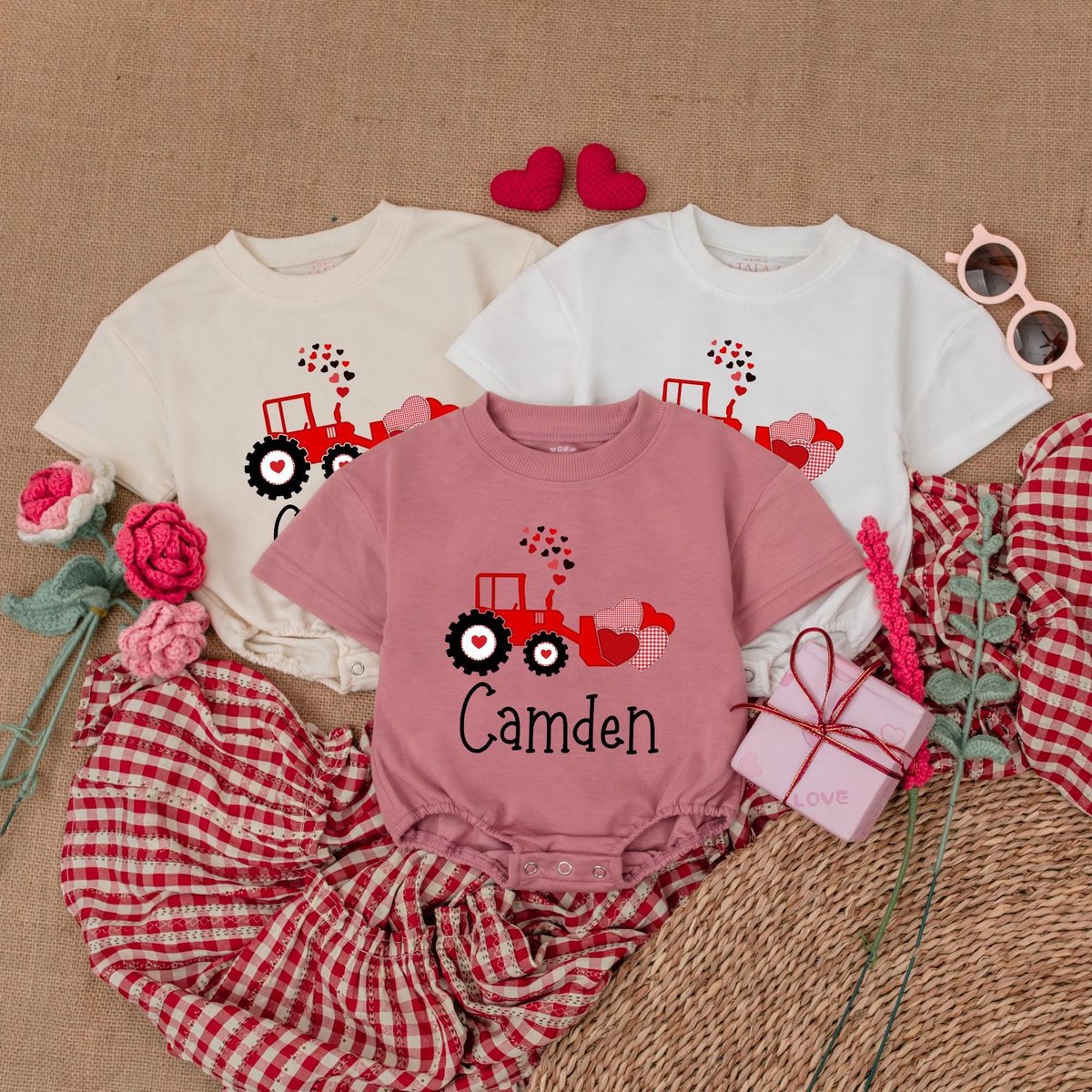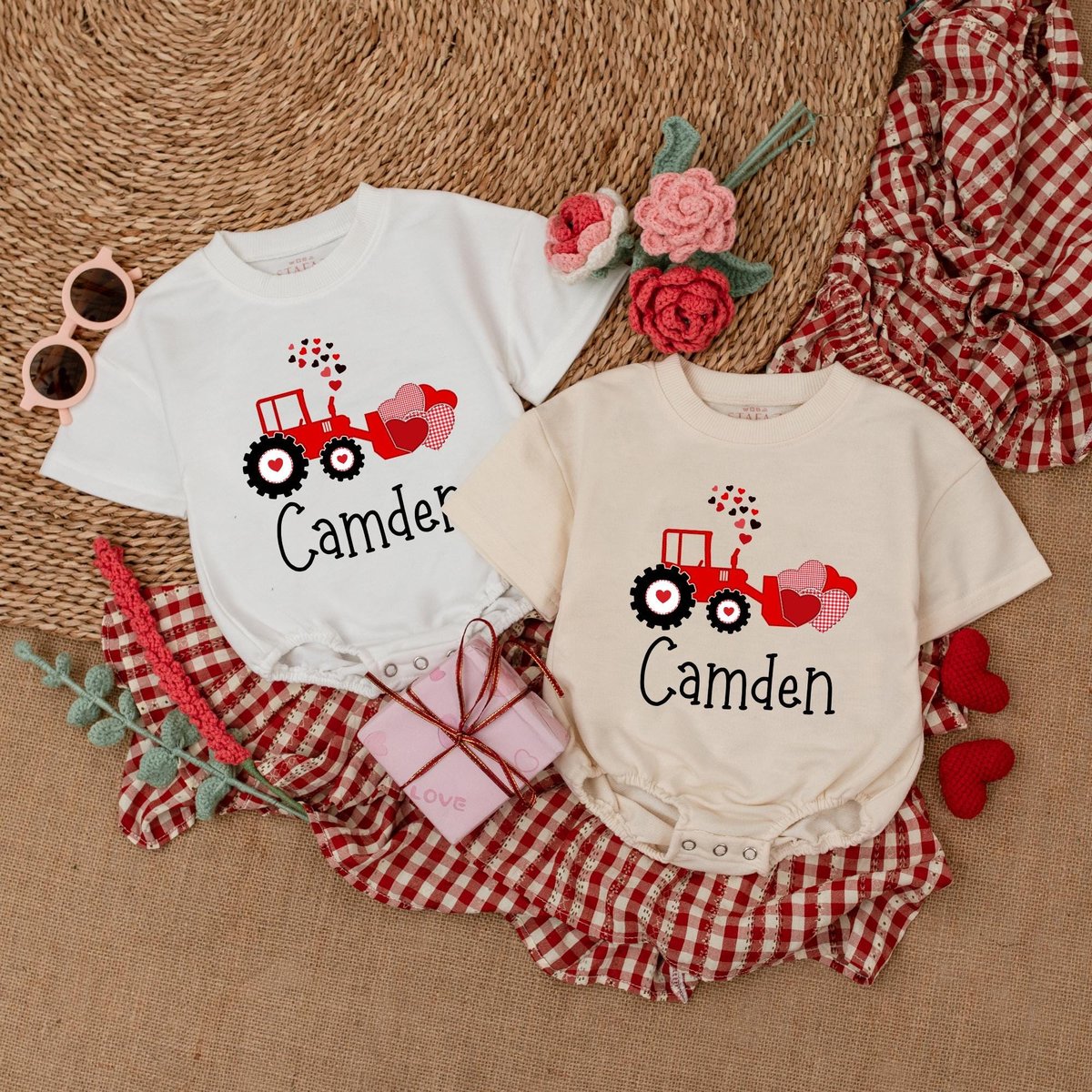 Personalized Valentine Red Tractor Baby Romper Baby Boy Valentine Bodysuit Custom Name Valentine’s 185