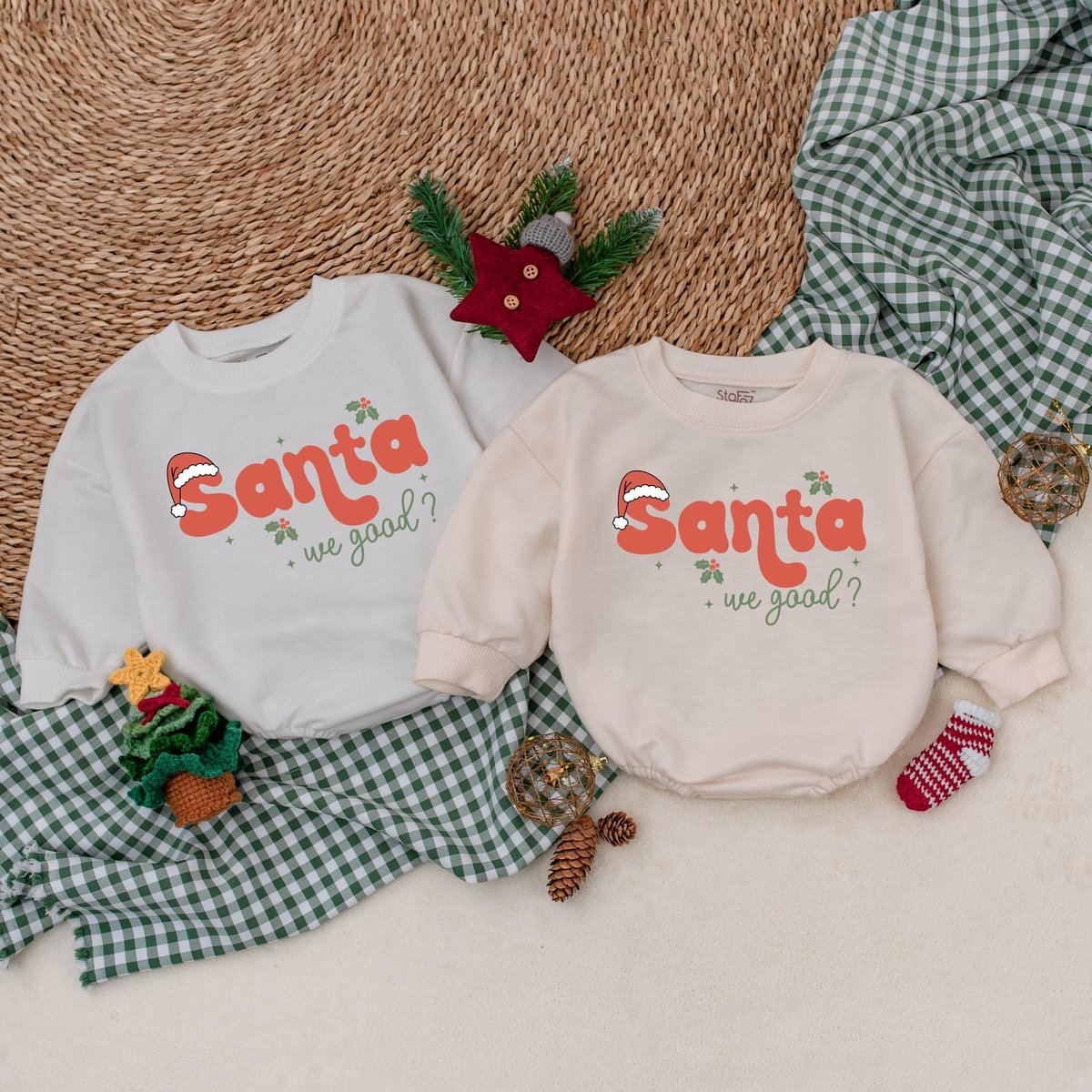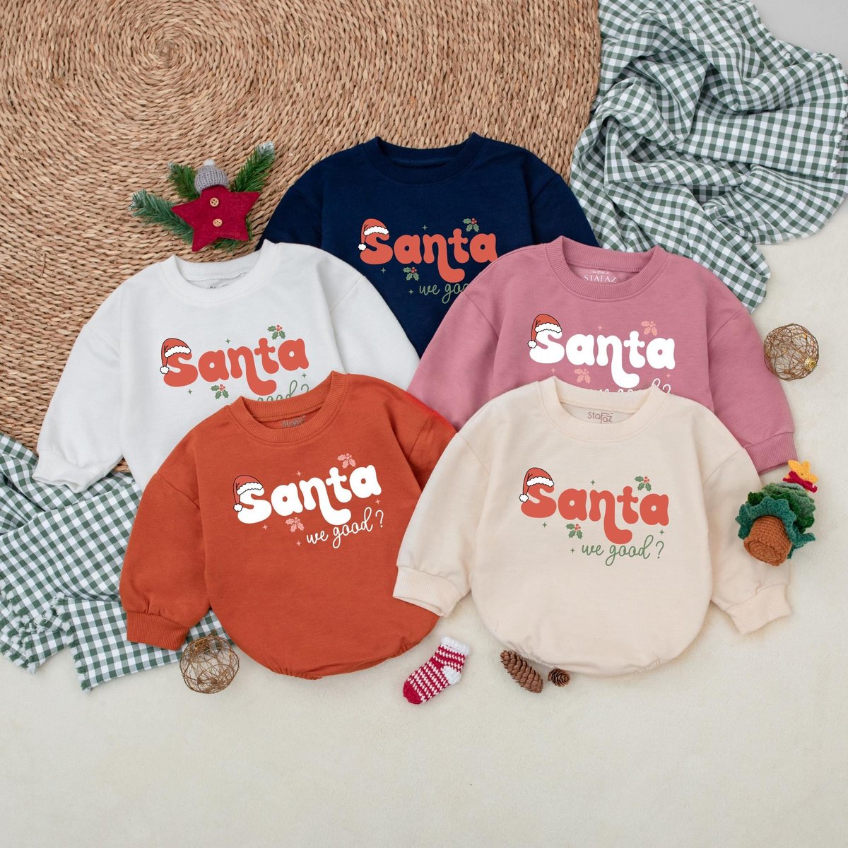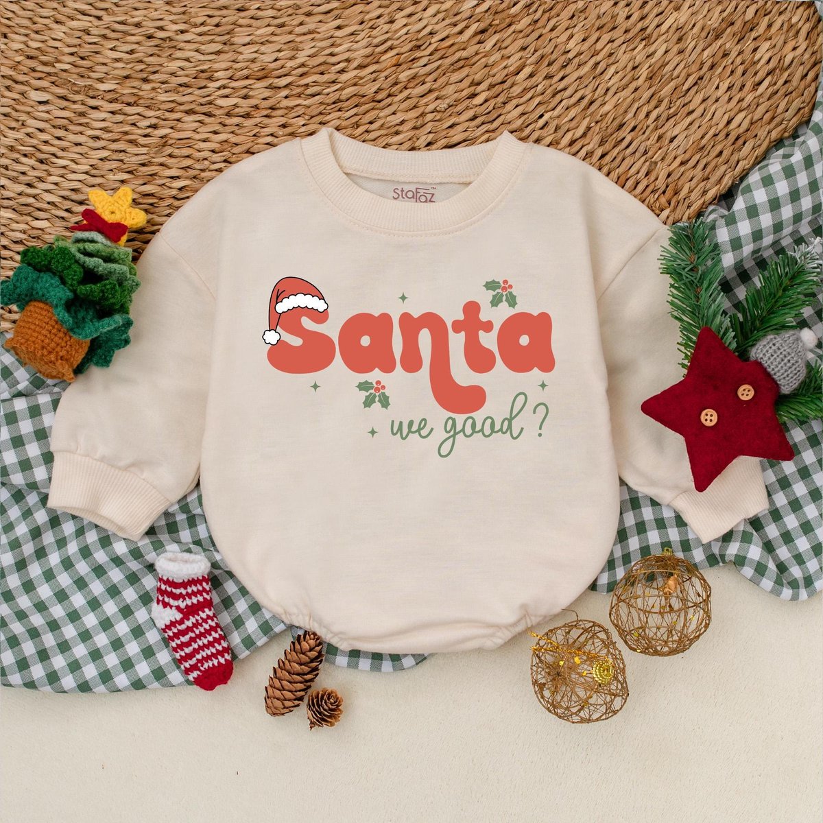 Santa We Good Baby Romper Christmas Baby Bodysuit Christmas Bubble Romper First Christmas Outfit Fun 179