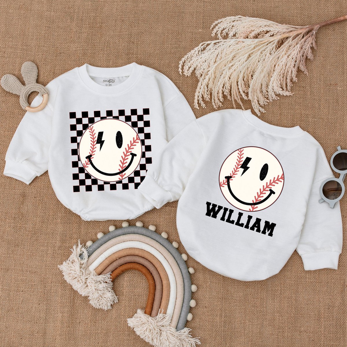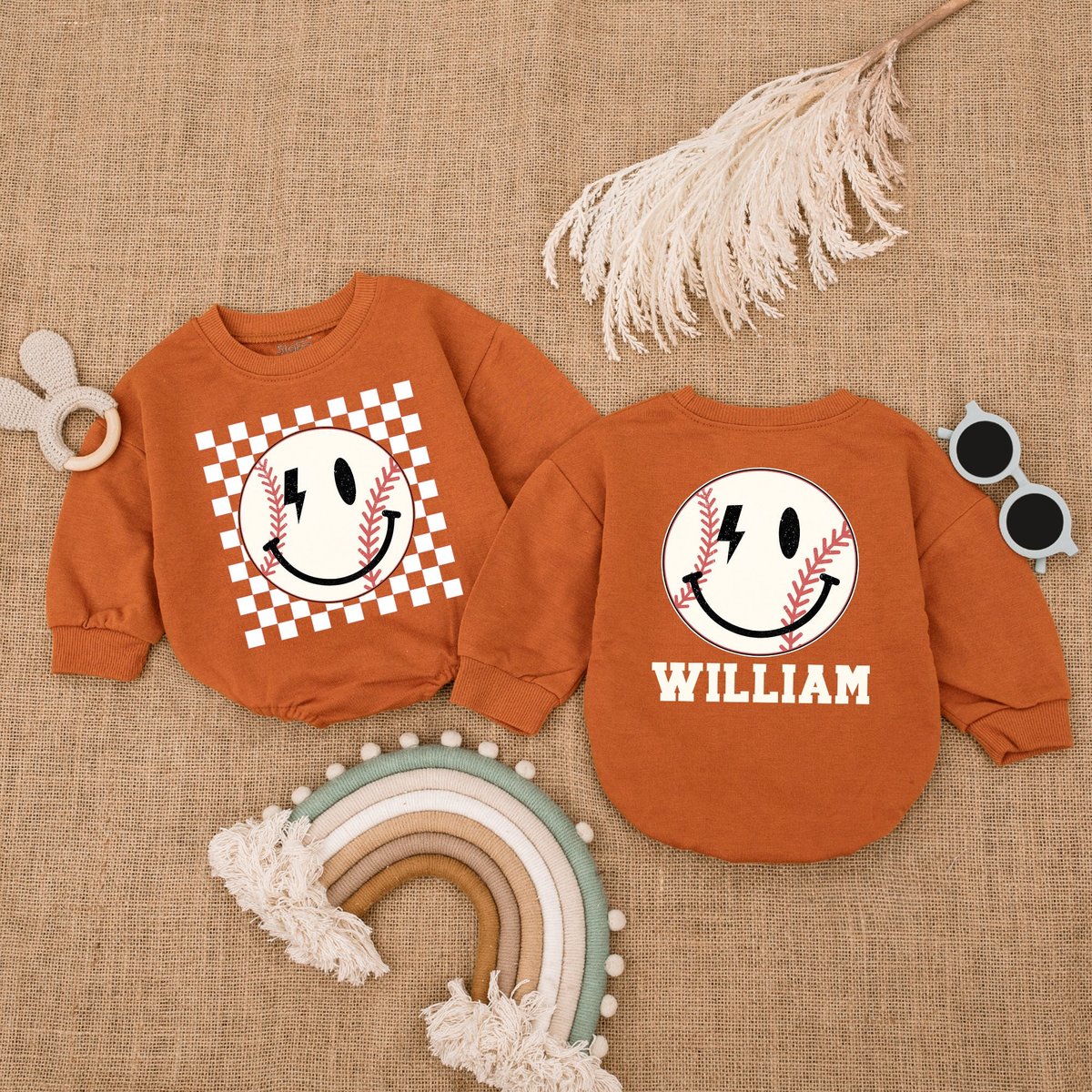 Custom Baseball Smile Face Romper Sweatshirt Baseball Game Day RomperCheckered Game Day BodysuitBoy 177