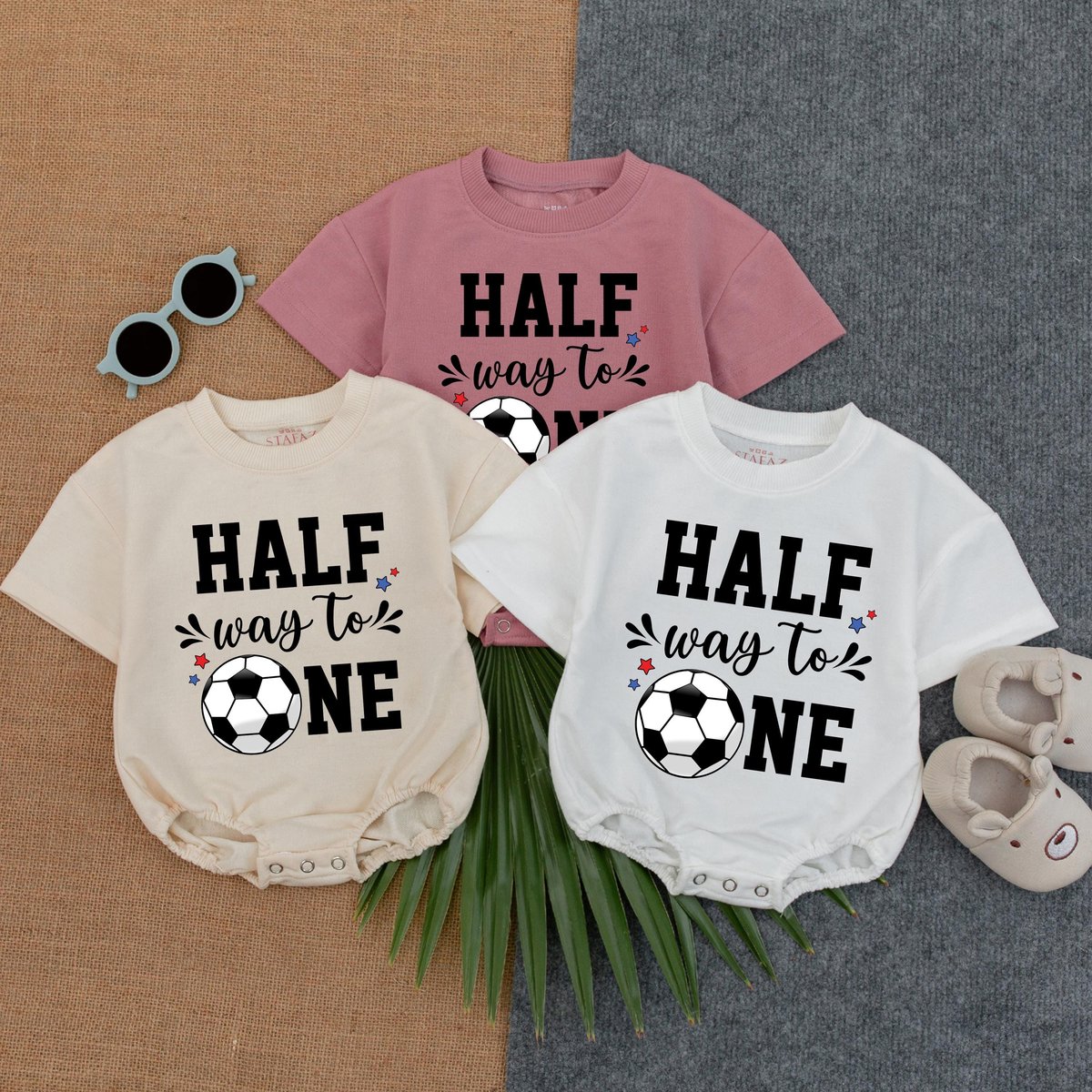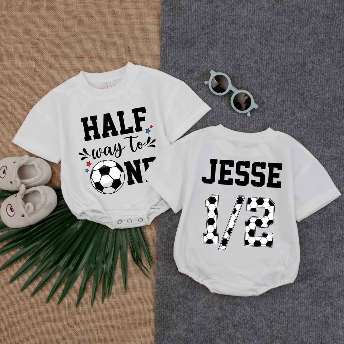 Custom Halfway To One Romper Short SleeveSoccer Half Birthday 12 Birthday Outfit Six Month Birthda 431