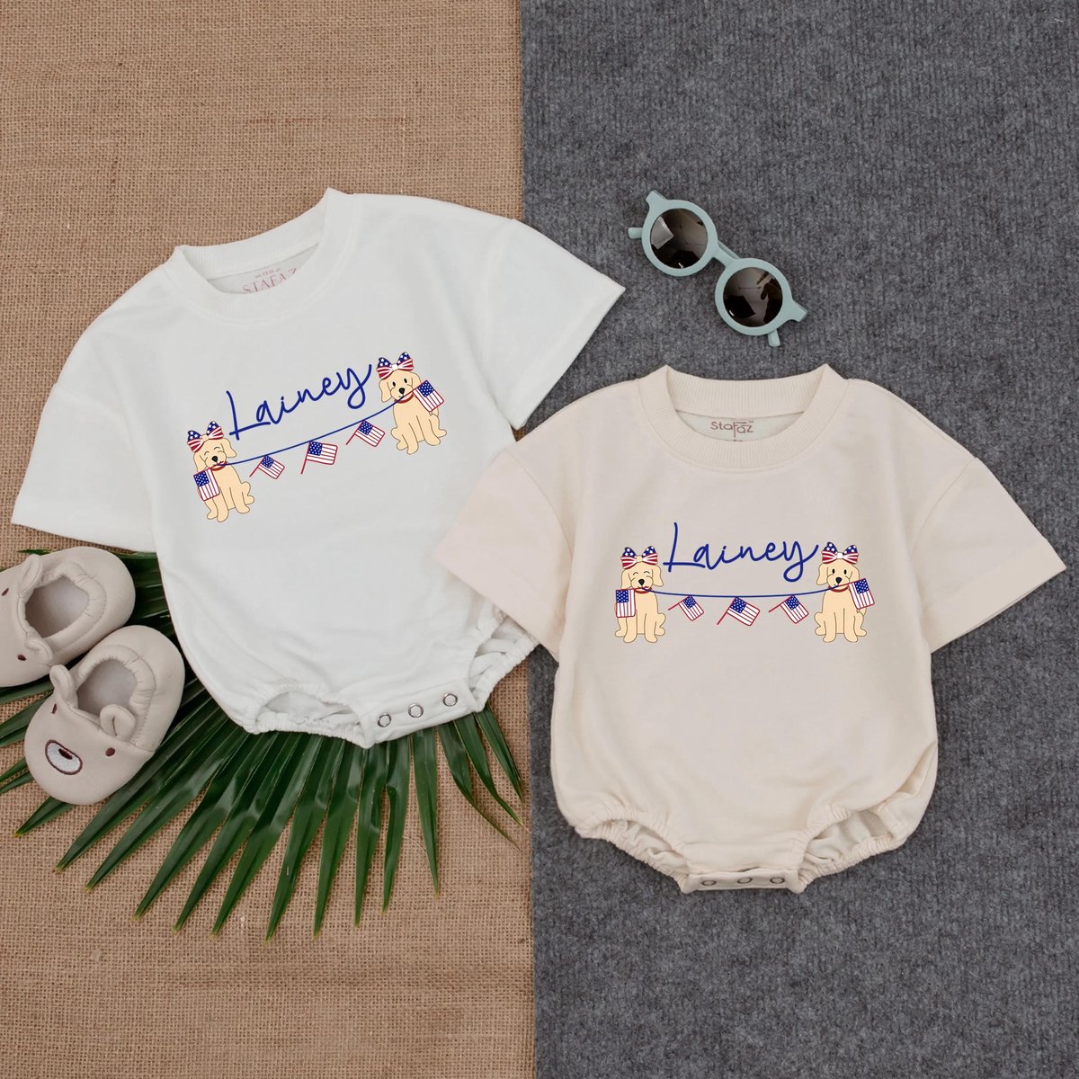 Custom Puppy 4th of July Bubble Romper Personalized Baby Name Patriotic Baby Outfit Red White Blue C 431