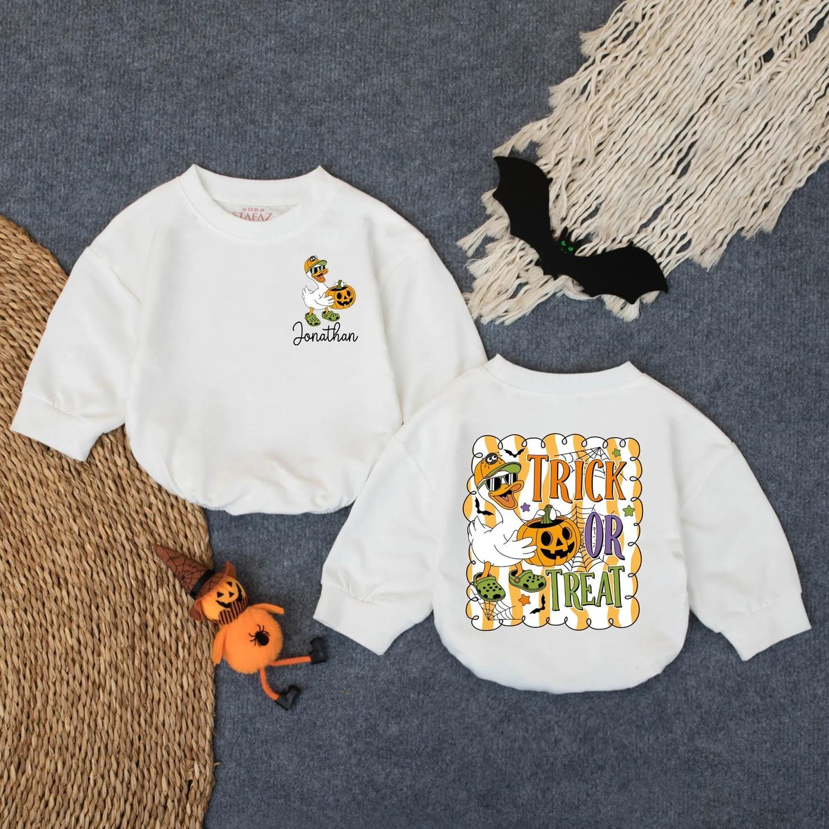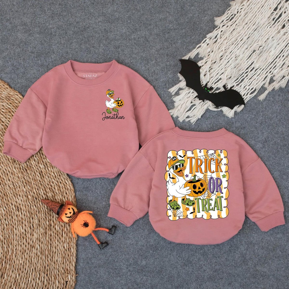 Customized Halloween Goose Trick or Treat Boy Bubble Romper Fall Baby Outfit Spooky Season Clothes F 432