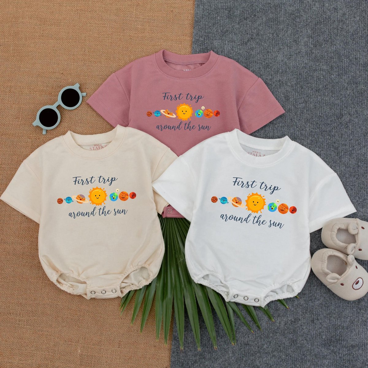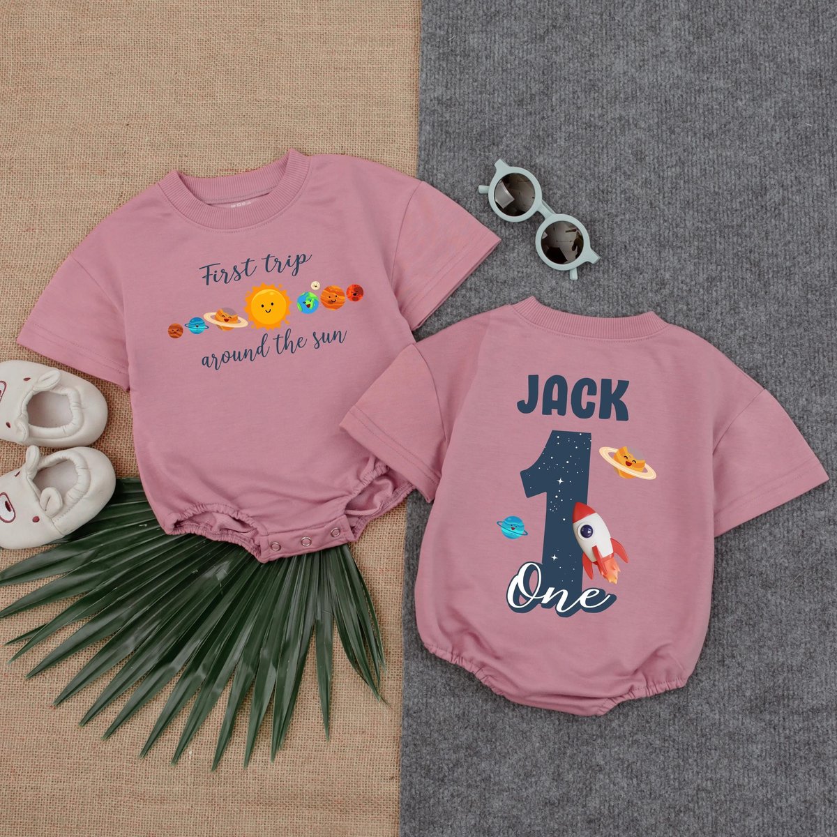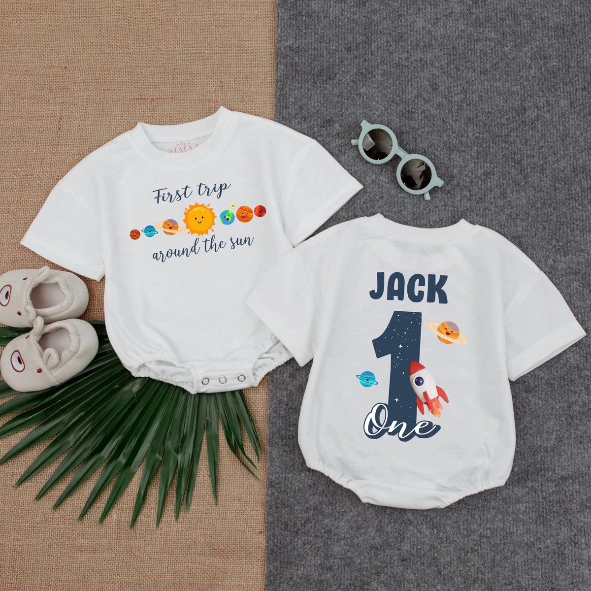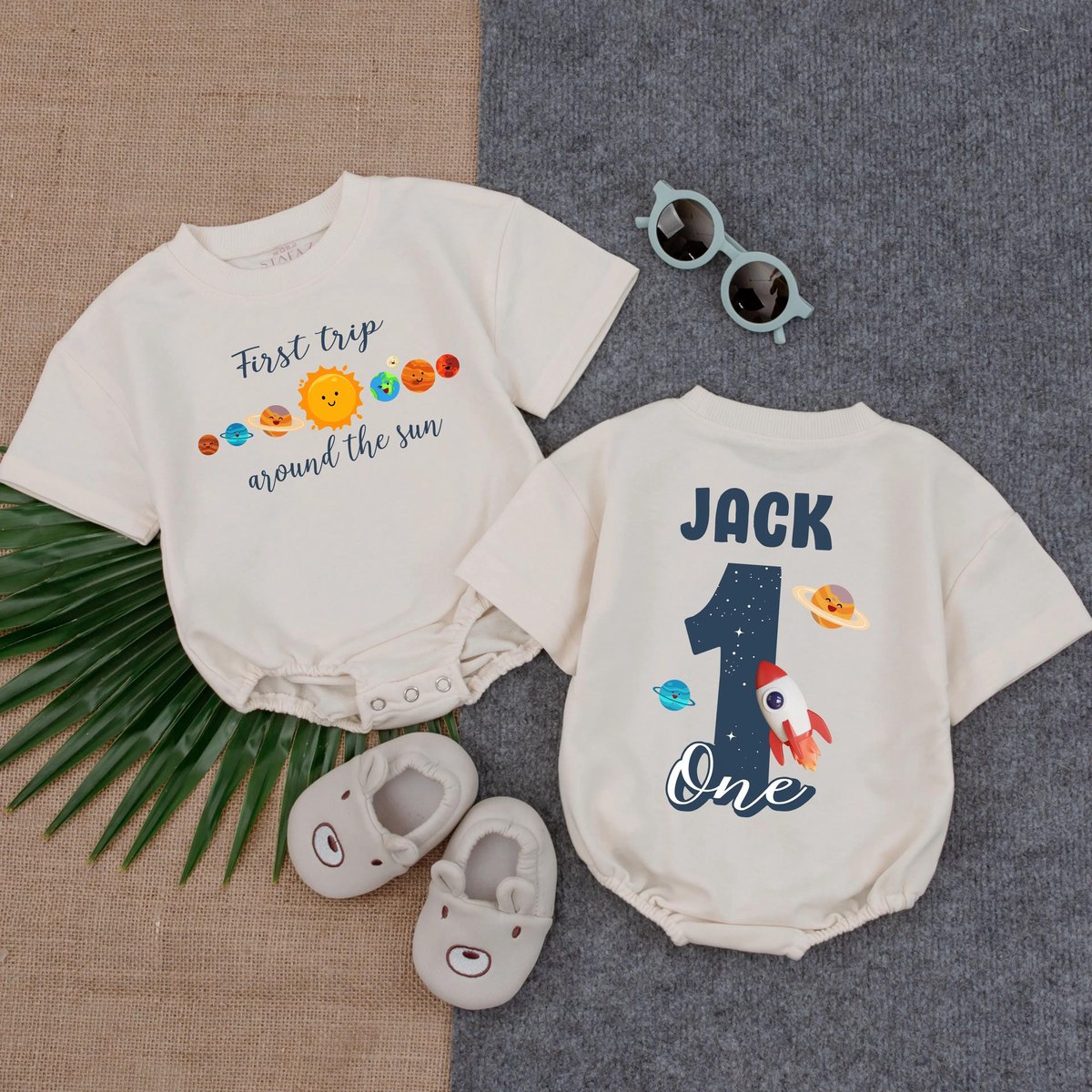 First Trip Around the Sun Boy Romper Space Theme 1st Birthday Bubble Romper Galaxy Baby Outfit One Y 432