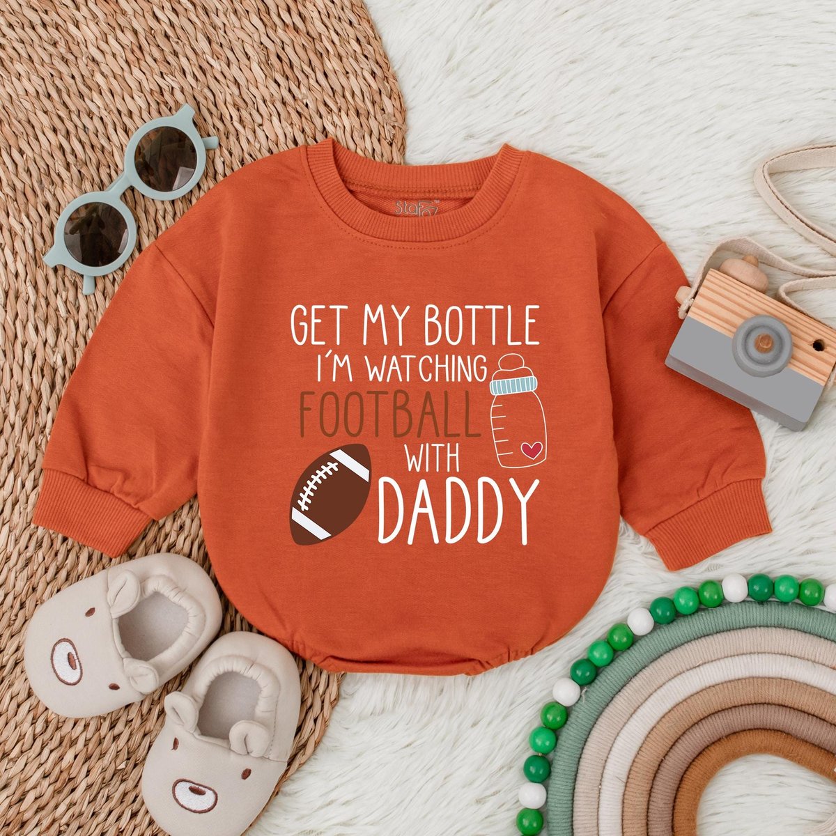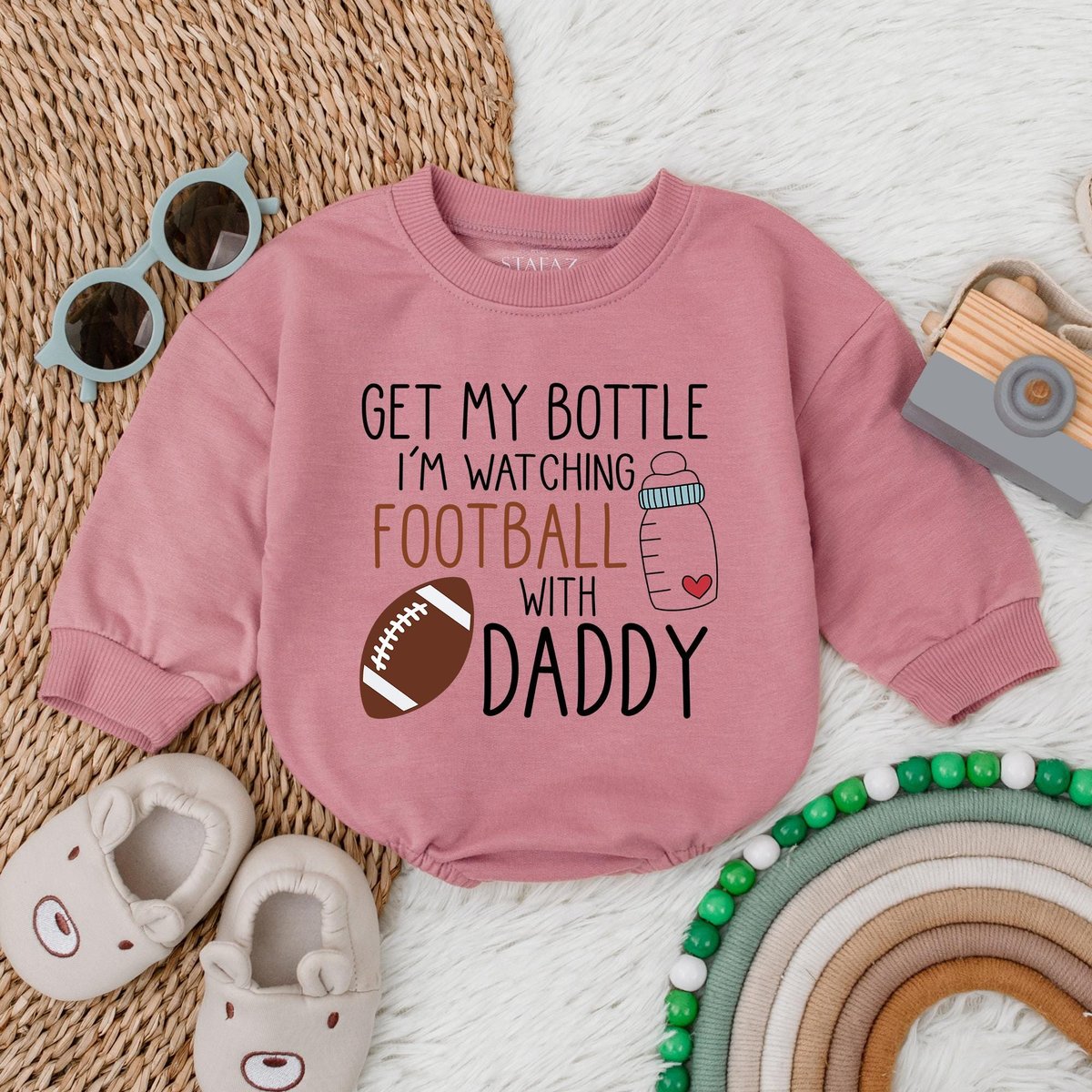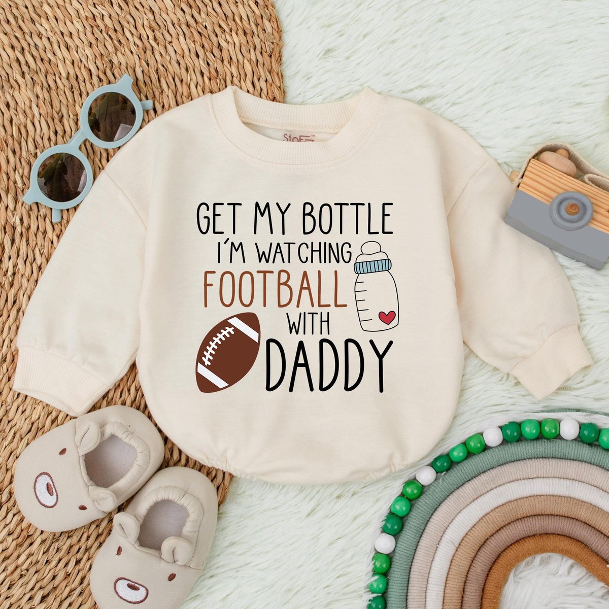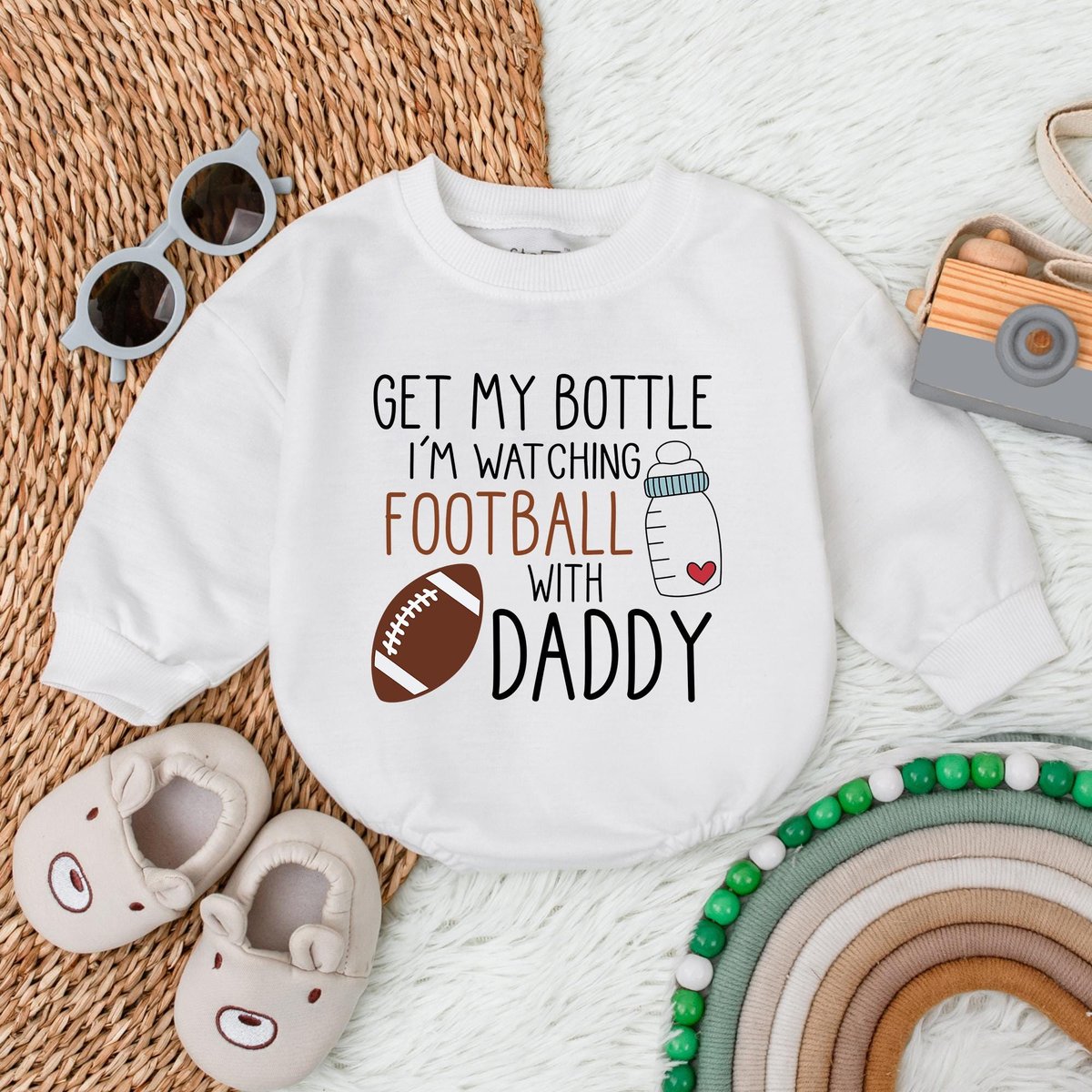Get My Bottle I’m Watching Football with Daddy First Birthday Baby Bubble Romper Football 1st Birth 183