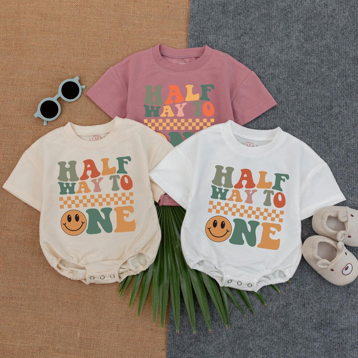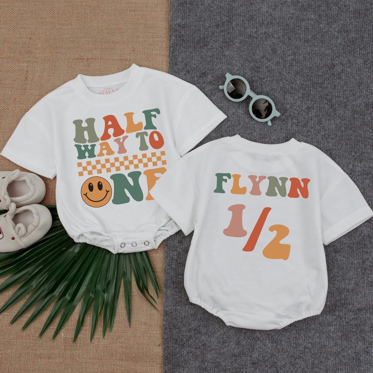 Half Birthday Baby T shirt Bubble Romper with Custom Name 6 Month Bodysuit Halfway to One Outfit 12 190