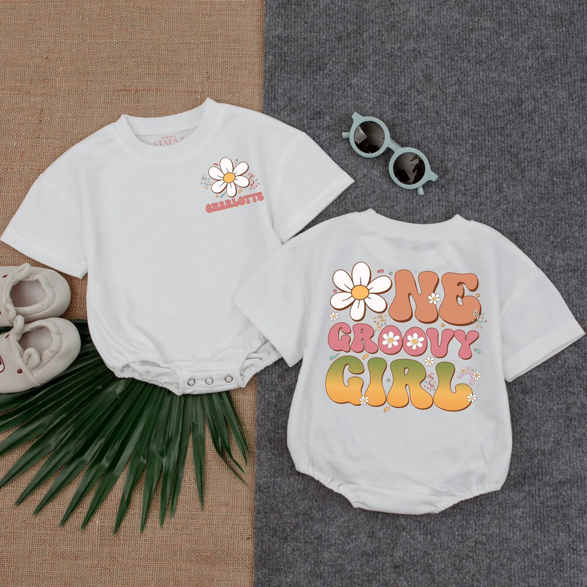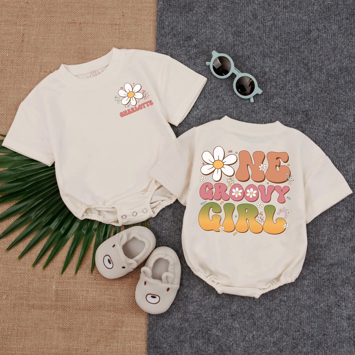 Groovy One First Birthday Short Sleeve Bubble Romper Boho 1st Birthday Outfit Girl Hippie One Piece 432