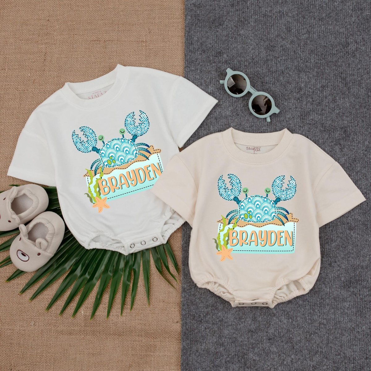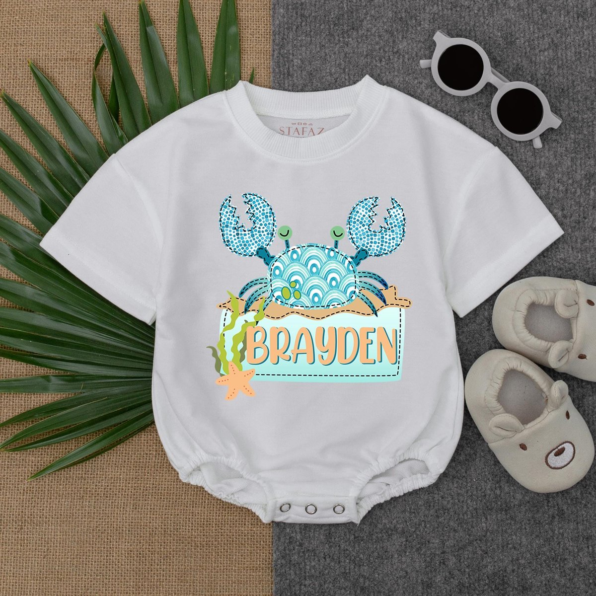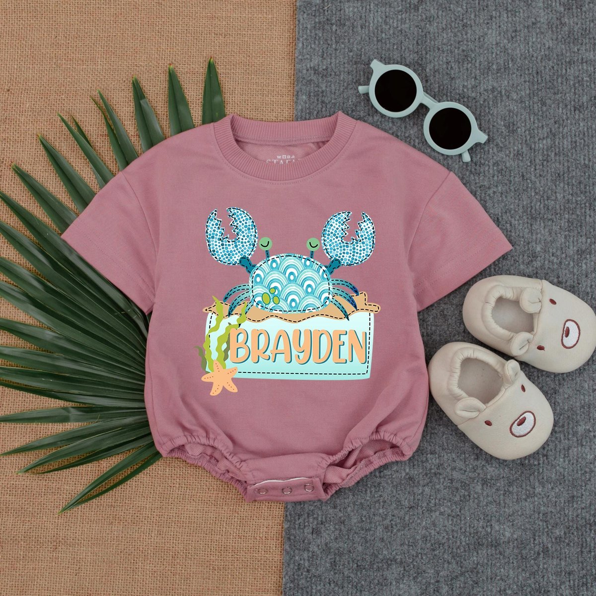 Mosaic Crab With Beachy Bubble Romper Customized Name Baby Romper Coastal Baby Outfit Beach Theme To 188