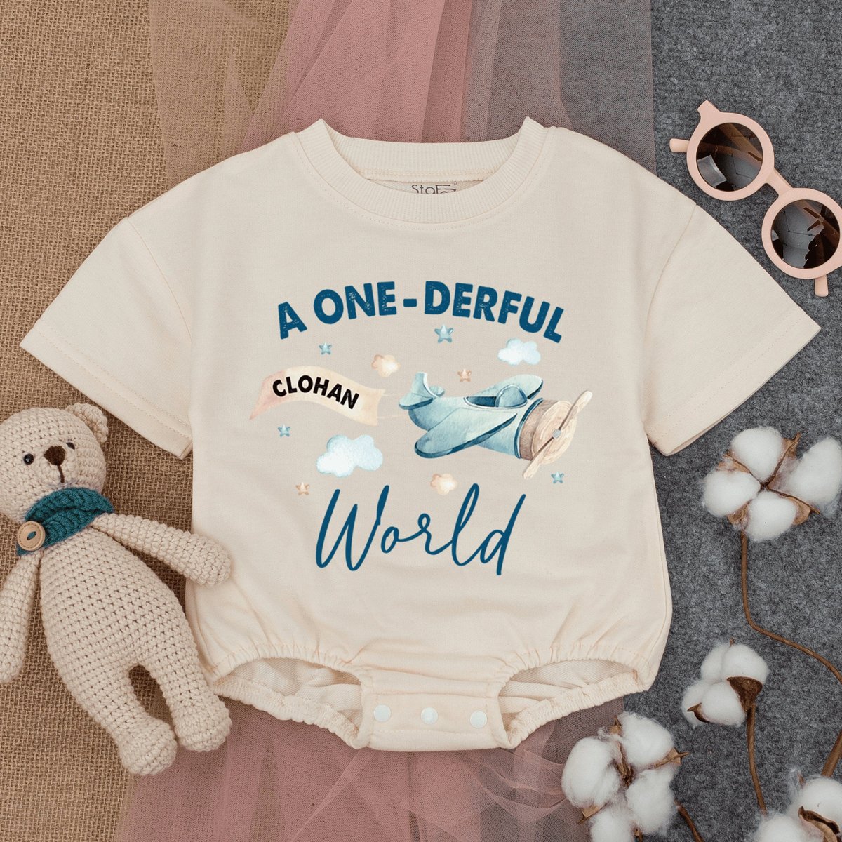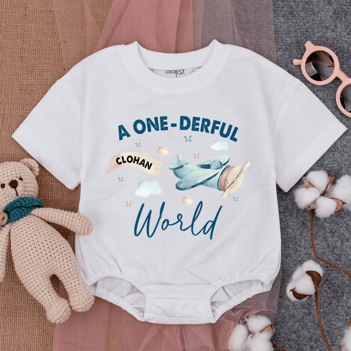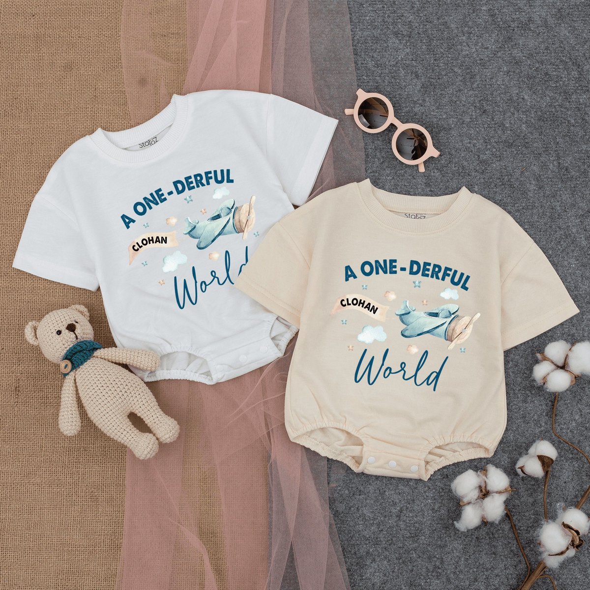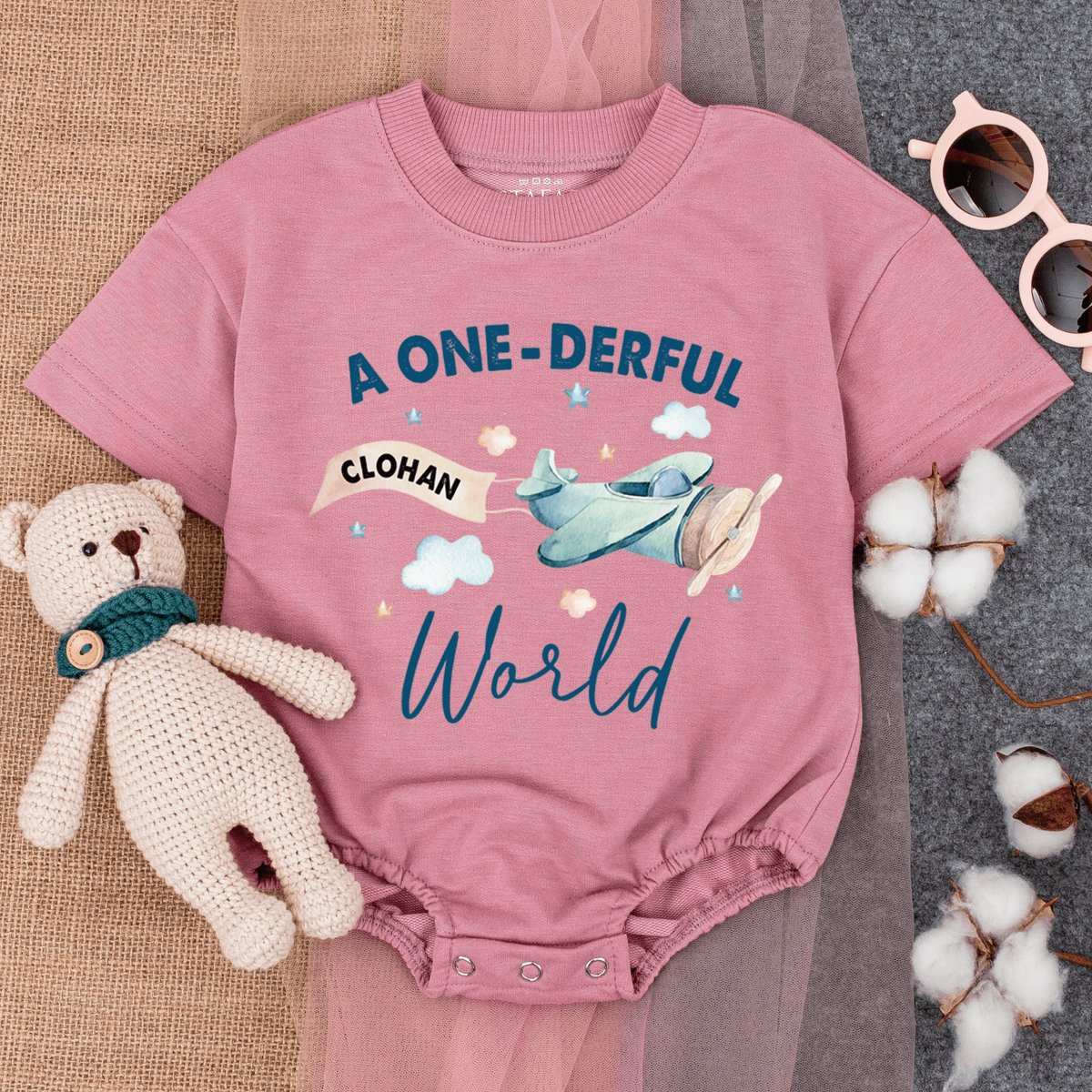 Personalized A Onederful World Romper Short Sleeve Baby First Birthday Airplane First Birthday 1st 169