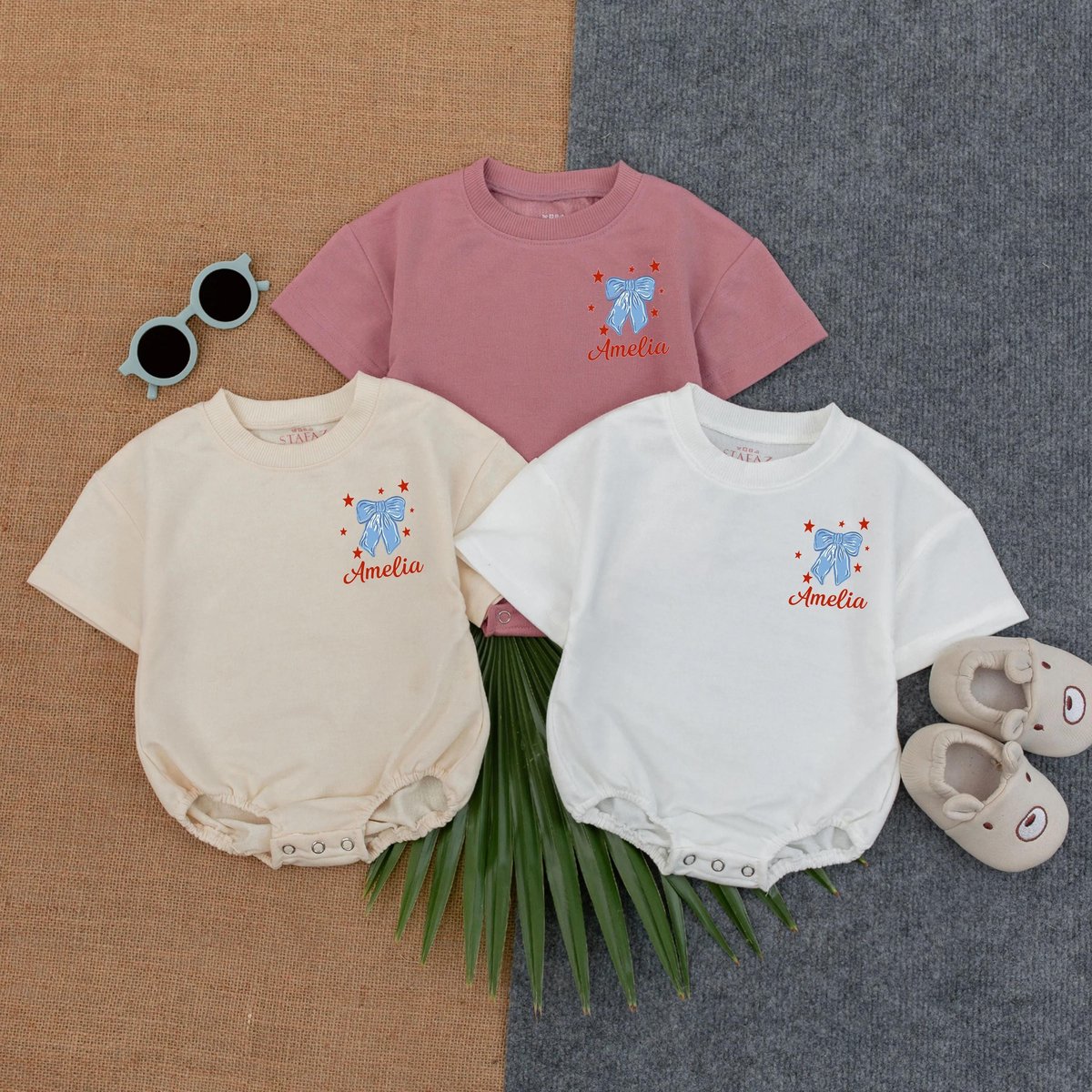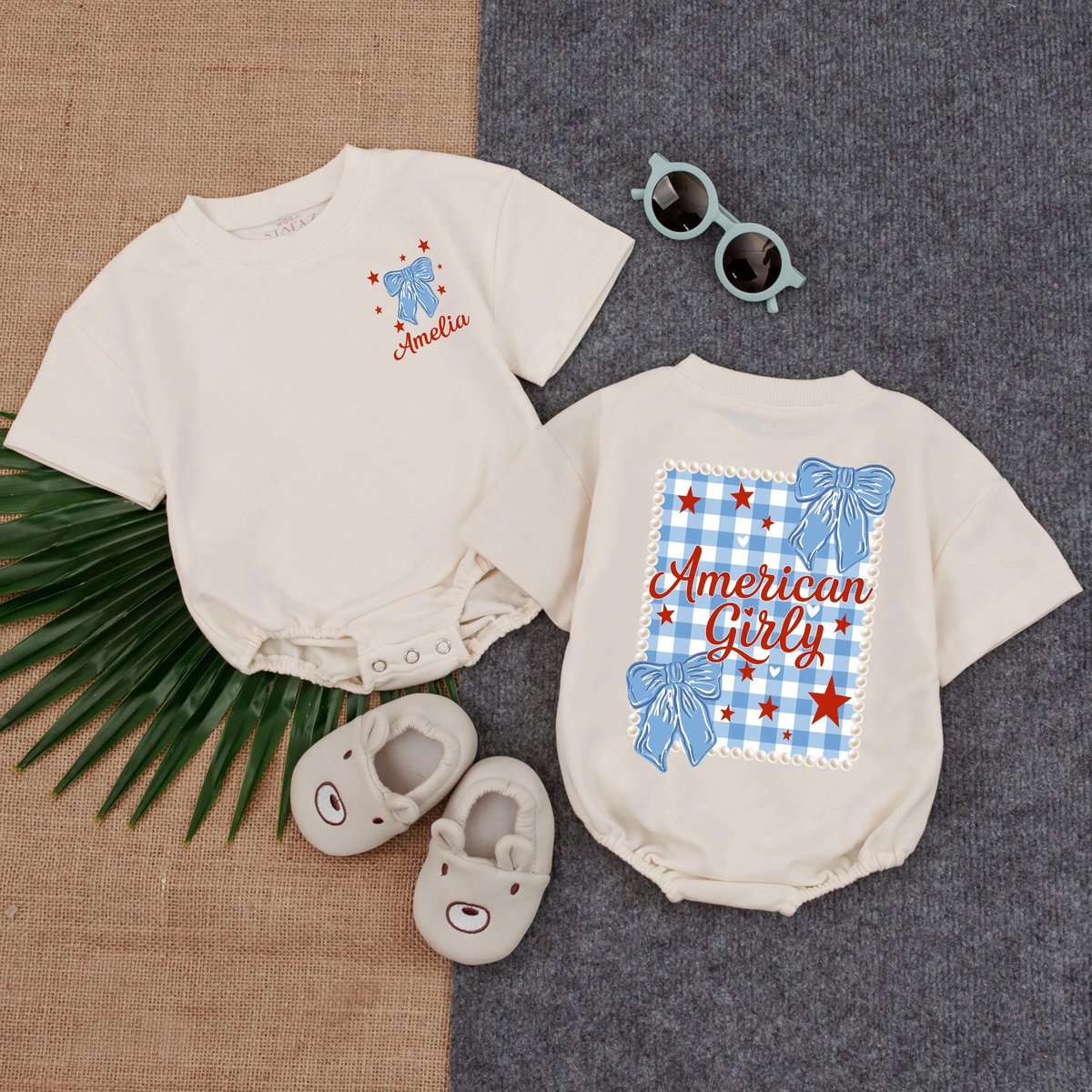 Personalized American Girly Bow T Shirt Bubble Romper Girl 4th of July Outfit Cute Baby Independence 430