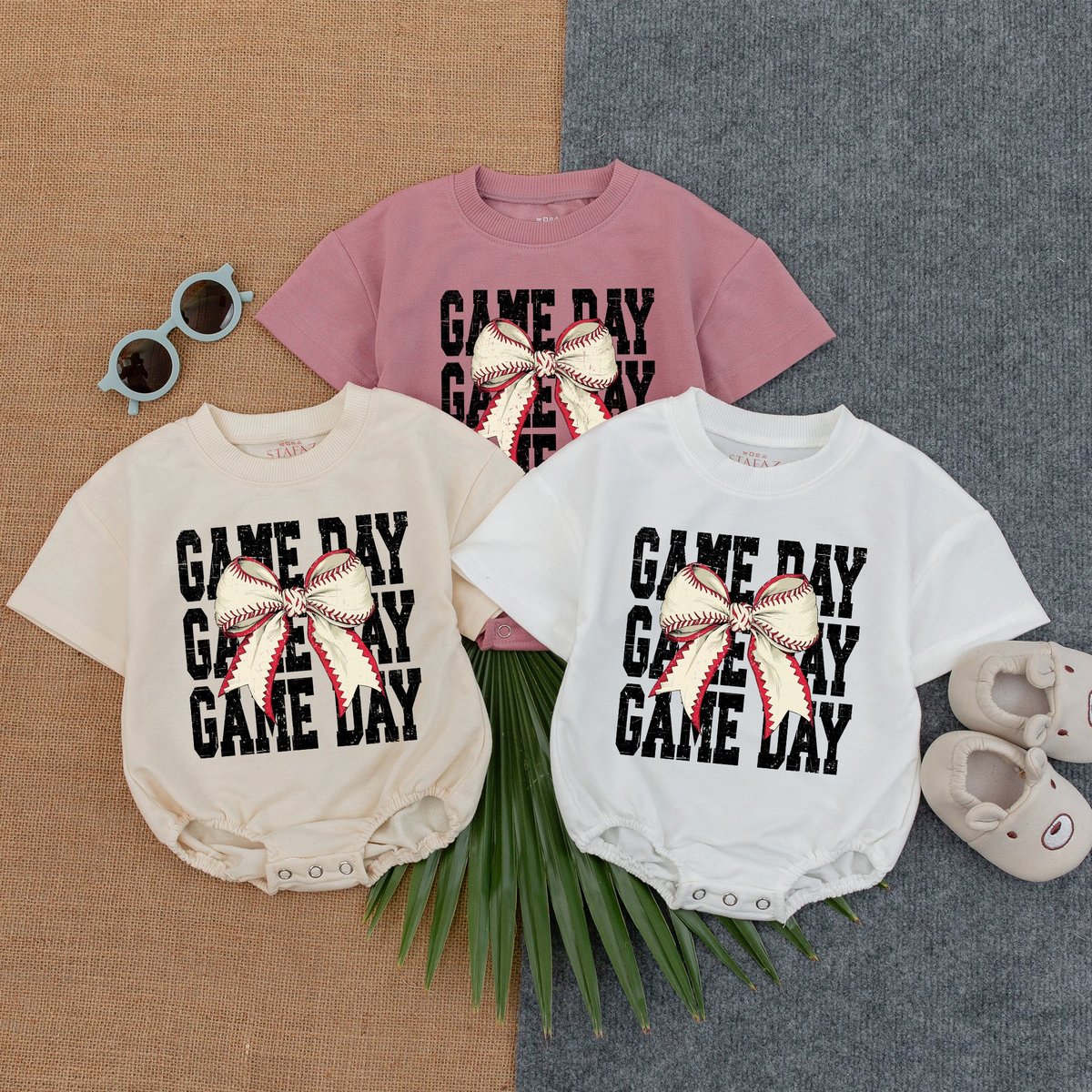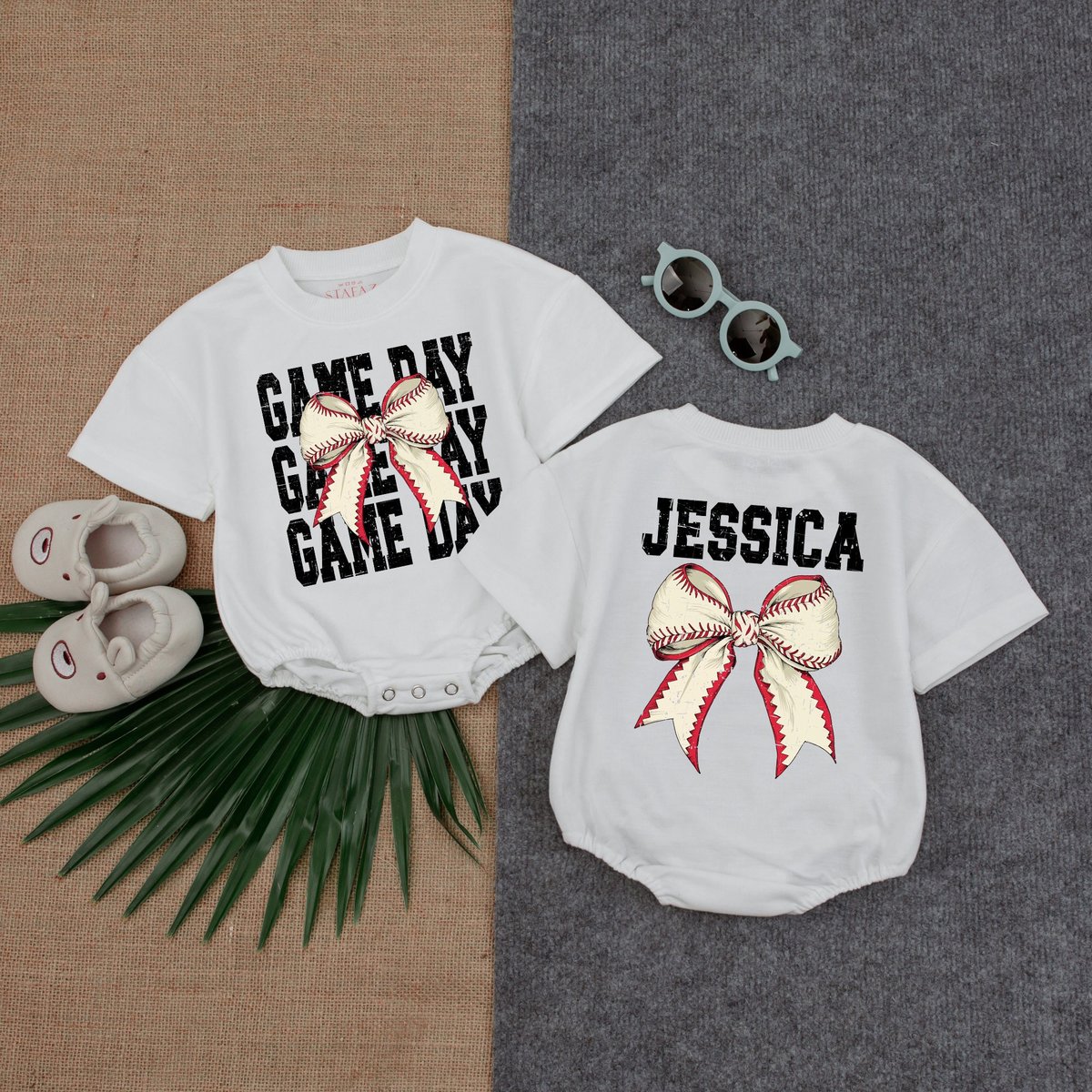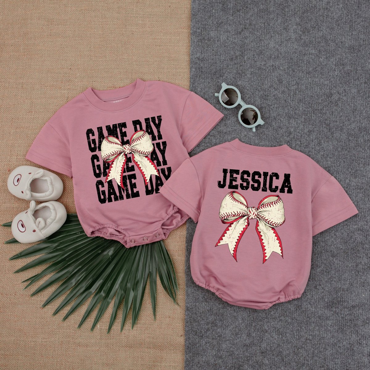 Personalized Baseball Bow Baby Romper Baseball Season Short Sleeve Romper Name and Bow Game Day Baby 177
