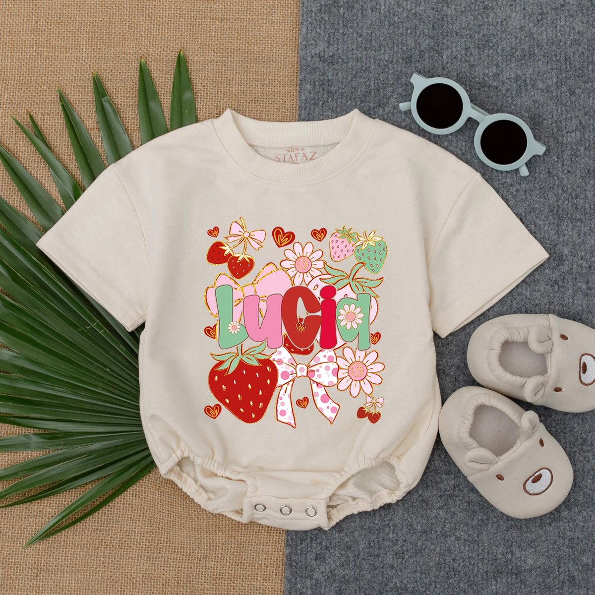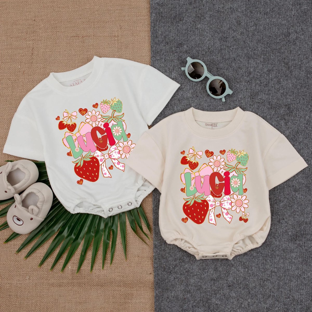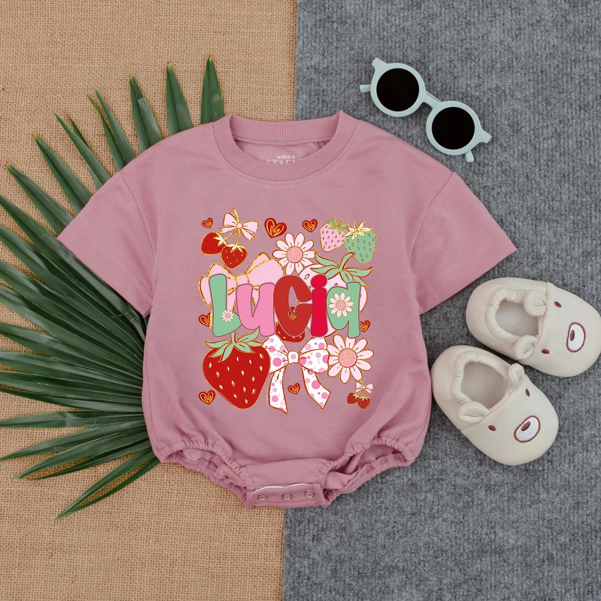 Personalized Strawberry Name T shirt Bubble Romper Baby Girl Clothes Infant Outfit with Bow Baby Gif 431