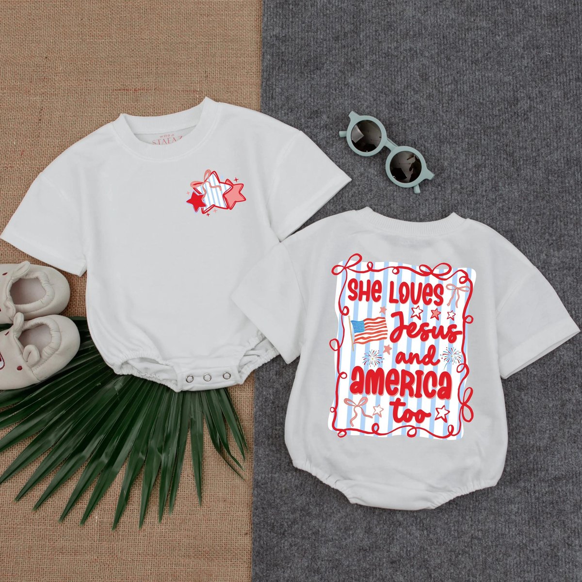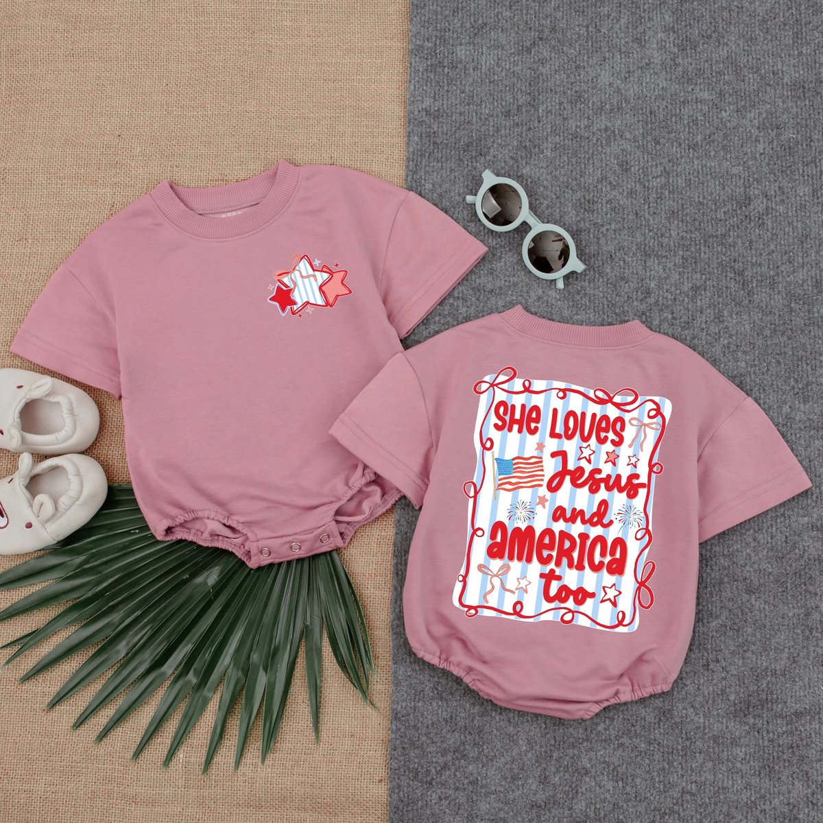 She Loves Jesus and America Too Bubble Romper Christian Baby Girl Outfit Patriotic Summer Clothes Sh 430