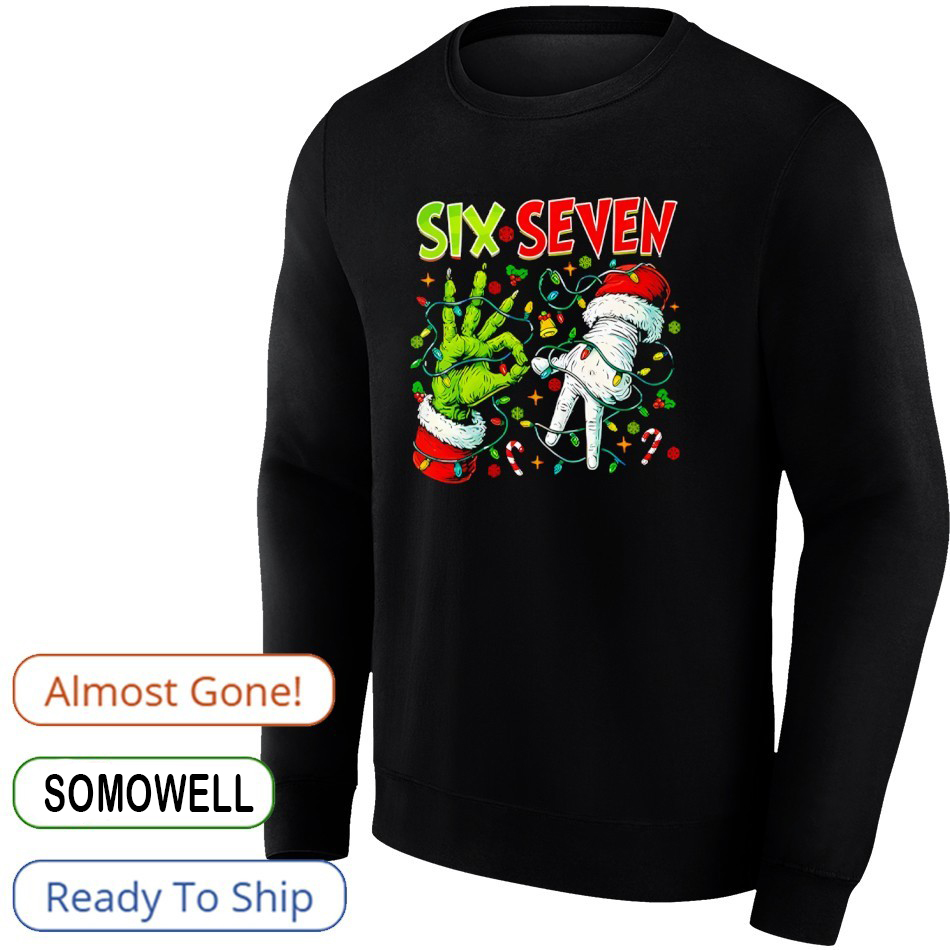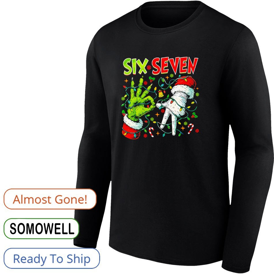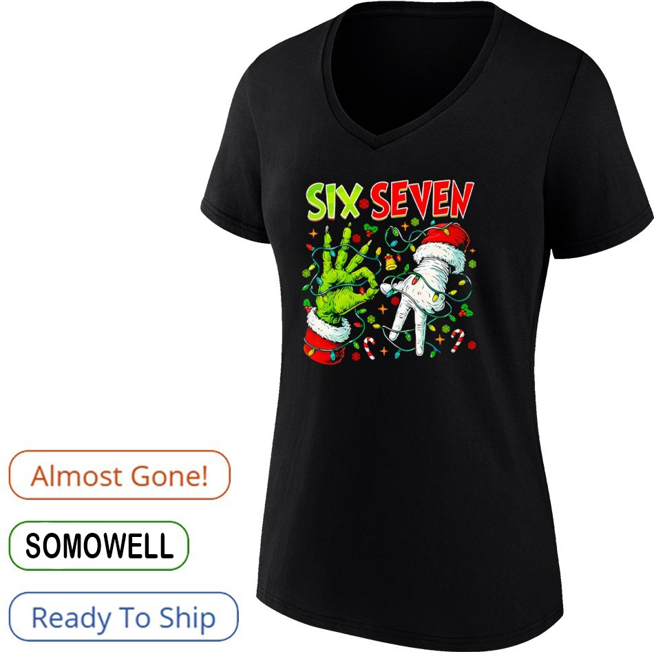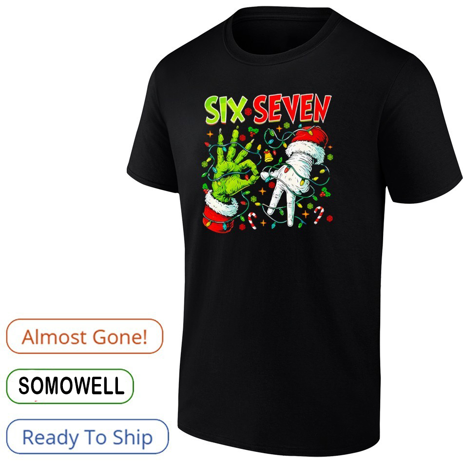 Funny Grinch Six Seven Christmas T-Shirt – Santa Hands Holiday Lights Meme Tee