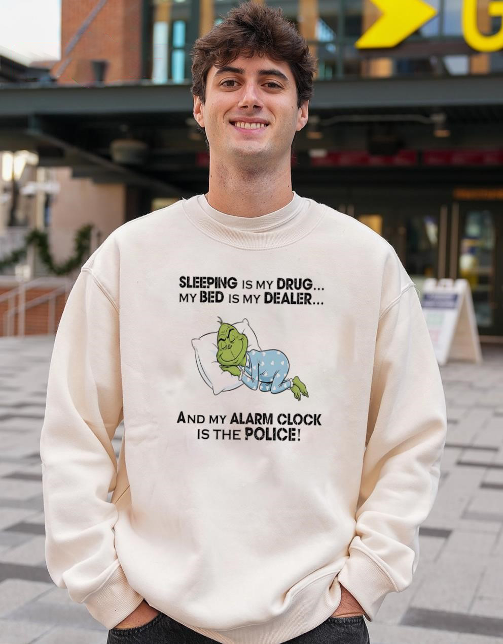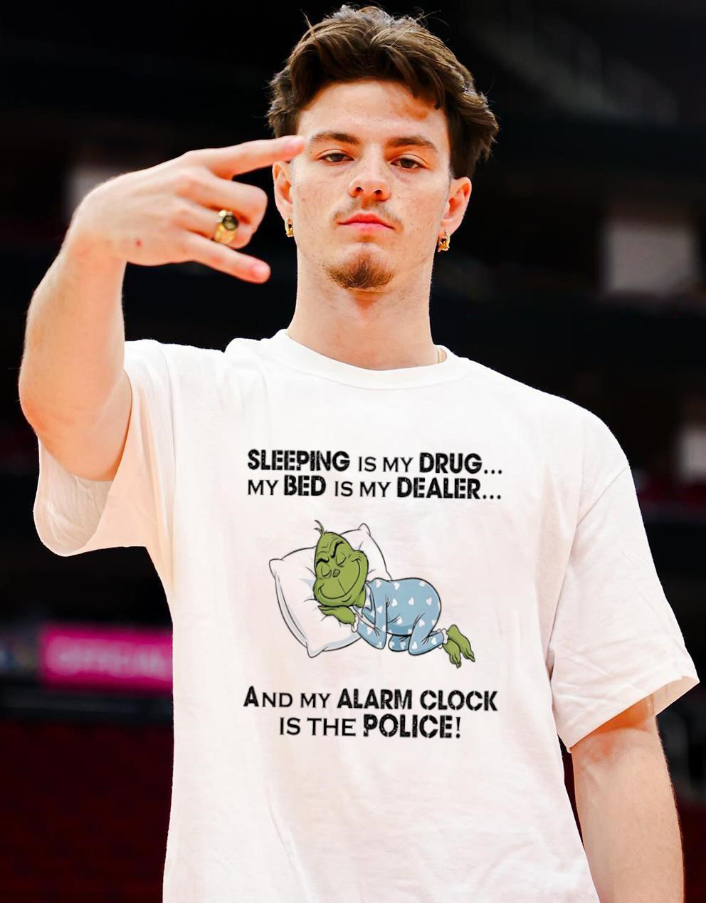 Funny Grinch Sleep Quote T-Shirt – Sleeping Is My Drug My Bed Is My Dealer My Alarm Clock Is The Police Sarcastic Christmas Tee