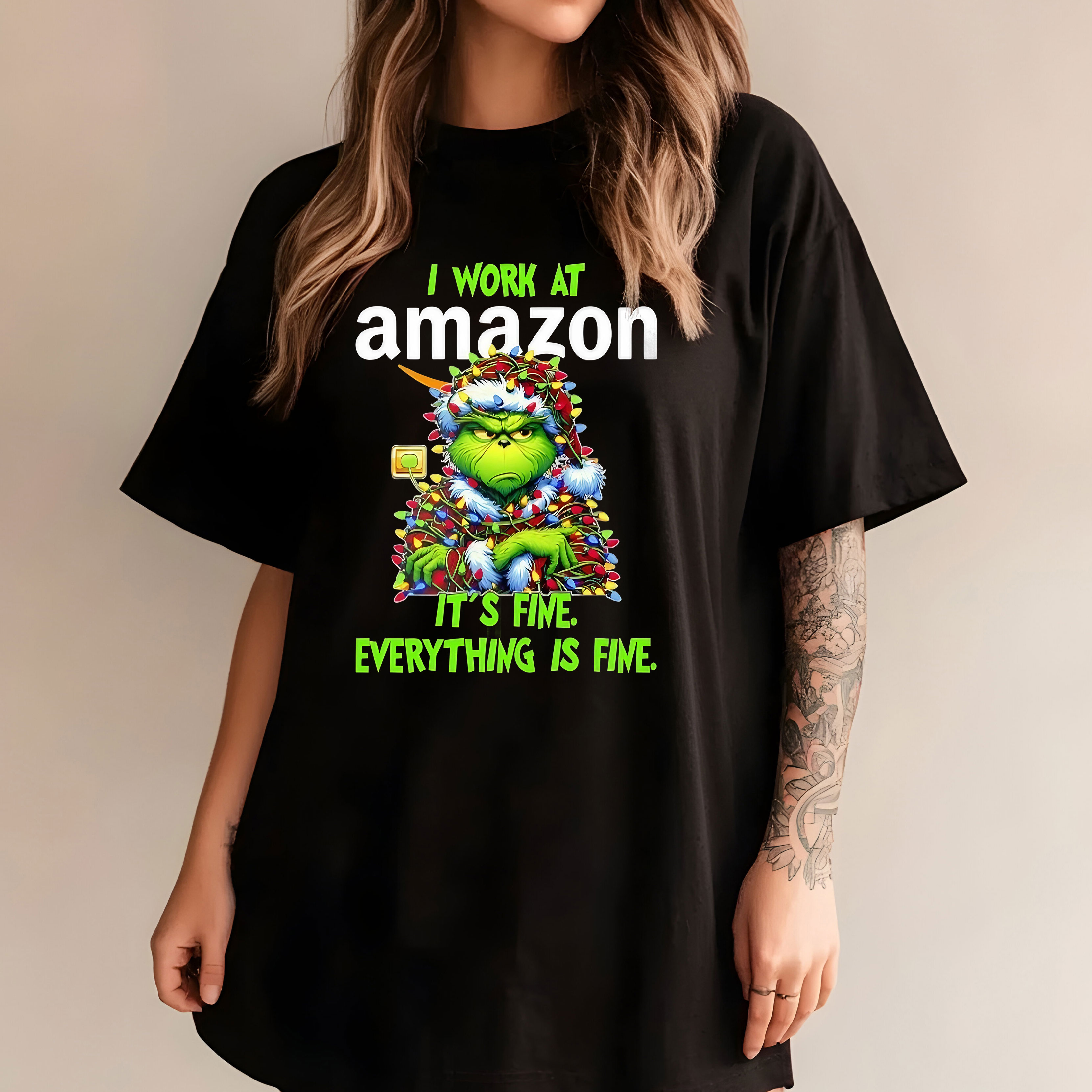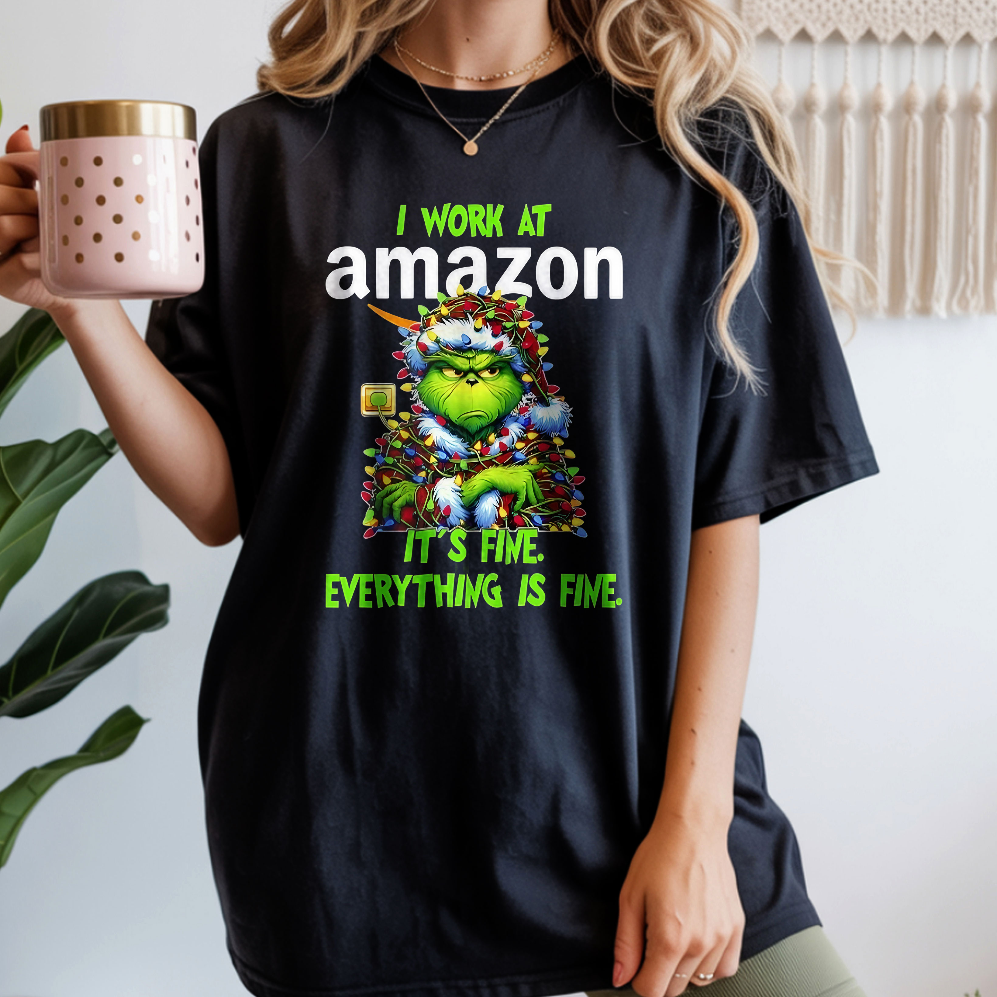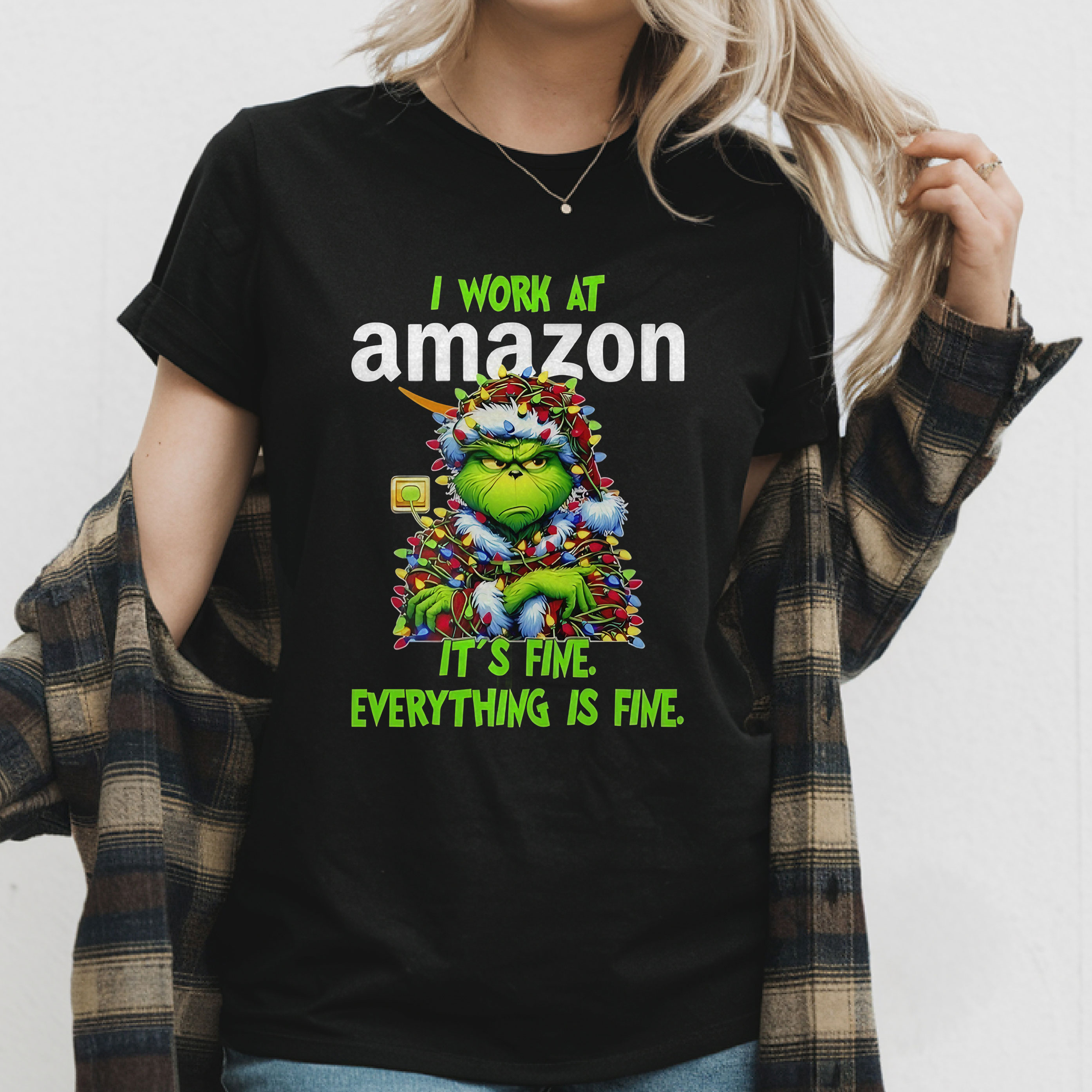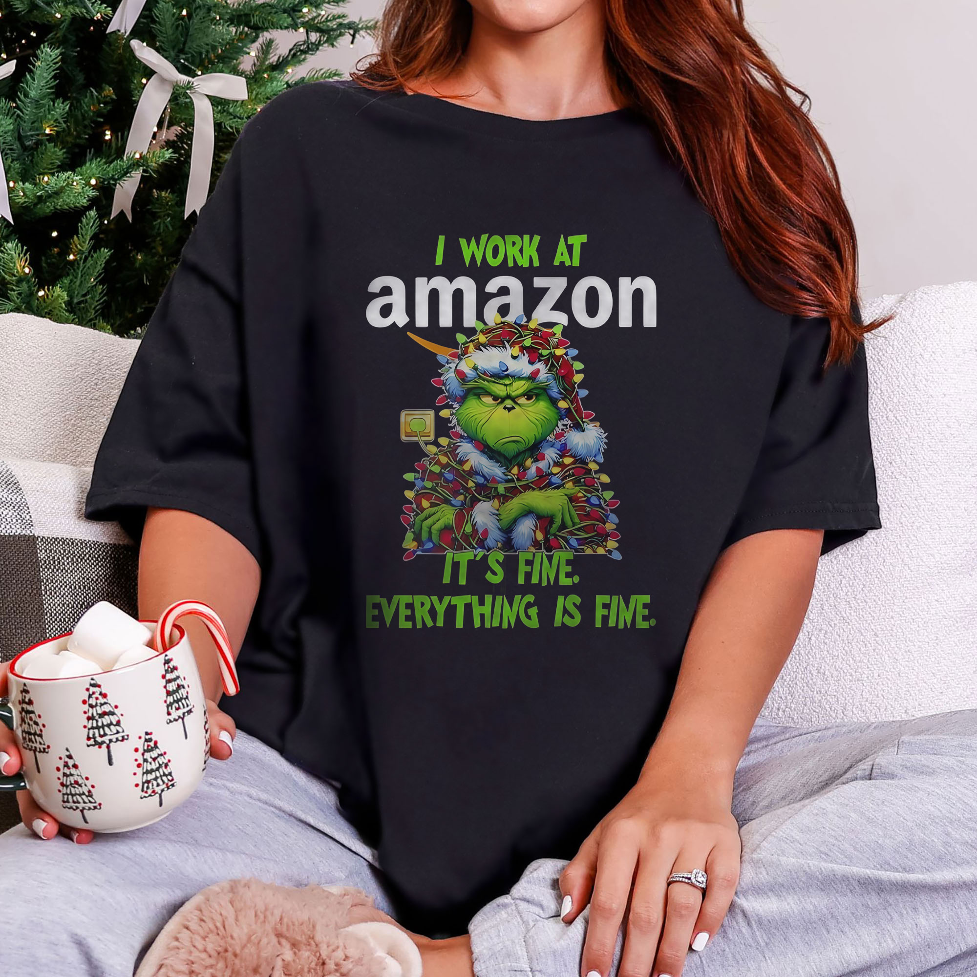 Grinch Quote Amazon Christmas T-Shirt – Funny I Work At Amazon It’s Fine Everything Is Fine Vintage Bootleg Holiday Tee