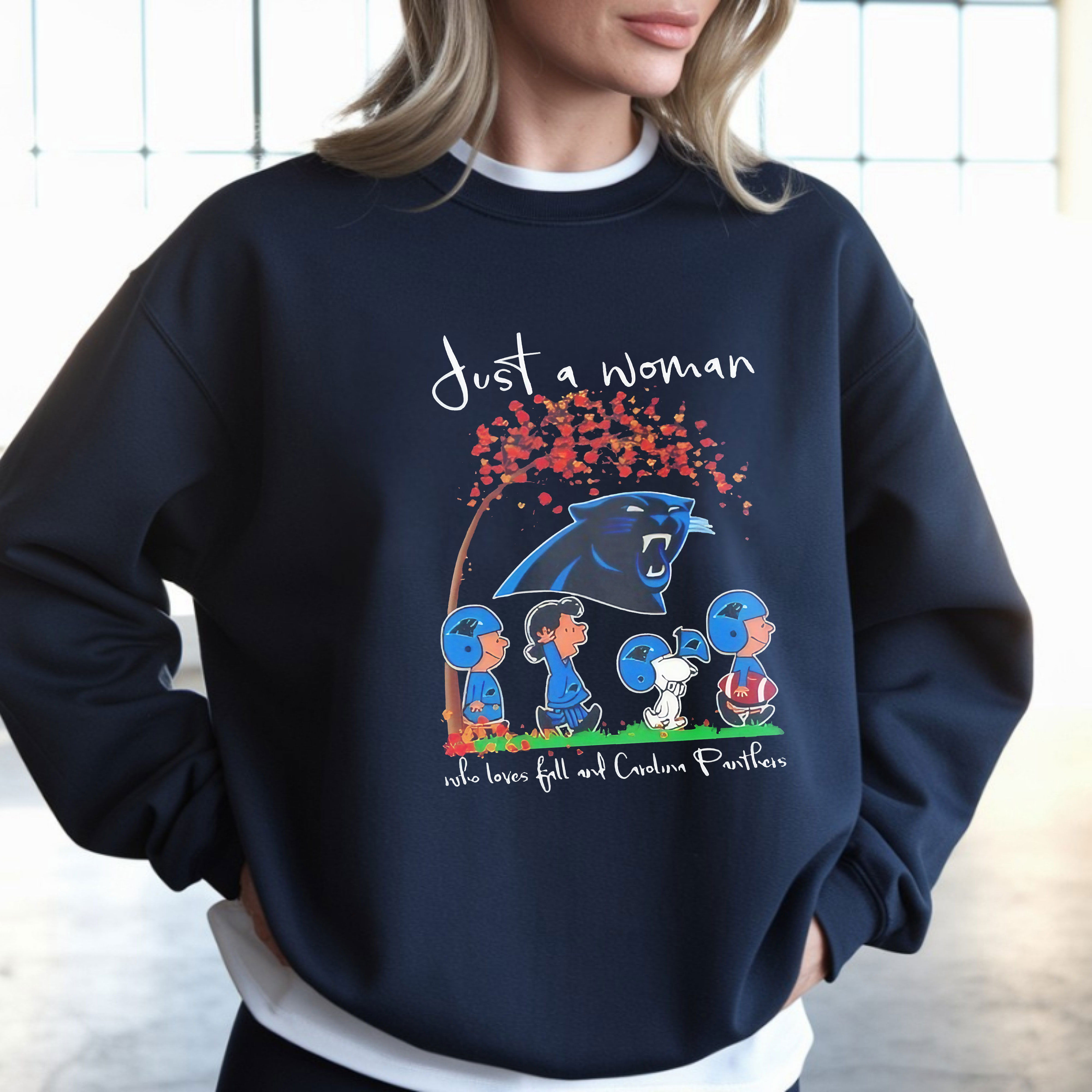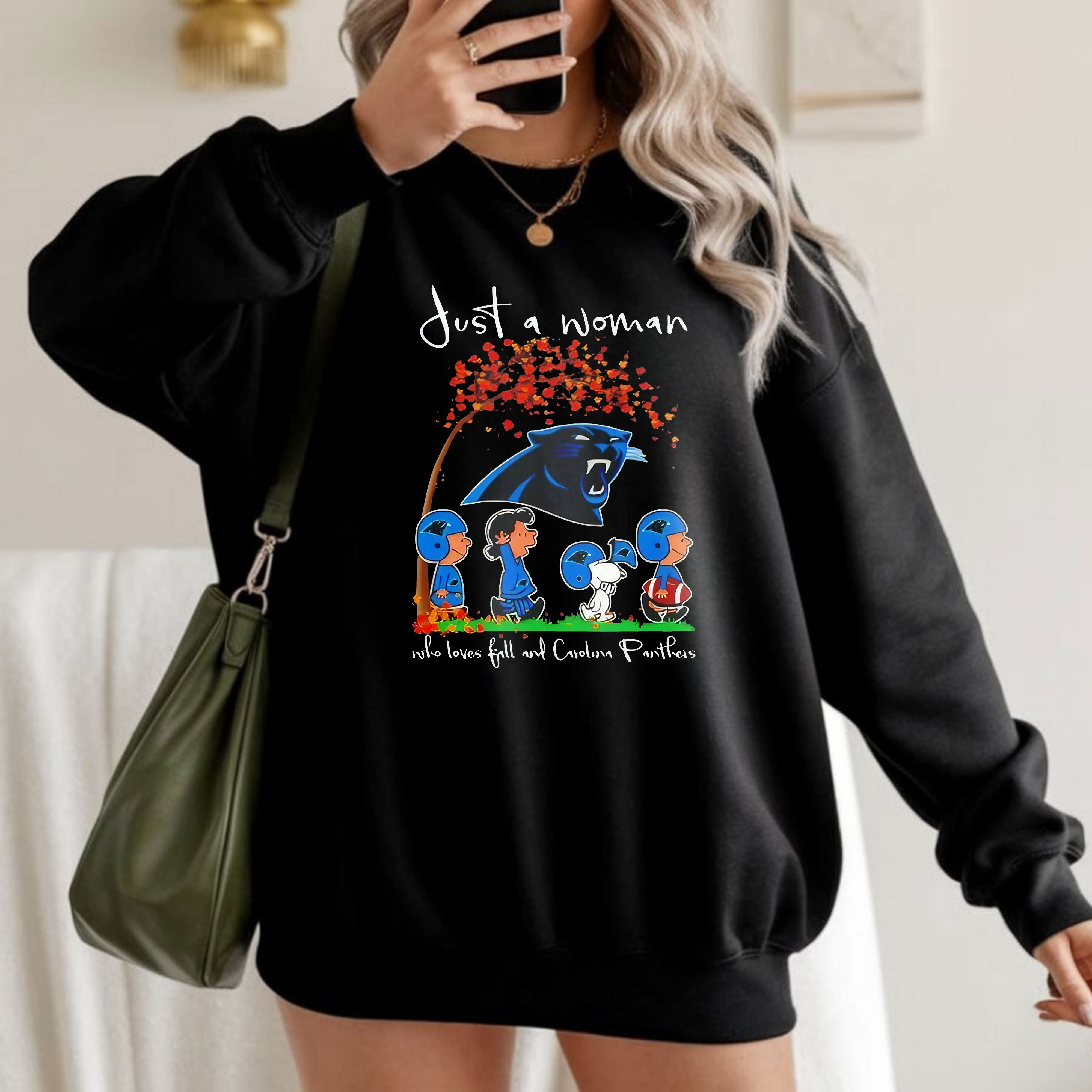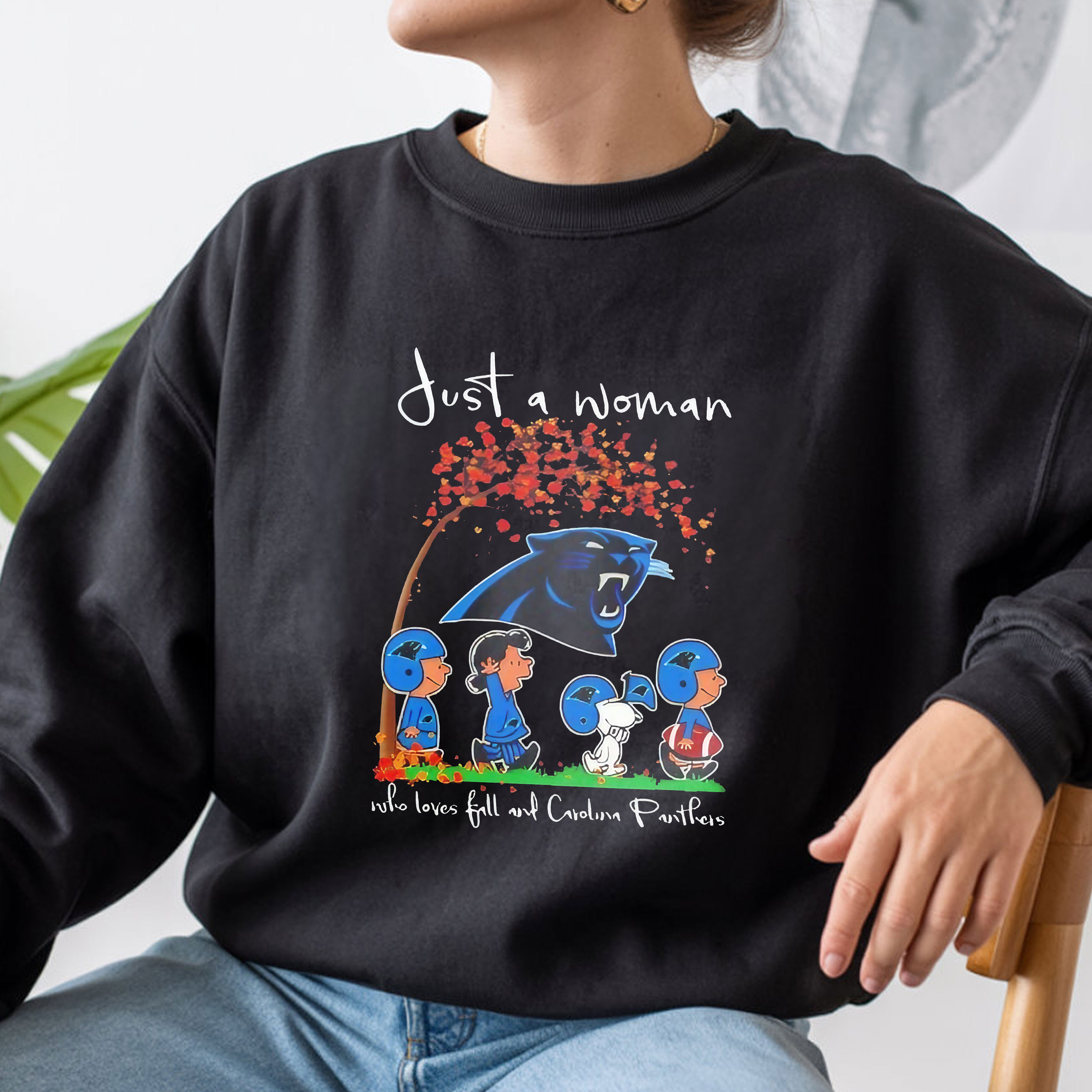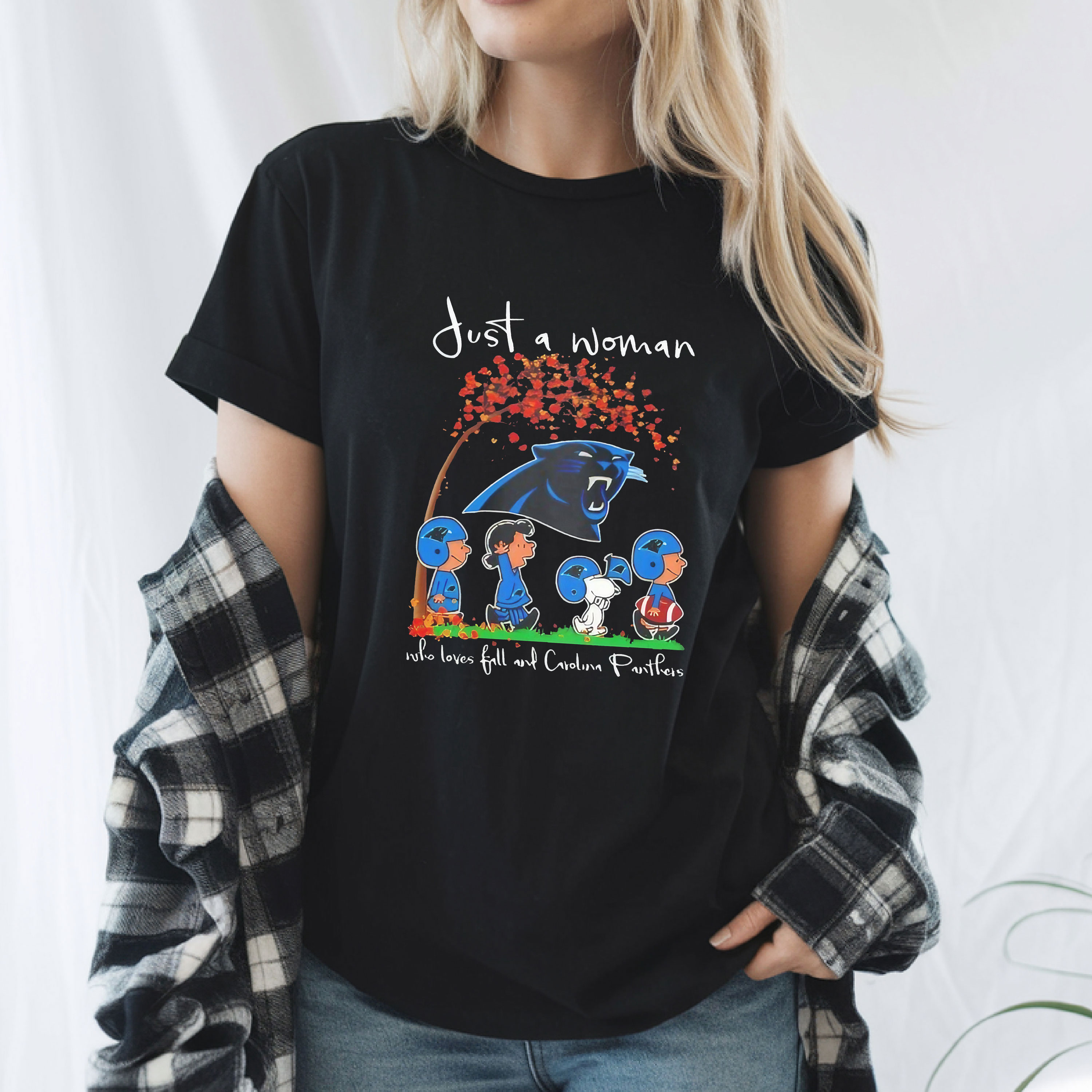 Peanuts Just a Woman Who Loves Fall and Carolina Panthers Team Happy Fall NFL Football Autumn Vintage Bootleg Seasonal Apparel – T-Shirt, Hoodie & Sweatshirt