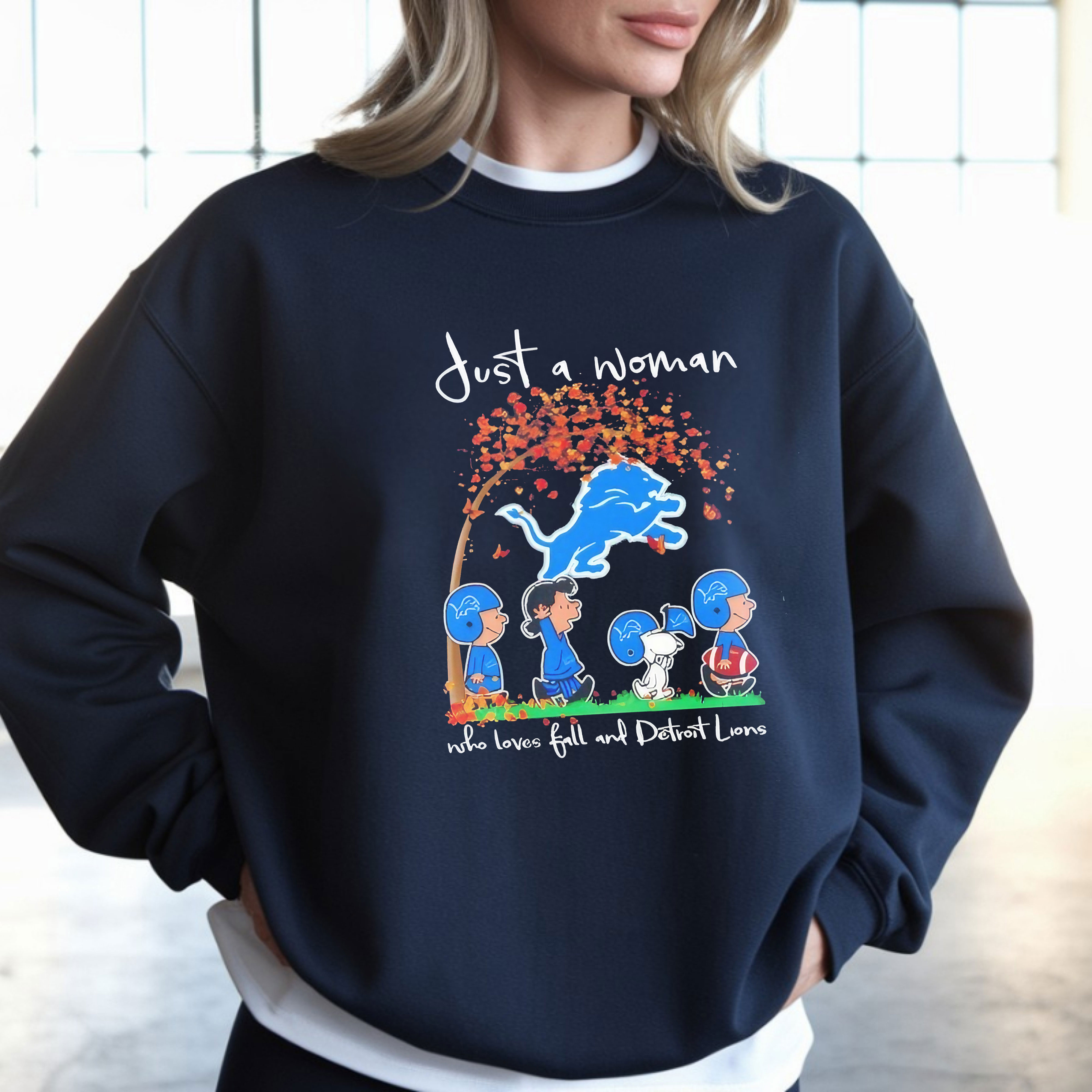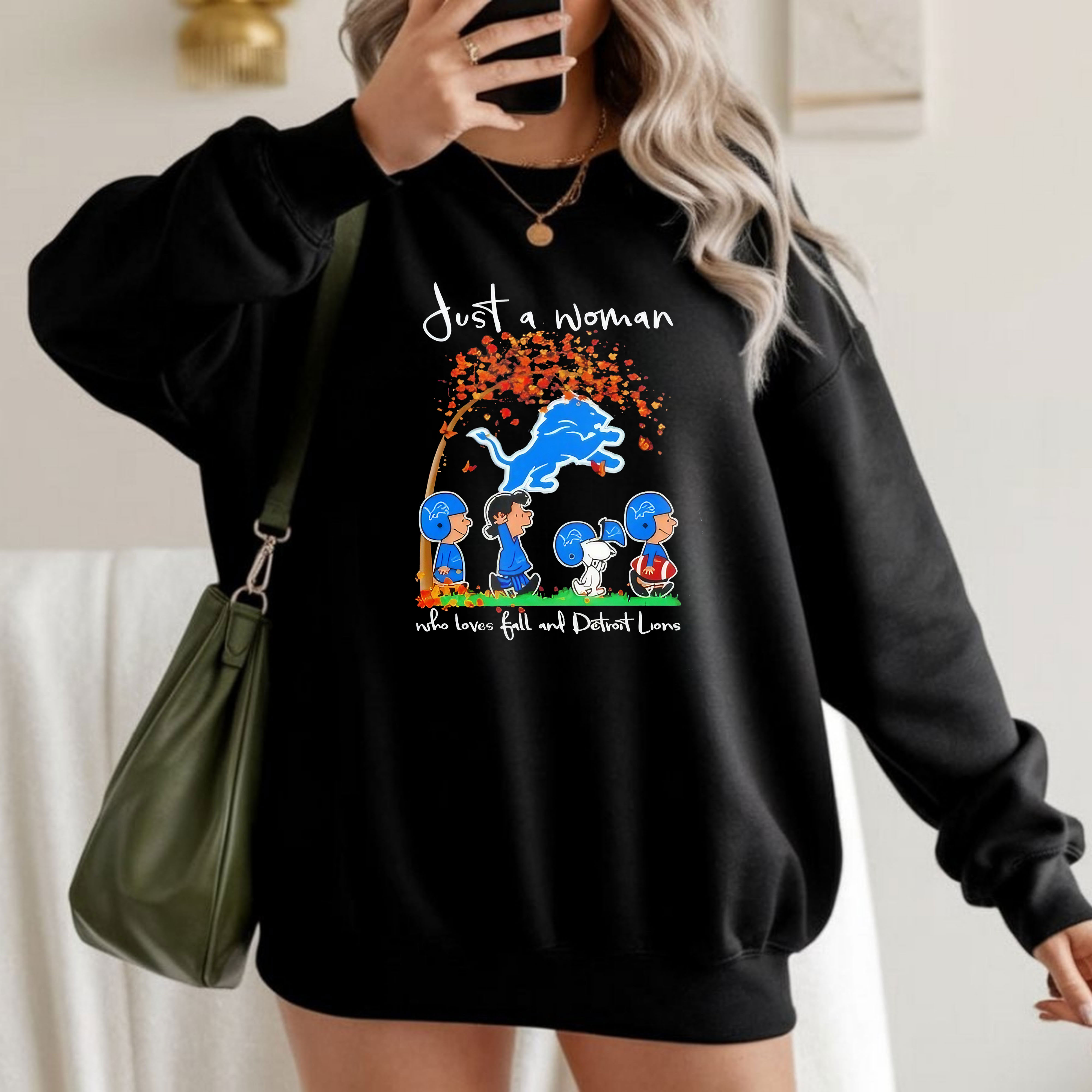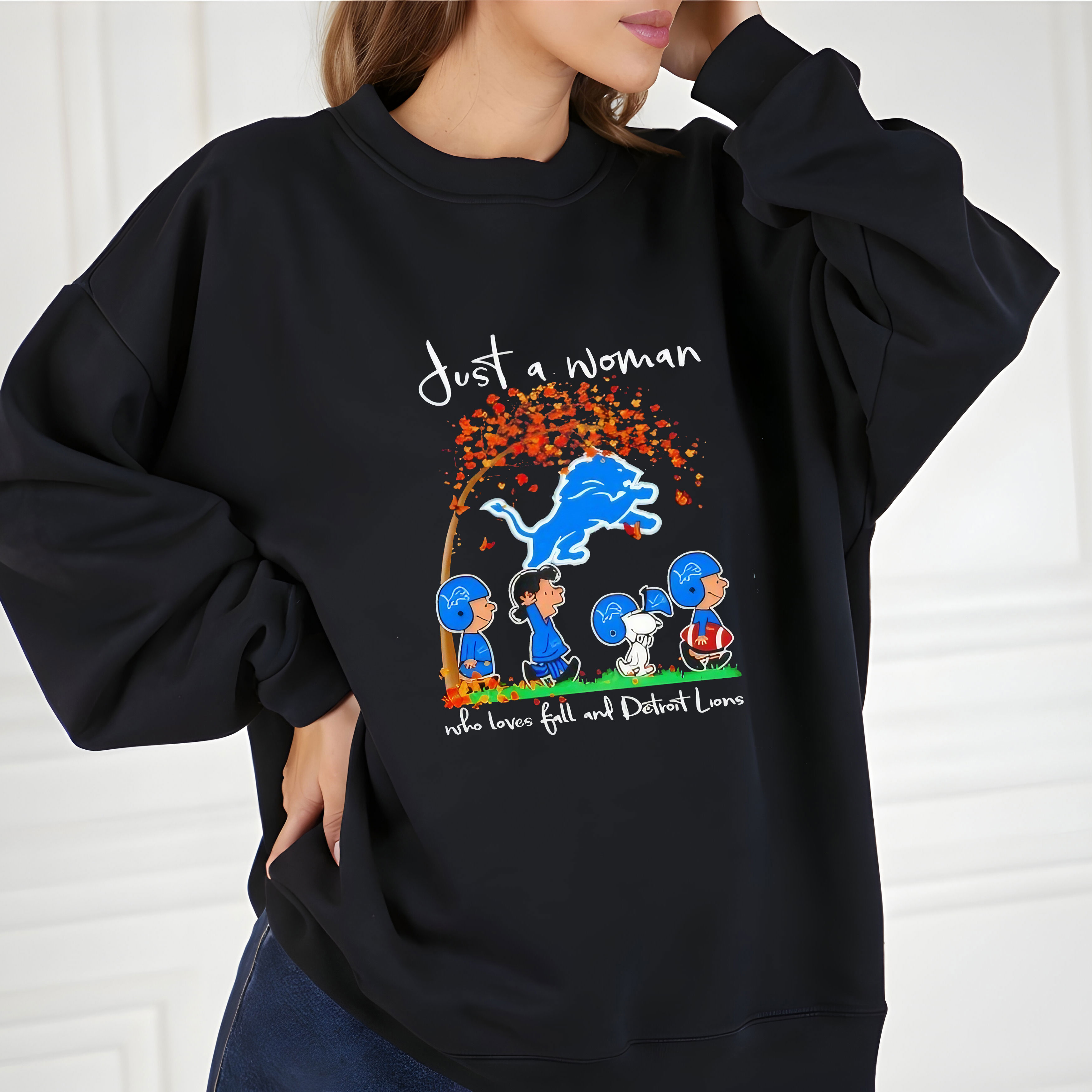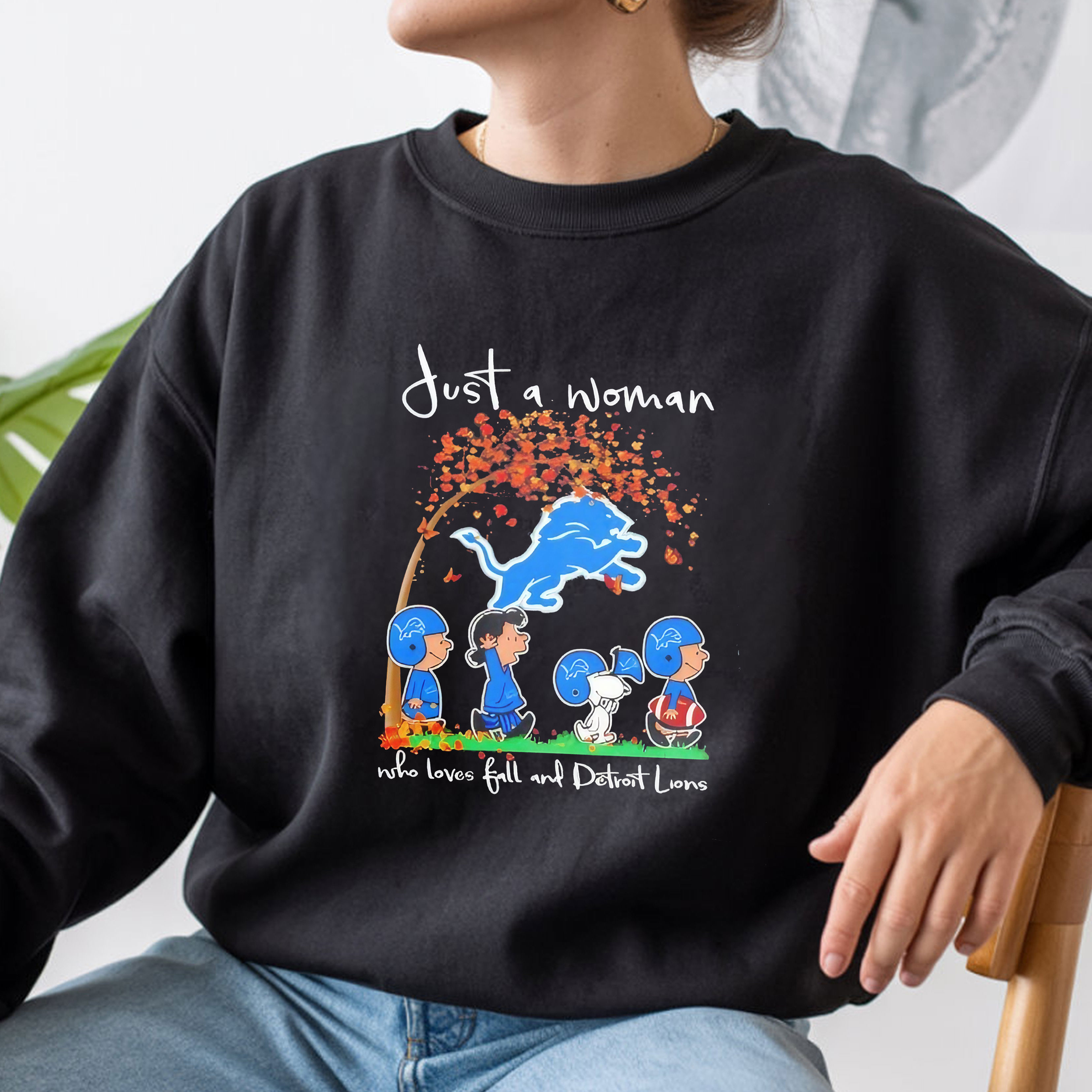 Peanuts Just a Woman Who Loves Fall and Detroit Lions Team Happy Fall NFL Football Autumn Vintage Bootleg Seasonal Apparel – T-Shirt, Hoodie & Sweatshirt