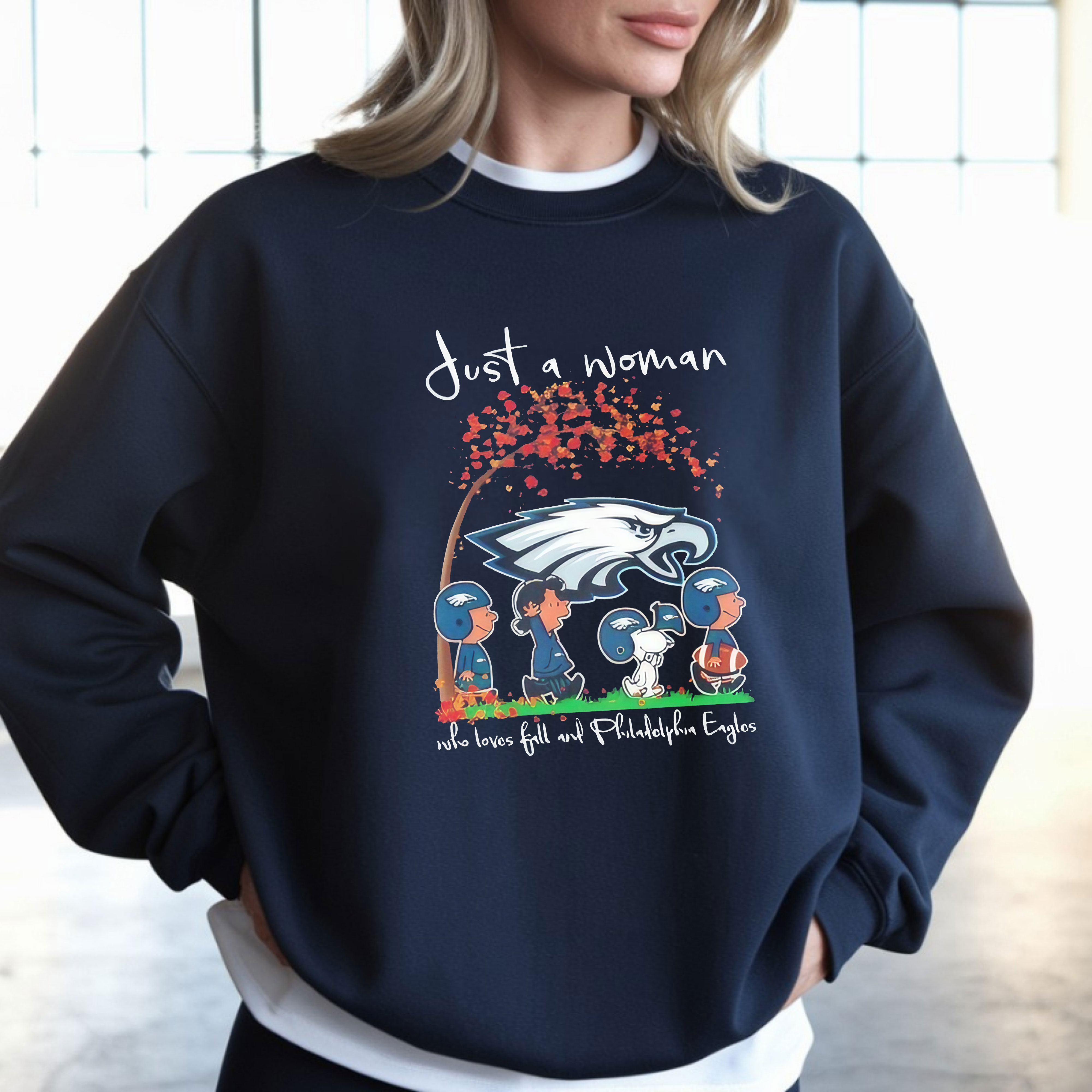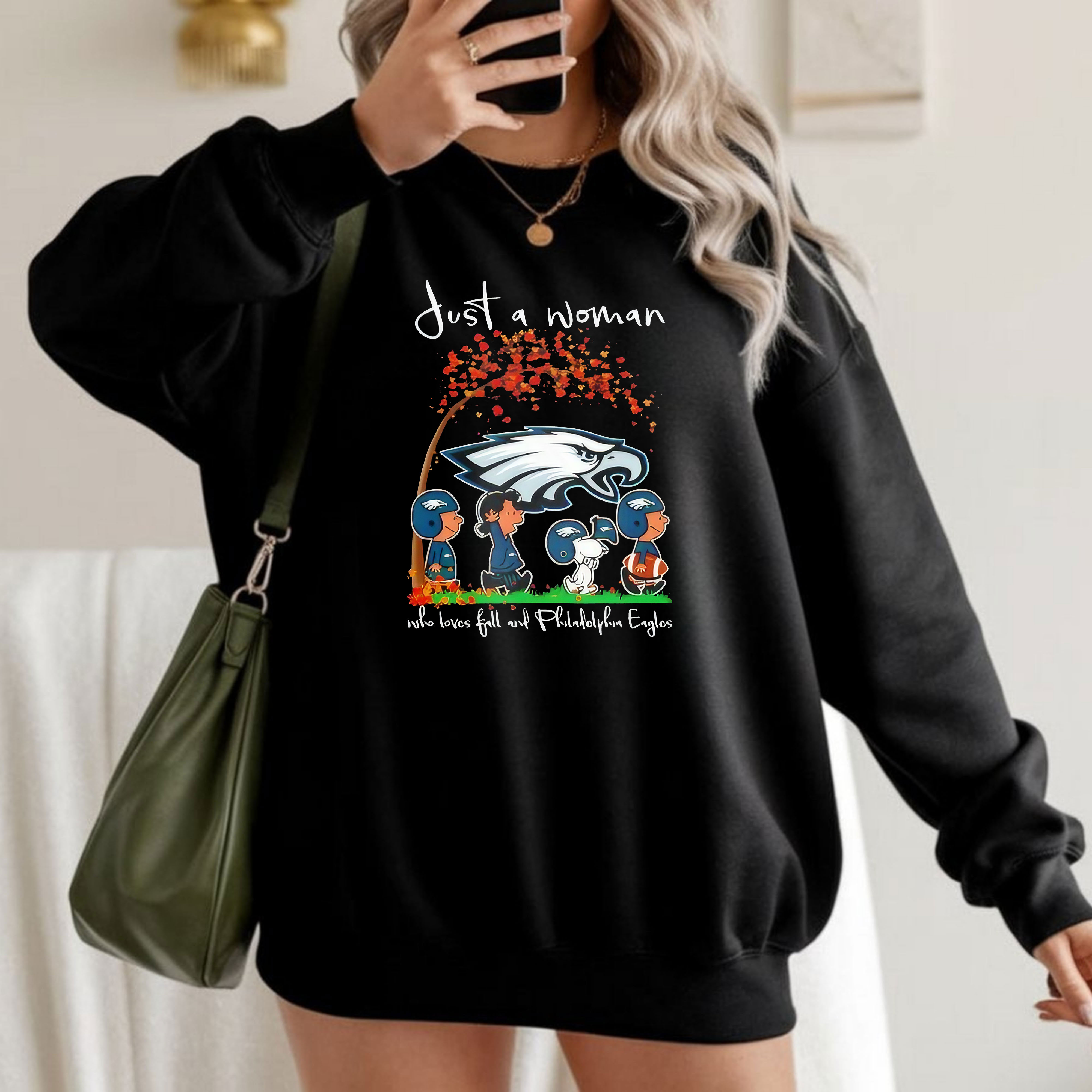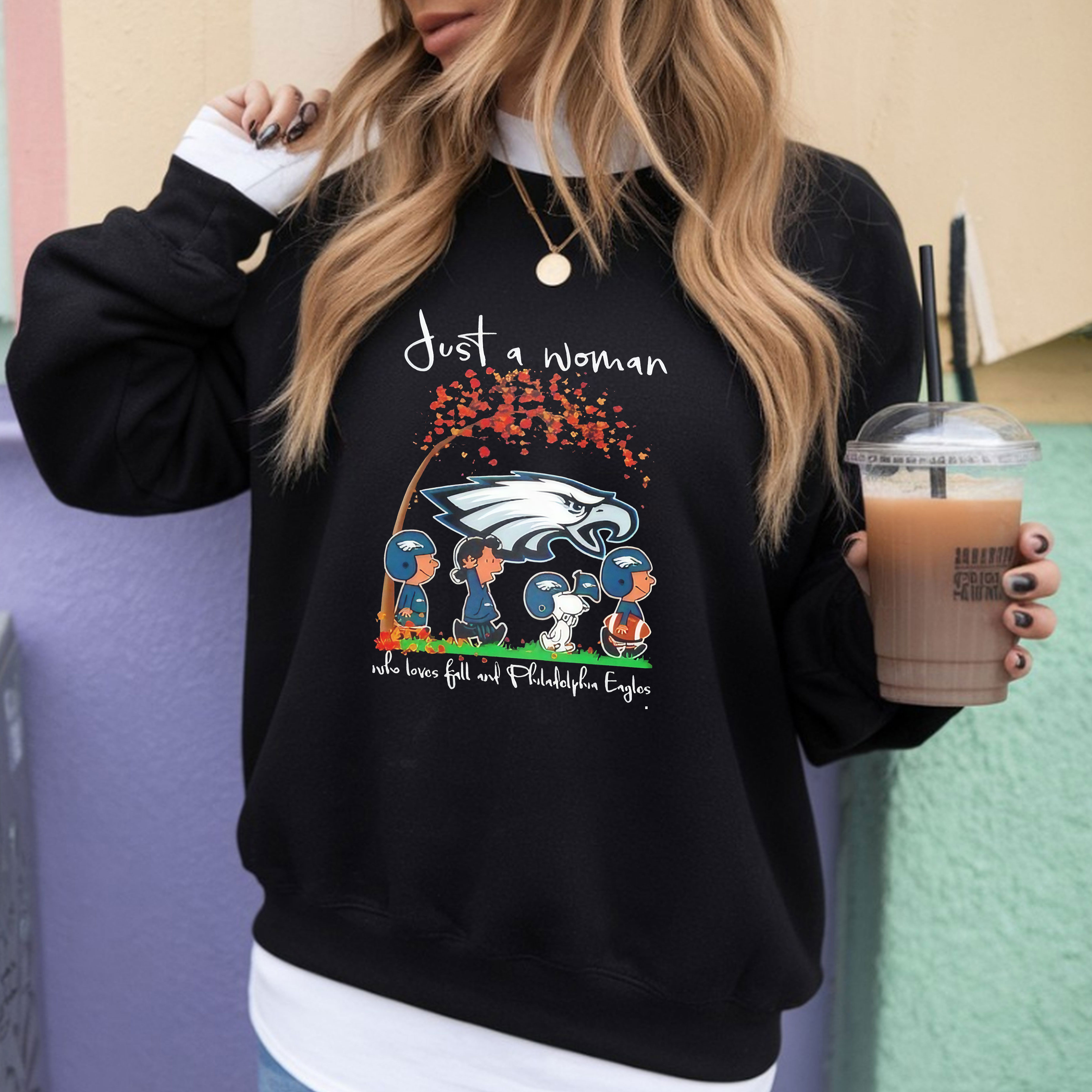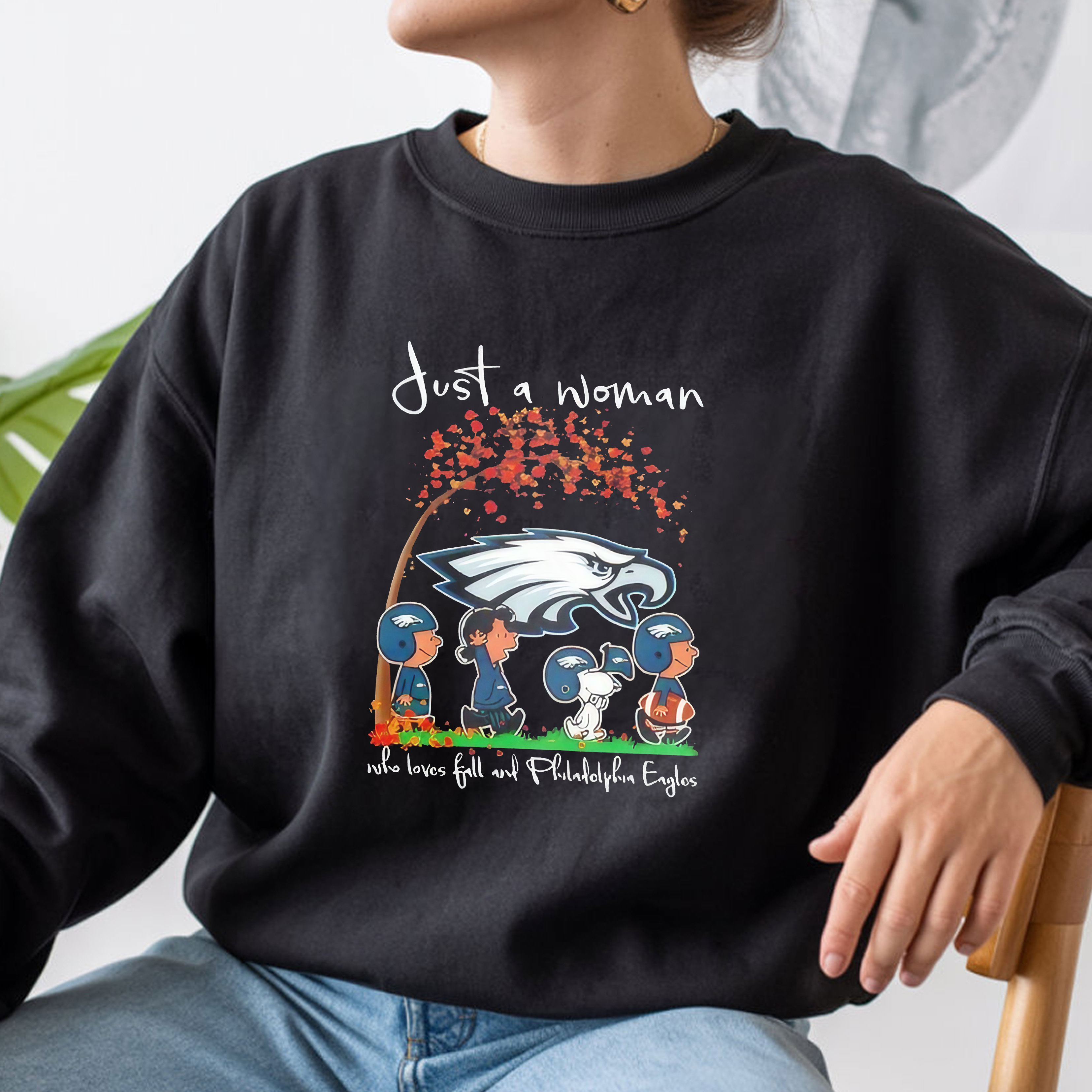 Peanuts Just a Woman Who Loves Fall and Philadelphia Eagles Team Happy Fall NFL Football Autumn Vintage Bootleg Seasonal Apparel – T-Shirt, Hoodie & Sweatshirt