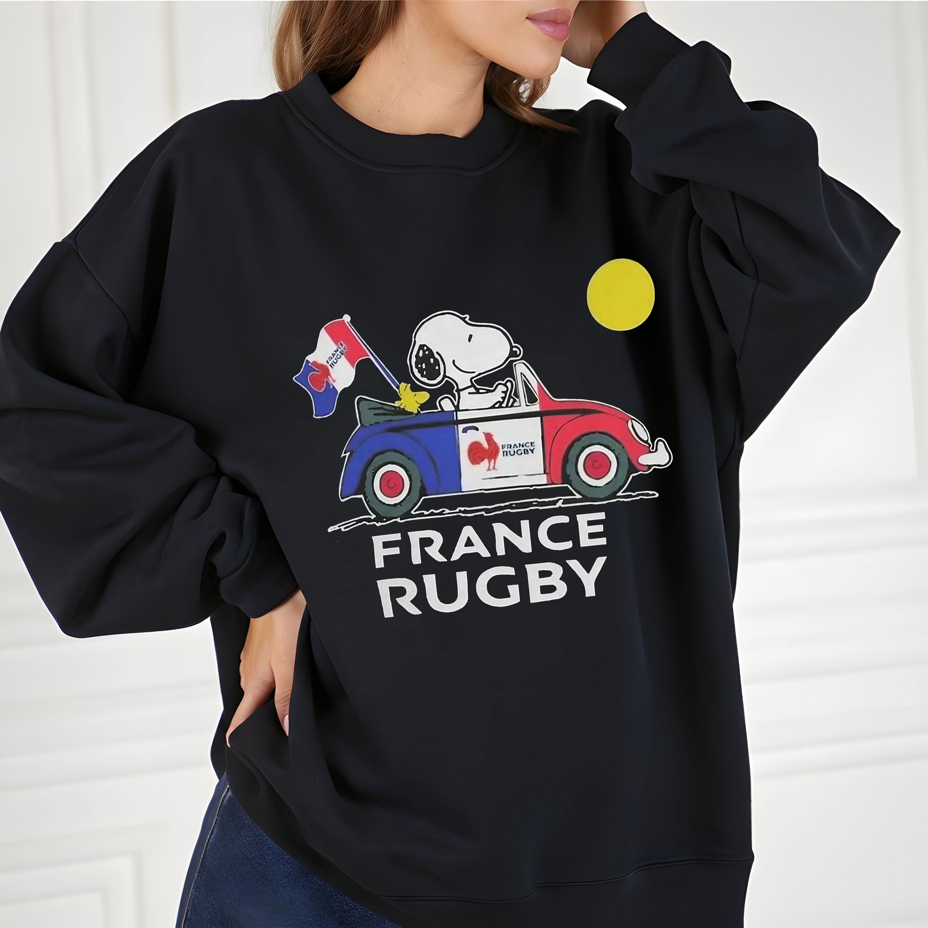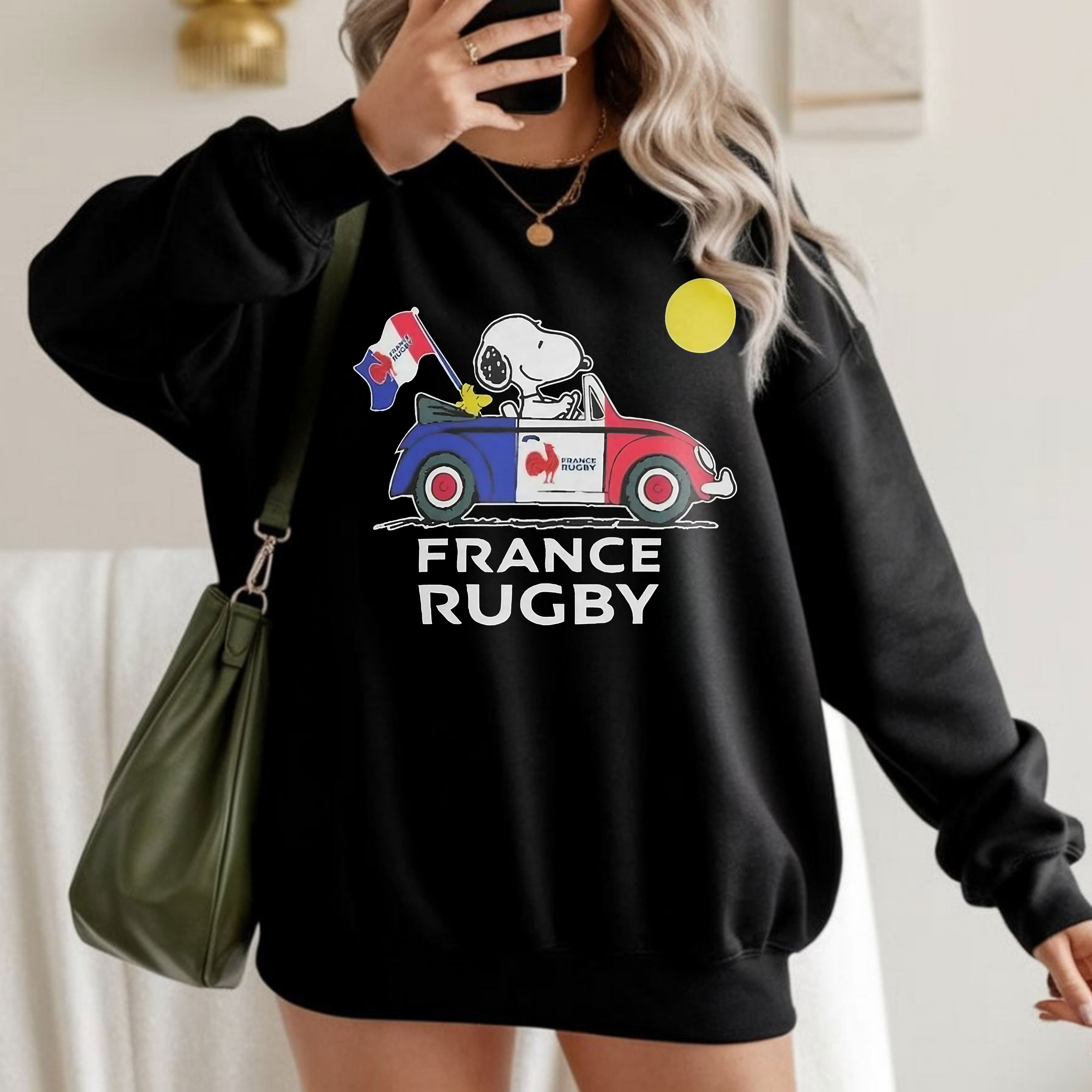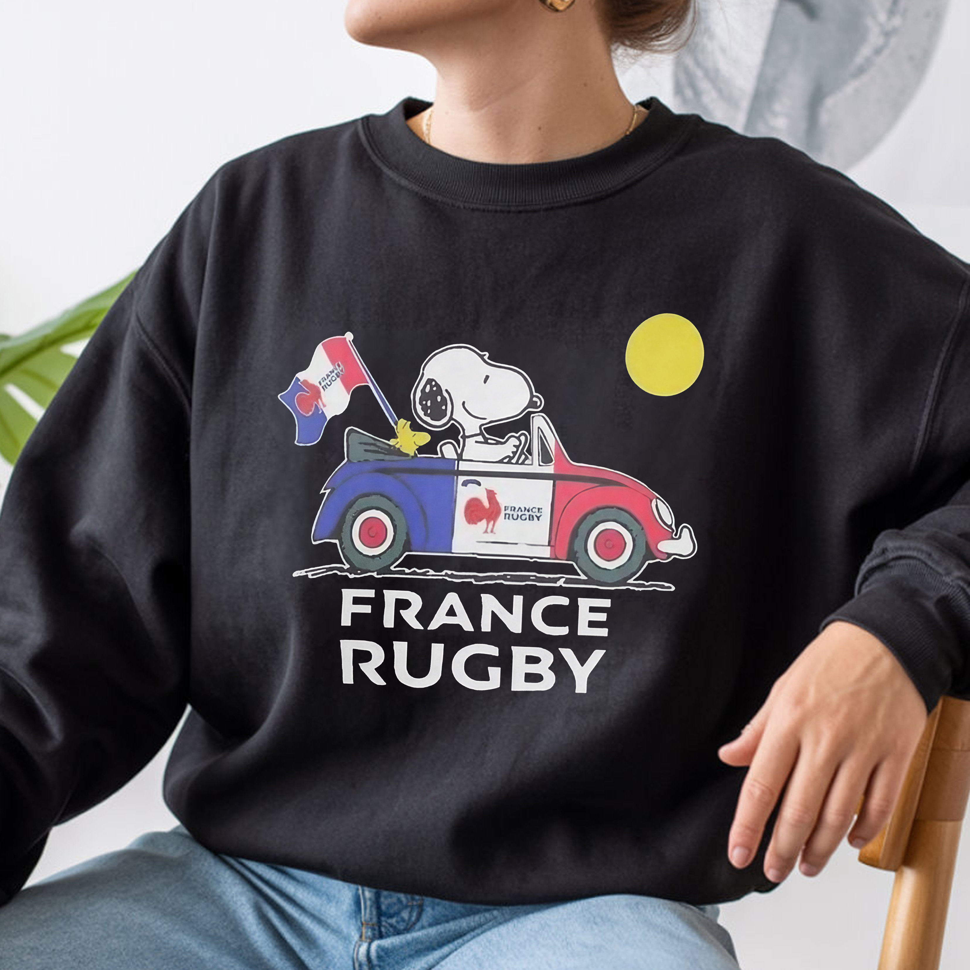 Peanuts Snoopy and Woodstock France Rugby On Car 2023 World Cup Sports Vintage Bootleg French Pride Apparel – T-Shirt, Hoodie & Sweatshirt