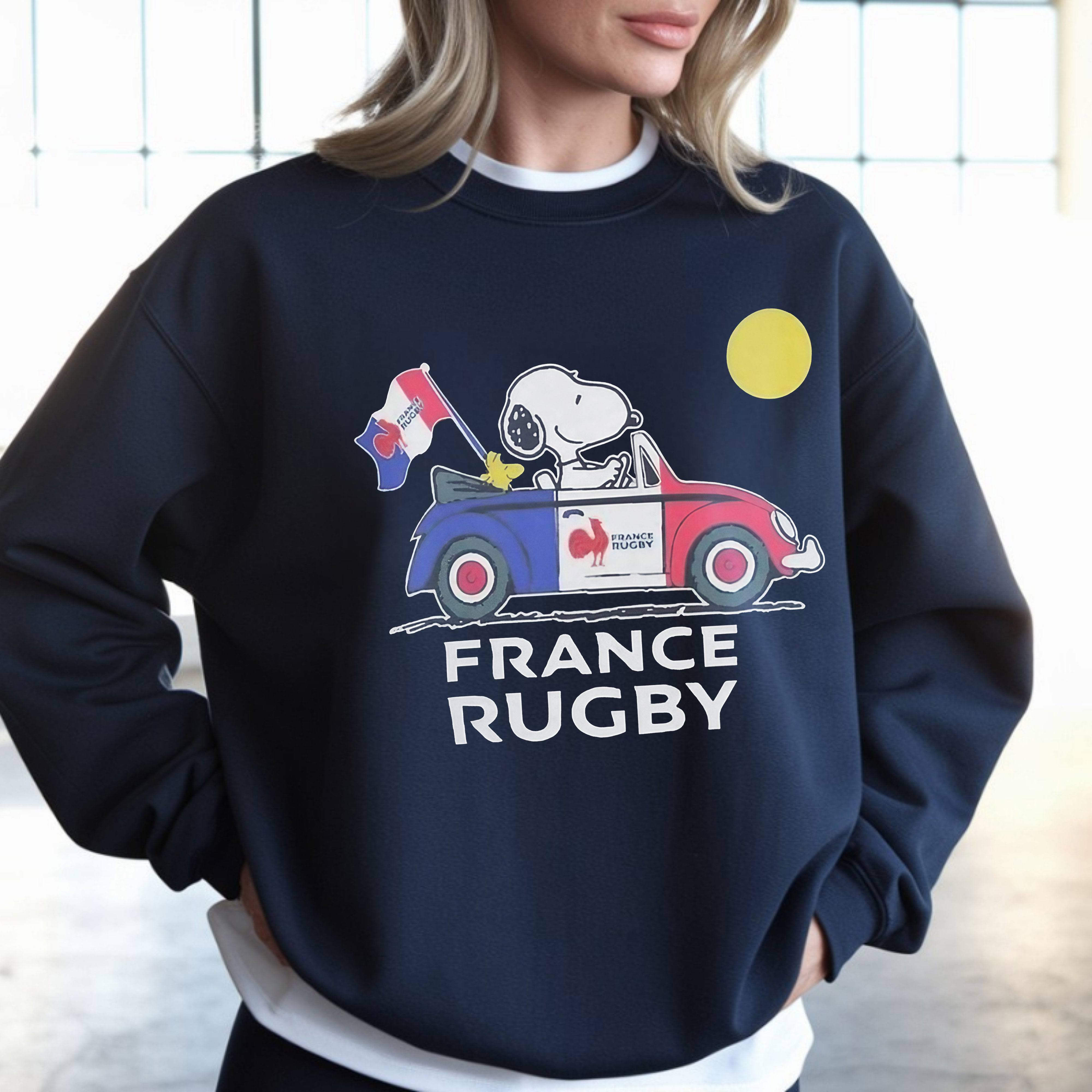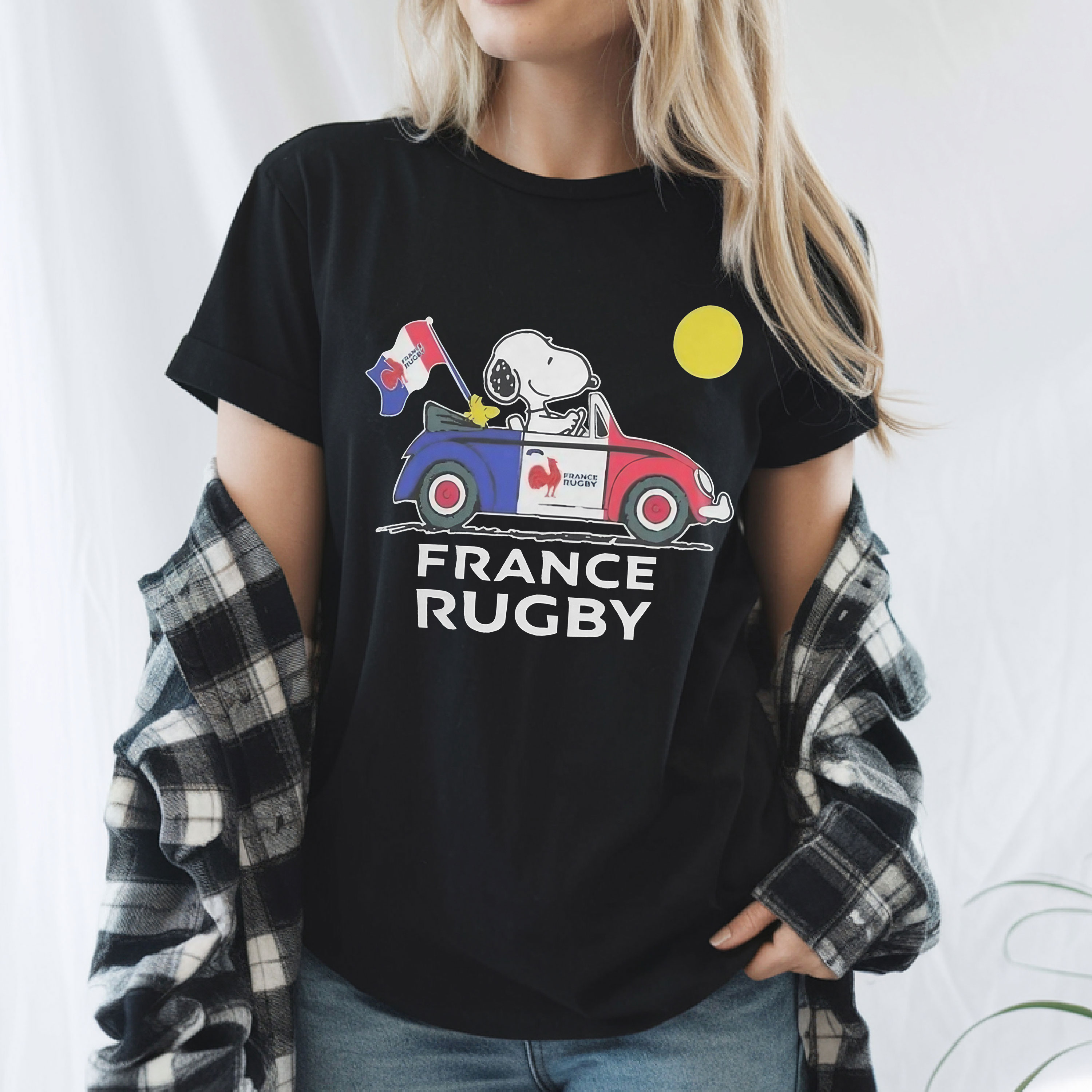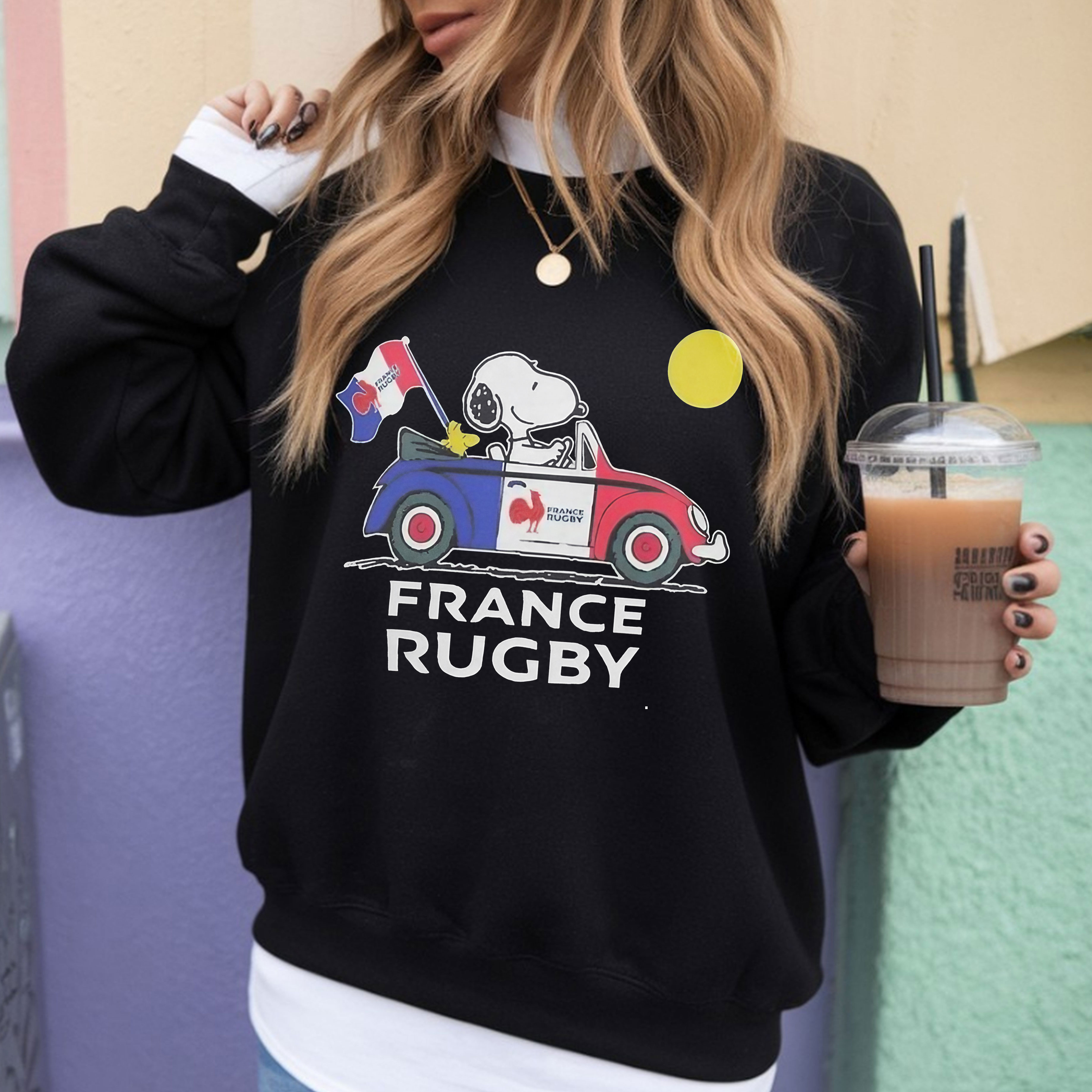 Peanuts Snoopy and Woodstock France Rugby On Car 2023 World Cup Sports Vintage Bootleg French Pride Apparel – T-Shirt, Hoodie & Sweatshirt