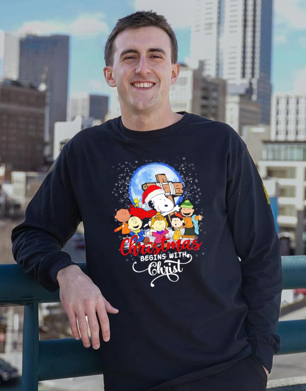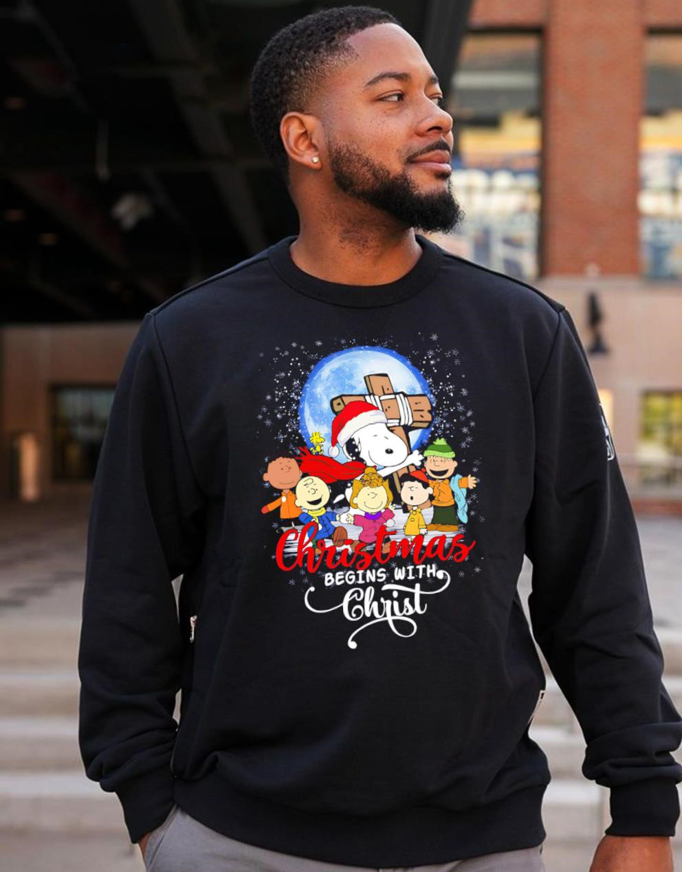 Peanuts Snoopy Christmas T-Shirt – Cute Peanuts Characters Christmas Begins With Christ Vintage Bootleg Holiday Tee