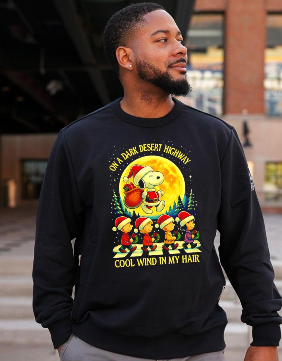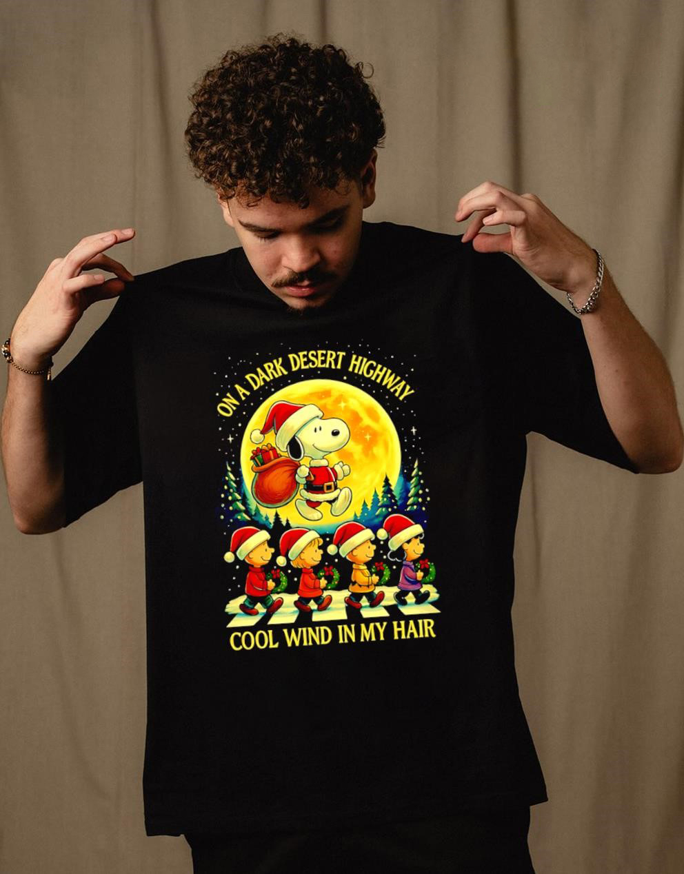 Peanuts Snoopy Christmas T-Shirt – On a Dark Desert Highway Cool Wind in My Hair Abbey Road Holiday Vintage Bootleg Tee