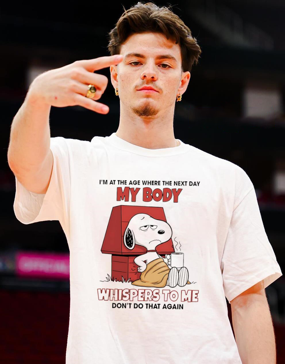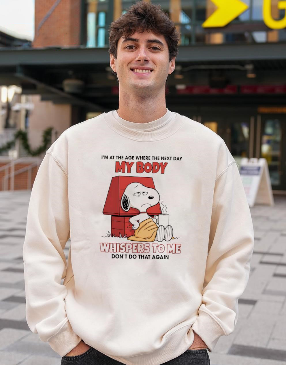 Peanuts Snoopy T-Shirt – Funny I’m At The Age Where My Body Whispers Don’t Do That Again Vintage Bootleg Aging Humor Tee