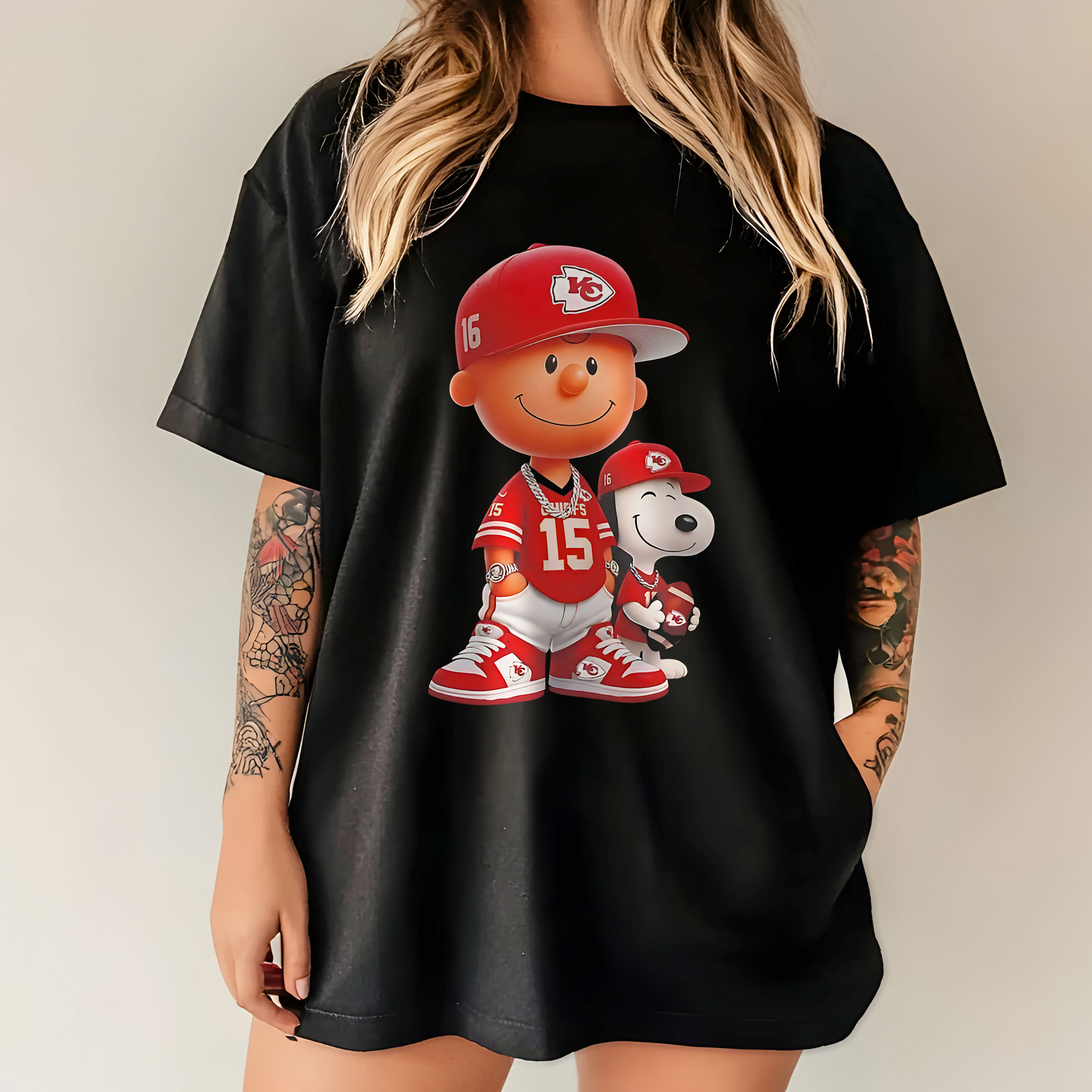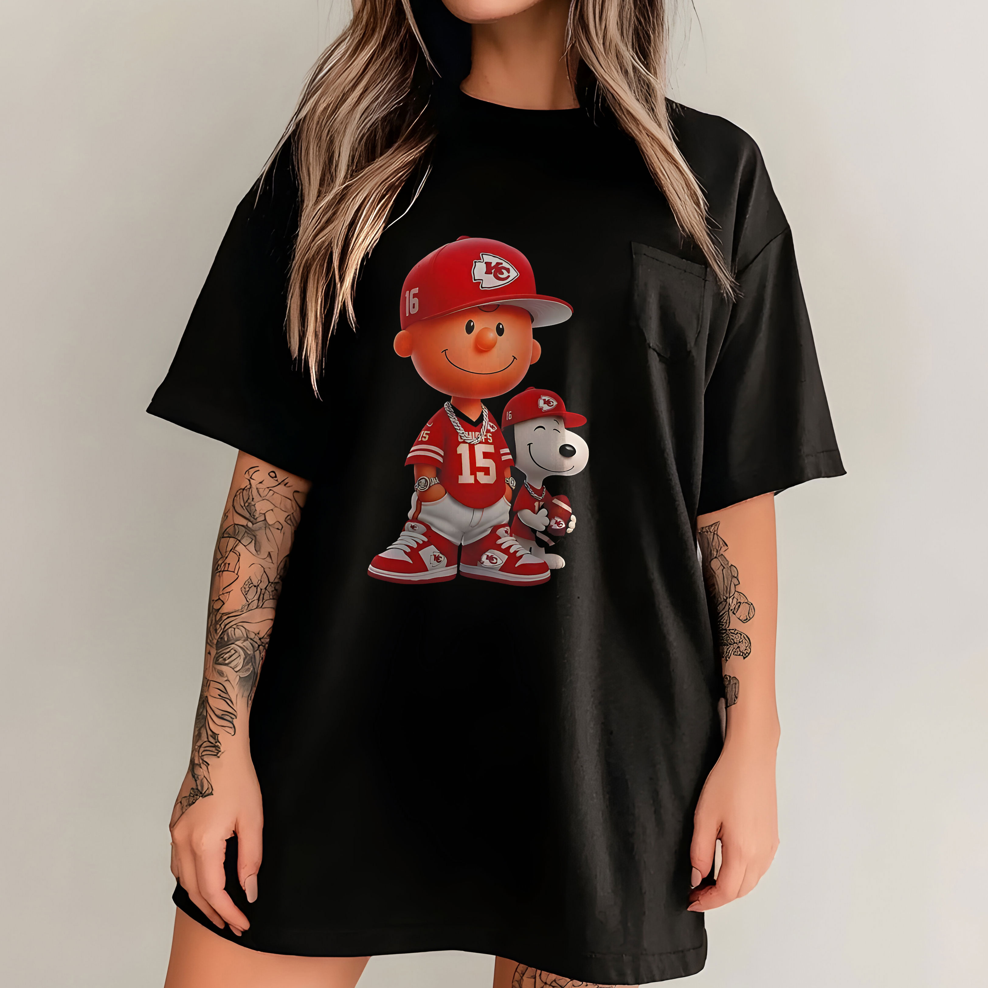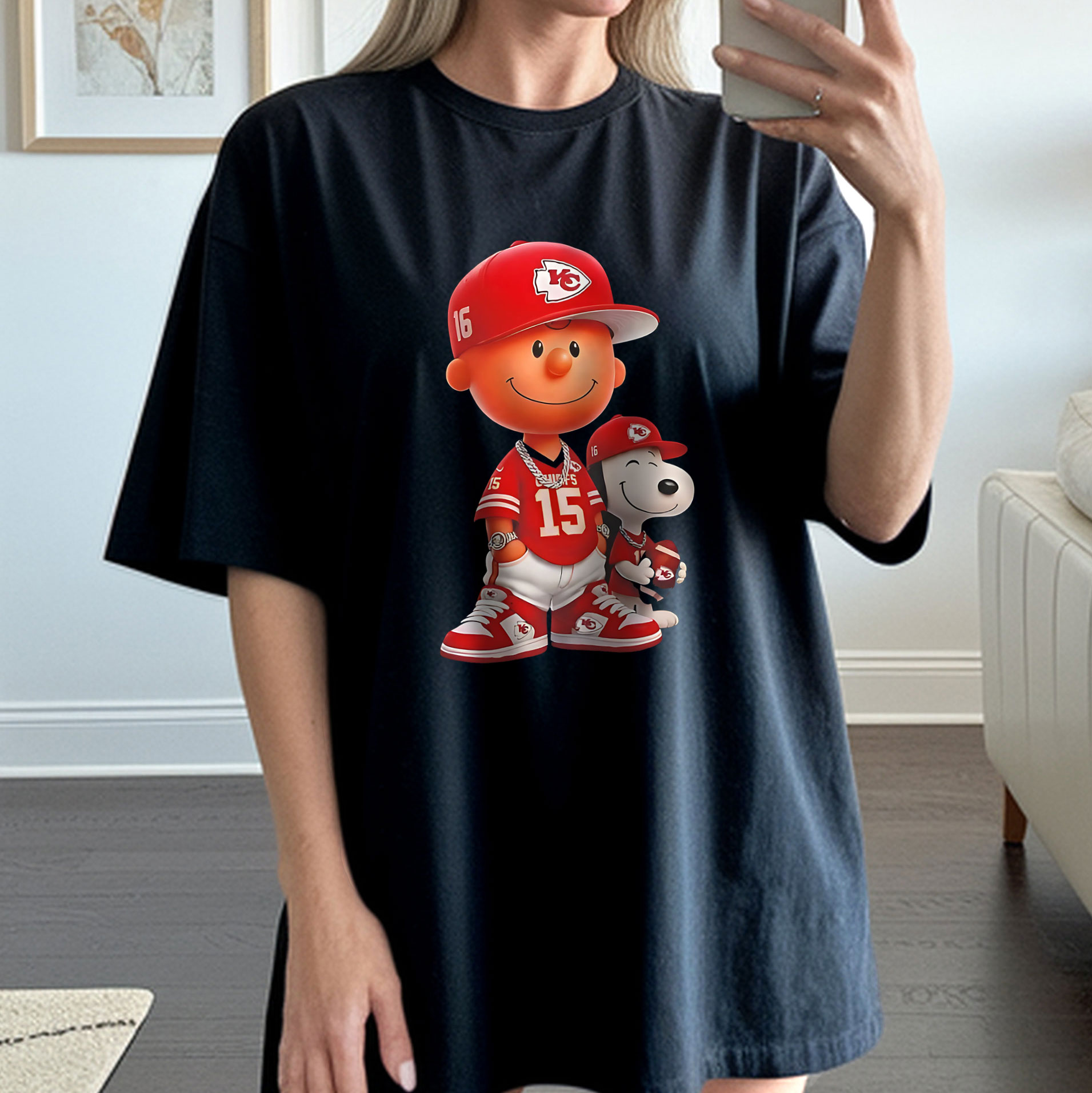 Snoopy and Charlie Brown Kansas City Chiefs Patrick Mahomes Style Red Outfit NFL Football Cartoon Fan Apparel – T-Shirt, Hoodie & Sweatshirt