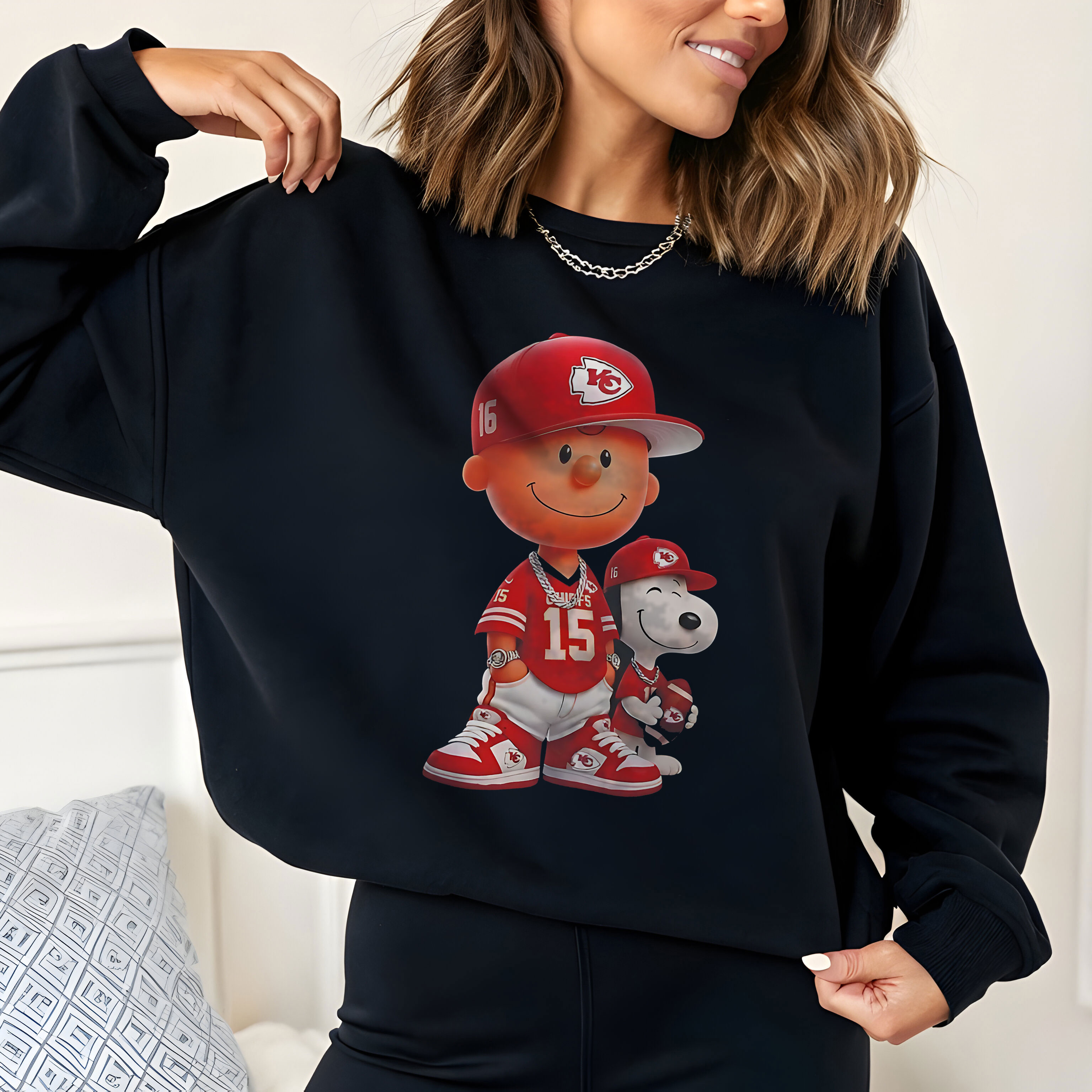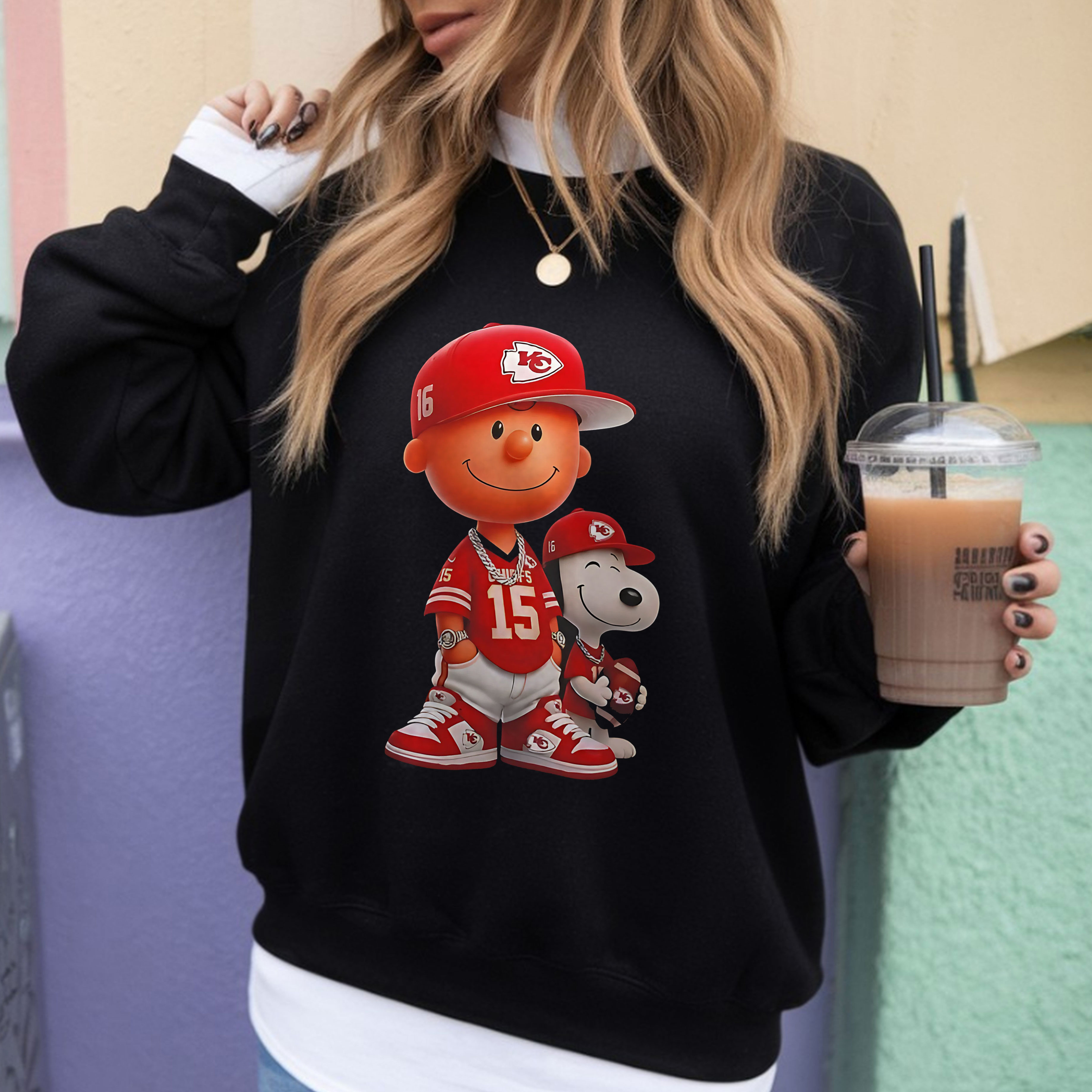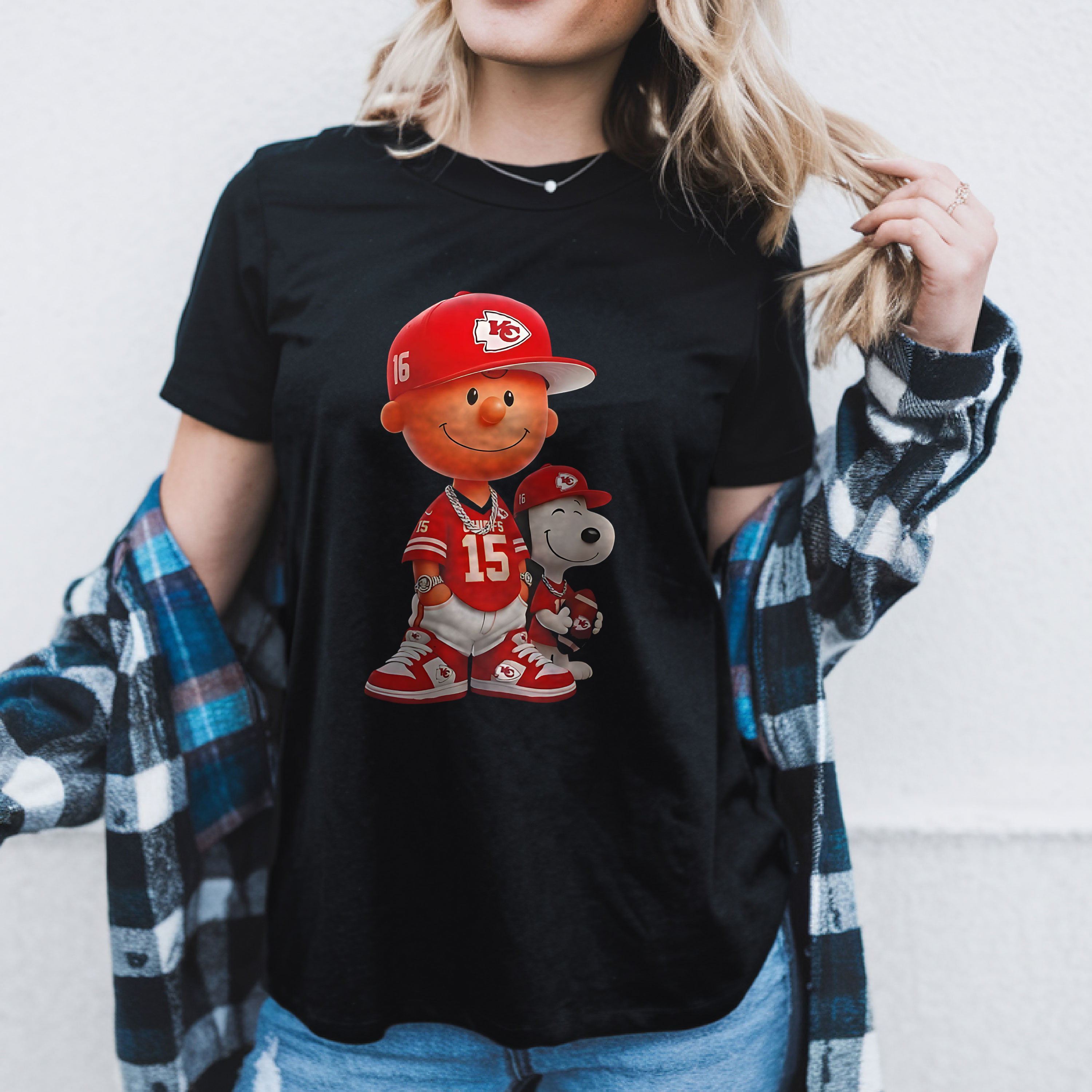 Snoopy and Charlie Brown Kansas City Chiefs Patrick Mahomes Style Red Outfit NFL Football Cartoon Fan Apparel – T-Shirt, Hoodie & Sweatshirt