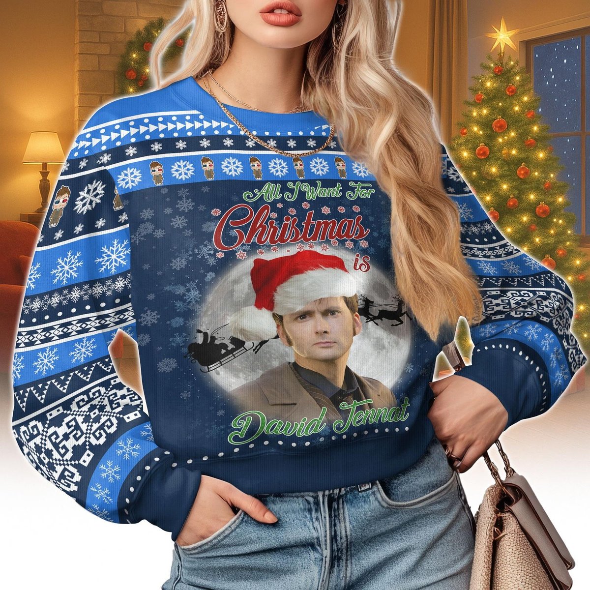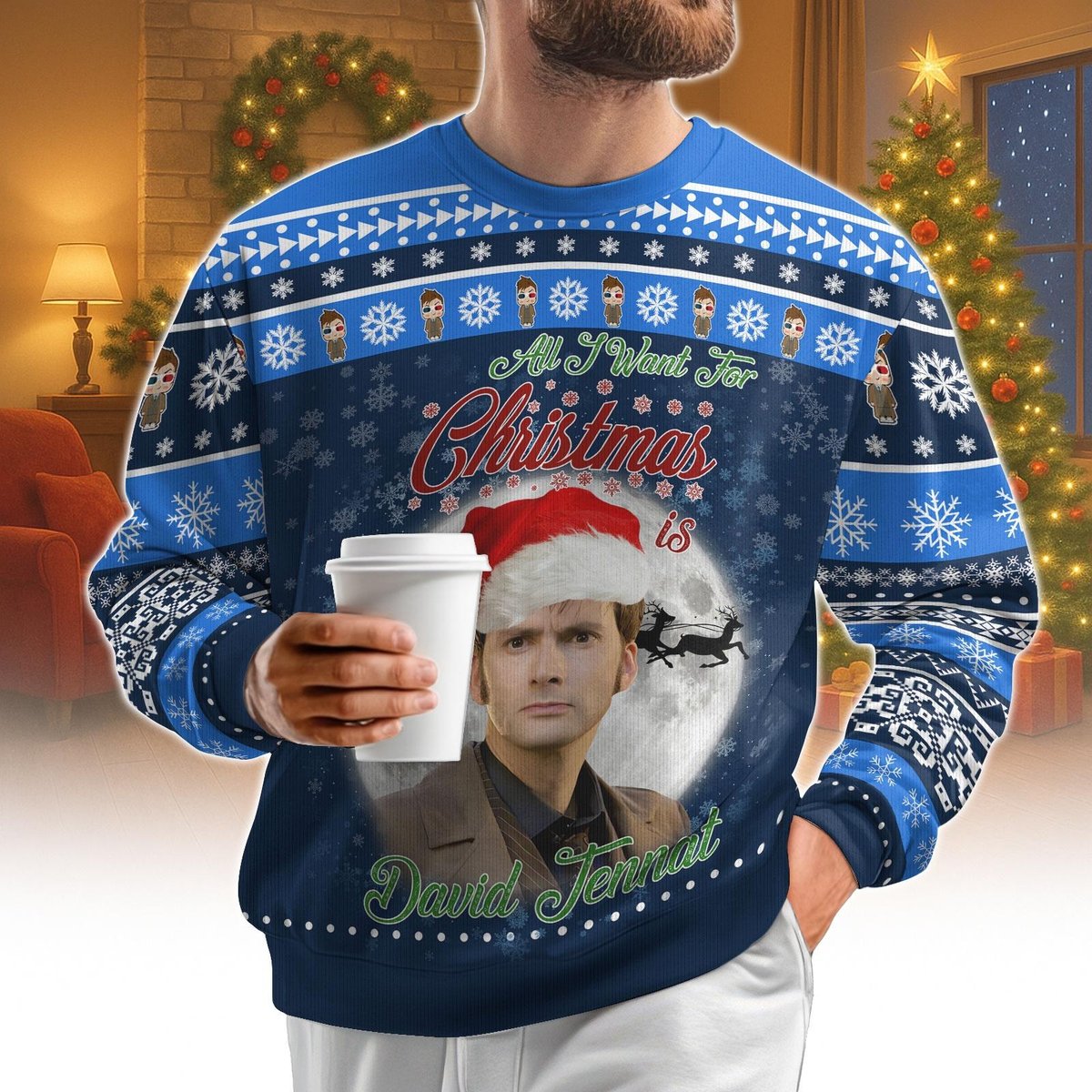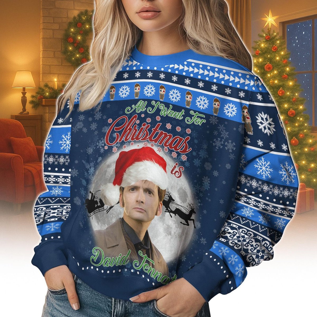 Doctor Who David Tennant All I Want For Christmas Ugly Sweater Blue Holiday Jumper