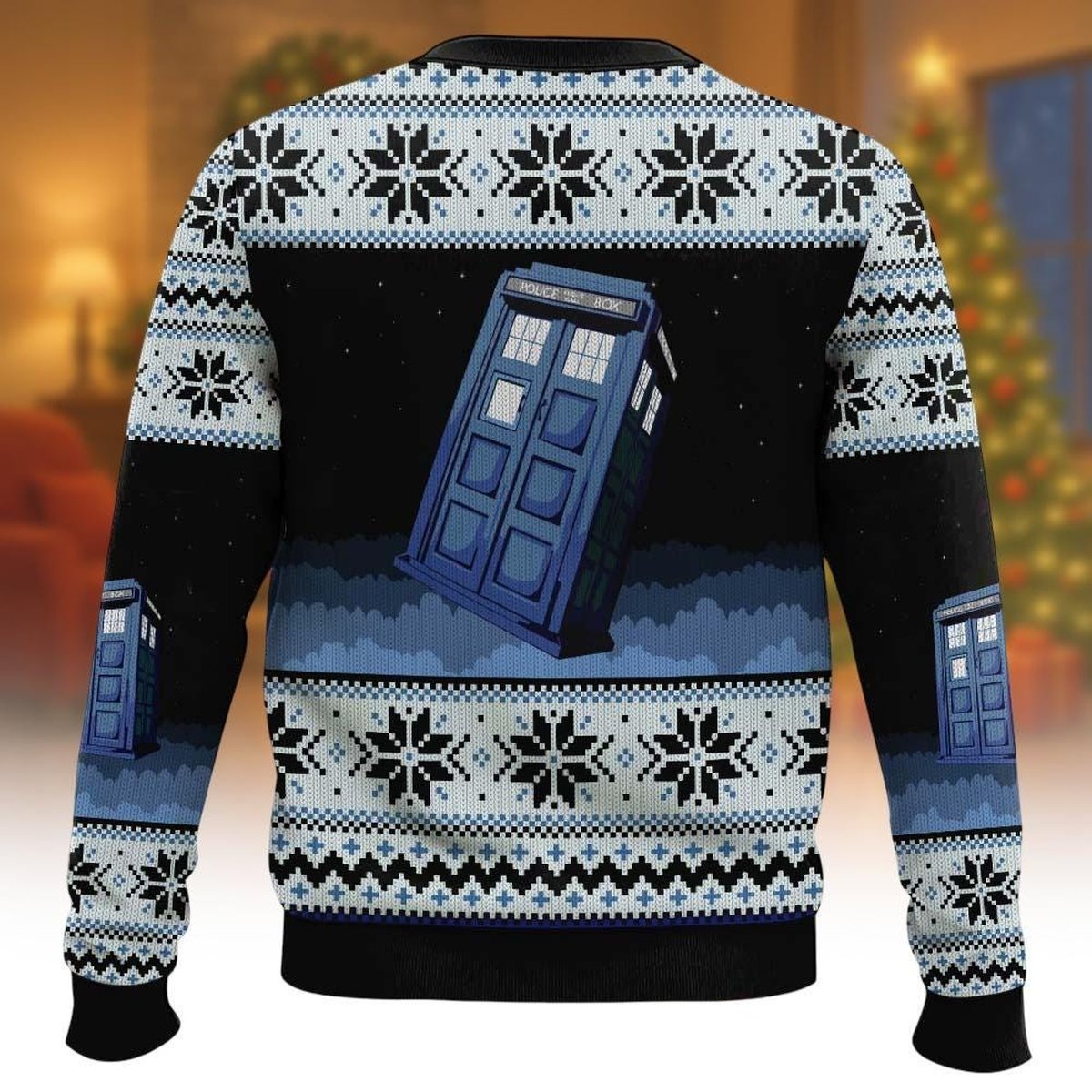 Doctor Who Tardis In Space Ugly Christmas Sweater Blue Snowflake Holiday Knit Jumper