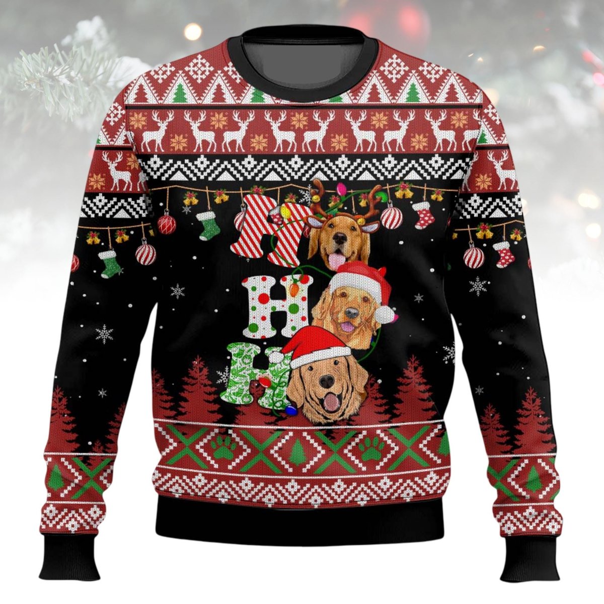Golden Retriever Dog Lover Ho Ho Ho Ugly Christmas Sweater Black Red Jumper