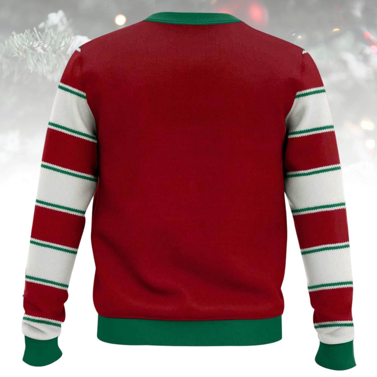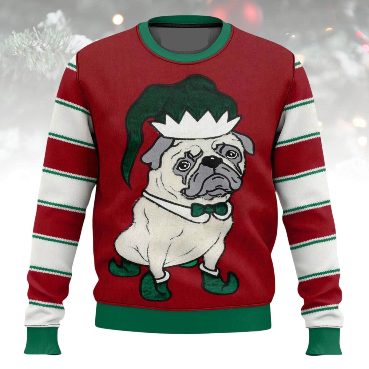 Pug Dog Elf Funny Ugly Christmas Sweater Red Green Striped Holiday Jumper