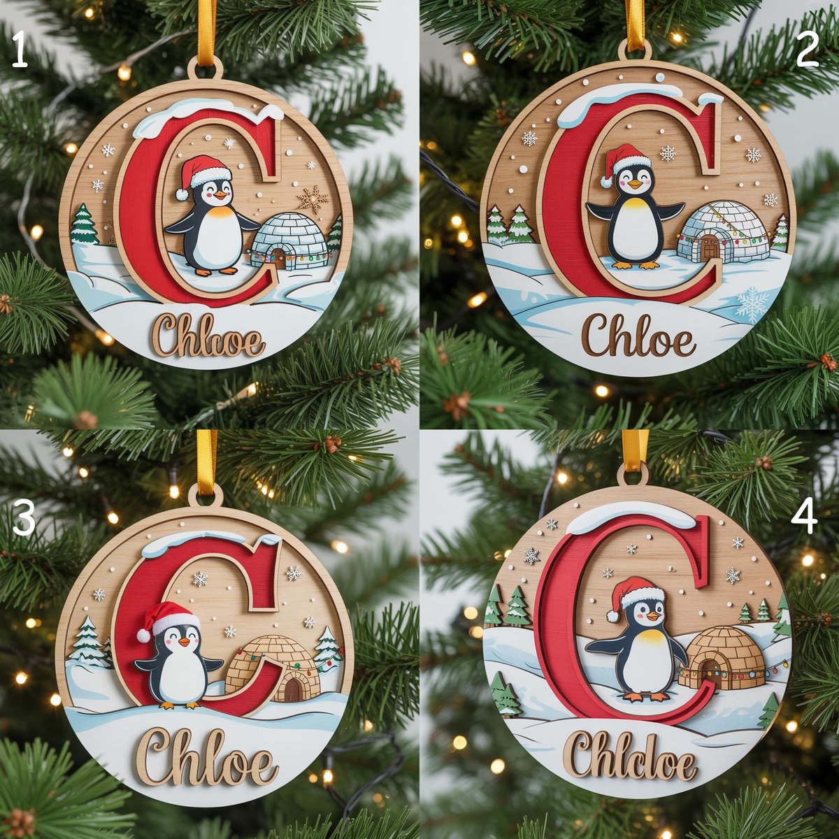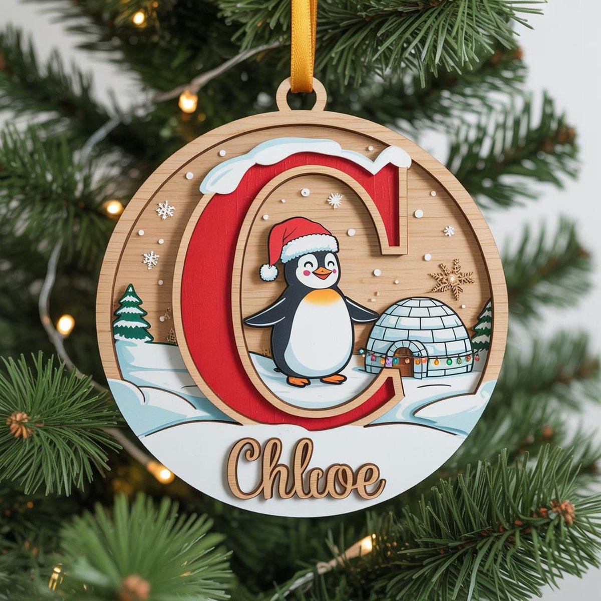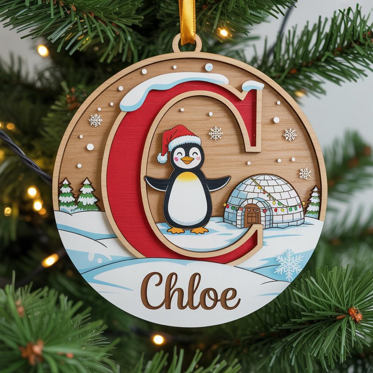 Personalized Penguin Initial Ornament Custom Wooden Christmas Ornament with Name Winter Igloo Decoration Kids Holiday Tree Gift