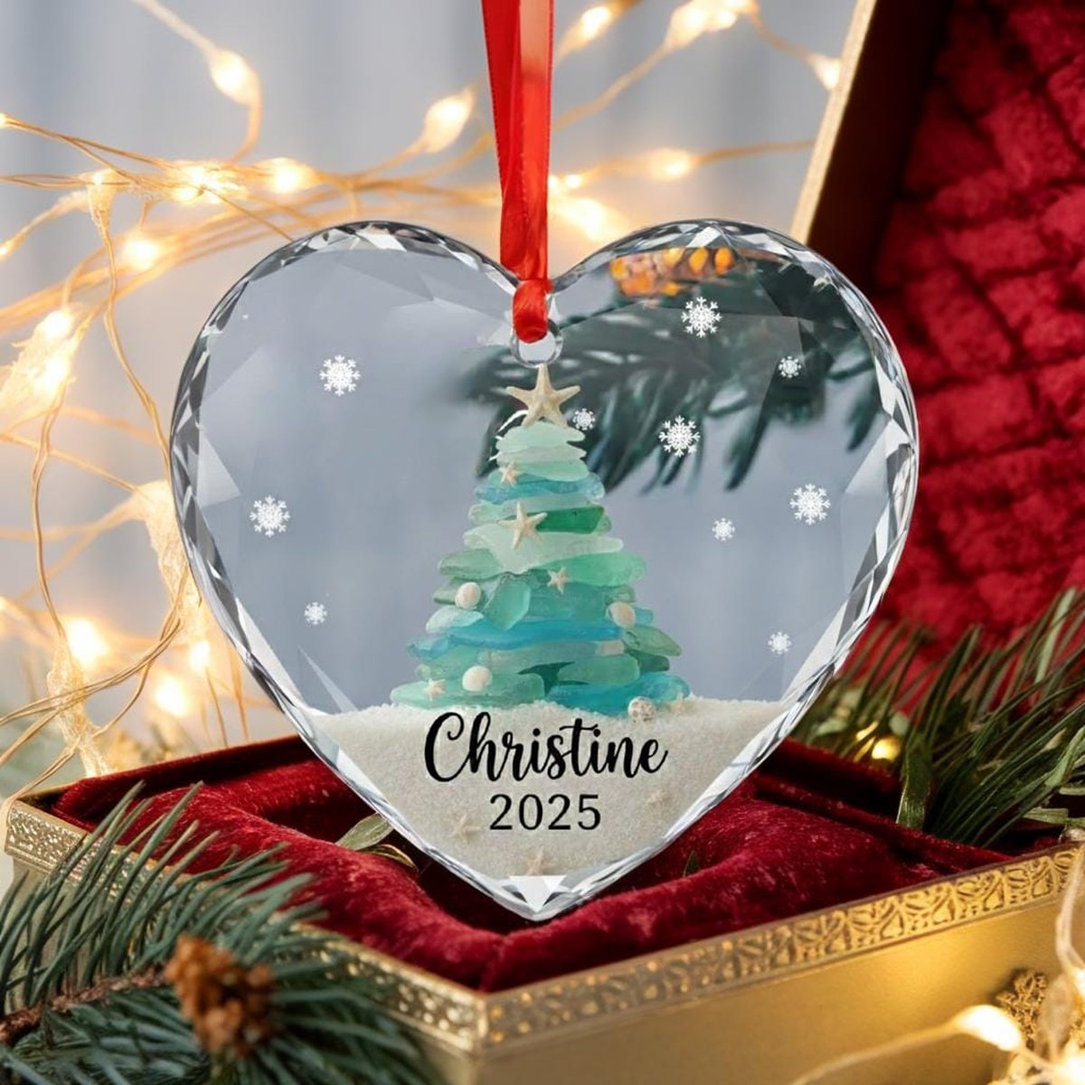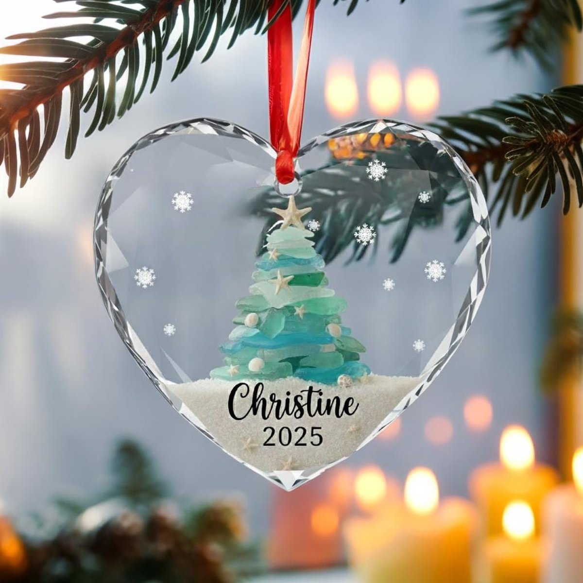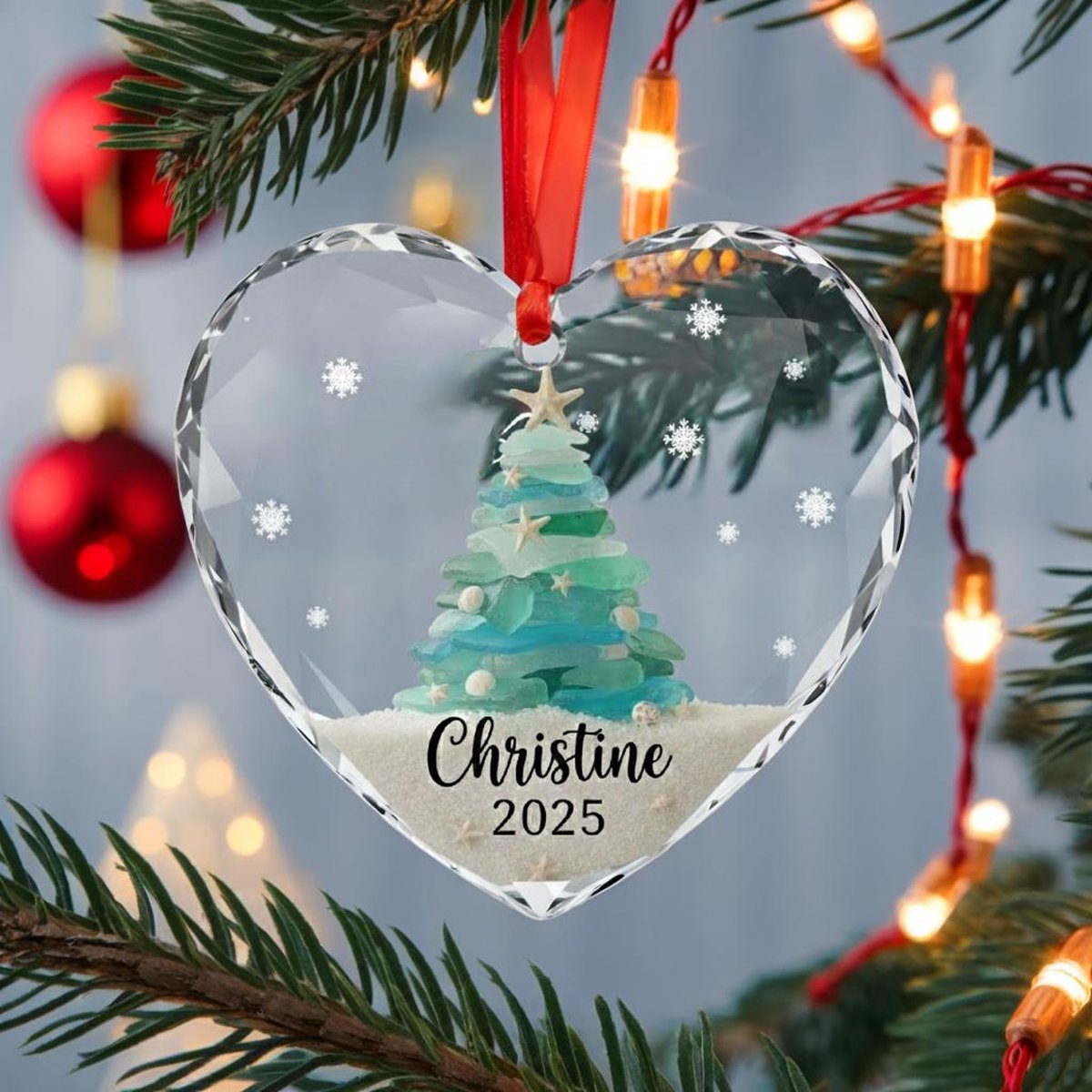 Personalized Sea Glass Christmas Tree Glass Ornament Beach Ocean Lover Gift Coastal Ornament Christmas Tree With Shells Starfish Ornament