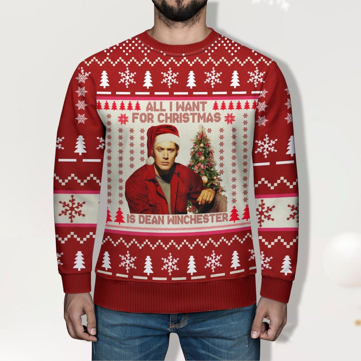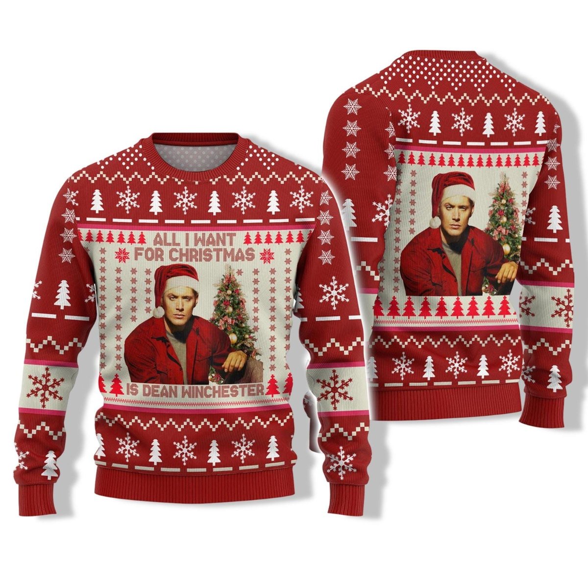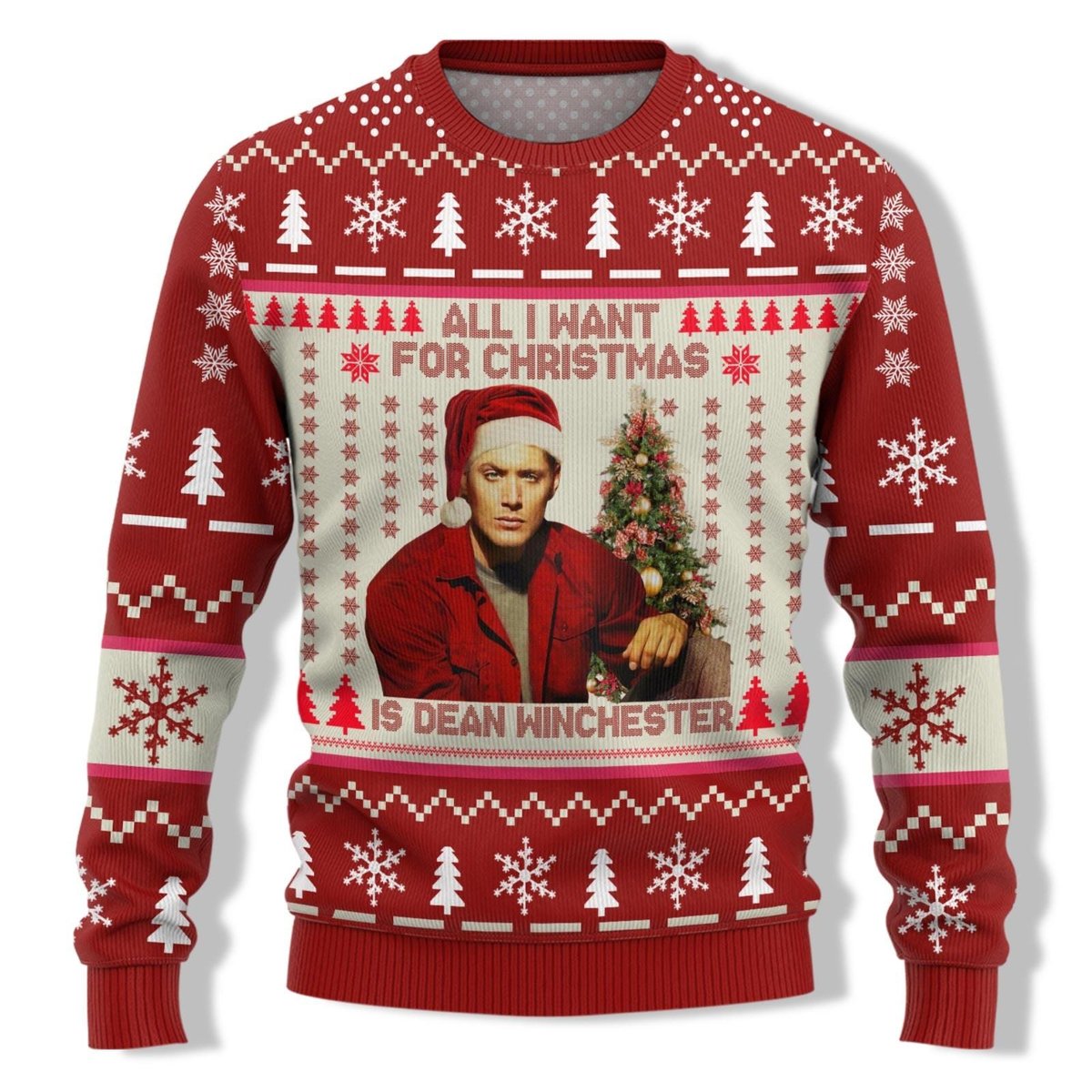Dean Winchester All I Want For Christmas Ugly Sweater Supernatural Holiday Red Knit Jumper